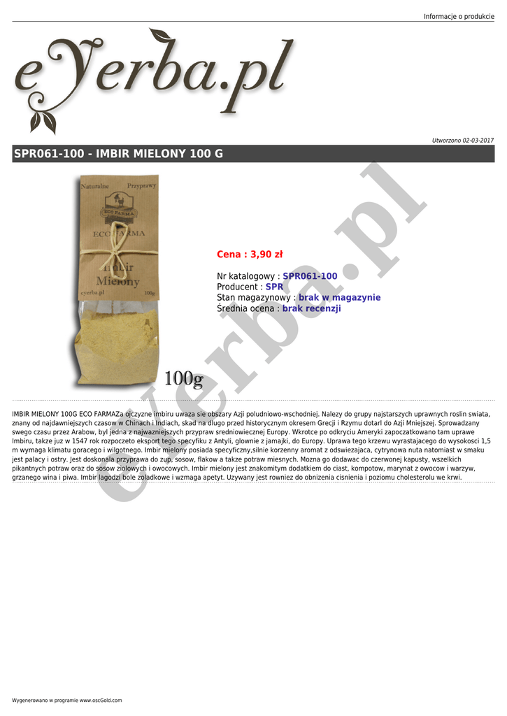 Informacje o produkcie Utworzono 02-03-2017 a. pl SPR061-100 - IMBIR MIELONY 100 G Cena : 3,90 zł er b Nr katalogowy : SPR061-100 Producent : SPR Stan magazynowy : brak w magazynie Średnia ocena : brak recenzji eY IMBIR MIELONY 100G ECO FARMAZa ojczyzne imbiru uwaza sie obszary Azji poludniowo-wschodniej. Nalezy do grupy najstarszych uprawnych roslin swiata, znany od najdawniejszych czasow w Chinach i Indiach, skad na dlugo przed historycznym okresem Grecji i Rzymu dotarl do Azji Mniejszej. Sprowadzany swego czasu przez Arabow, byl jedna z najwazniejszych przypraw sredniowiecznej Europy. Wkrotce po odkryciu Ameryki zapoczatkowano tam uprawe Imbiru, takze juz w 1547 rok rozpoczeto eksport tego specyfiku z Antyli, glownie z jamajki, do Europy. Uprawa tego krzewu wyrastajacego do wysokosci 1,5 m wymaga klimatu goracego i wilgotnego. Imbir mielony posiada specyficzny,silnie korzenny aromat z odswiezajaca, cytrynowa nuta natomiast w smaku jest palacy i ostry. Jest doskonala przyprawa do zup, sosow, flakow a takze potraw miesnych. Mozna go dodawac do czerwonej kapusty, wszelkich pikantnych potraw oraz do sosow ziolowych i owocowych. Imbir mielony jest znakomitym dodatkiem do ciast, kompotow, marynat z owocow i warzyw, grzanego wina i piwa. Imbir lagodzi bole zoladkowe i wzmaga apetyt. Uzywany jest rowniez do obnizenia cisnienia i poziomu cholesterolu we krwi. Wygenerowano w programie www.oscGold.com
