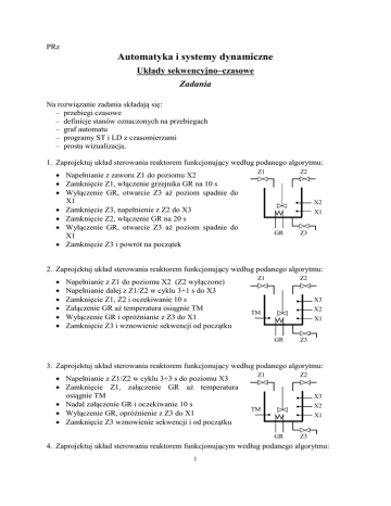 PRz Automatyka i systemy dynamiczne Układy sekwencyjno–czasowe Zadania Na rozwiązanie zadania składają się: – przebiegi czasowe – definicje stanów oznaczonych na przebiegach – graf automatu – programy ST i LD z czasomierzami – prosta wizualizacja. 1. Zaprojektuj układ sterowania reaktorem funkcjonujący według podanego algorytmu: Napełnianie z zaworu Z1 do poziomu X2 Zamknięcie Z1, włączenie grzejnika GR na 10 s Wyłączenie GR, otwarcie Z3 aż poziom spadnie do X1 Zamknięcie Z3, napełnienie z Z2 do X3 Zamknięcie Z2, włączenie GR na 20 s Wyłączenie GR, otwarcie Z3 aż poziom spadnie do X1 Zamknięcie Z3 i powrót na początek Z1 Z2 X2 X1 GR Z3 2. Zaprojektuj układ sterowania reaktorem funkcjonujący według podanego algorytmu: Napełnianie z Z1 do poziomu X2 (Z2 wyłączone) Napełnianie dalej z Z1/Z2 w cyklu 3+1 s do X3 Zamknięcie Z1, Z2 i oczekiwanie 10 s Załączenie GR aż temperatura osiągnie TM Wyłączenie GR i opróżnianie z Z3 do X1 Zamknięcie Z3 i wznowienie sekwencji od początku Z1 Z2 X3 X2 TM X1 GR Z3 3. Zaprojektuj układ sterowania reaktorem funkcjonujący według podanego algorytmu: Napełnianie z Z1/Z2 w cyklu 3+3 s do poziomu X3 Zamknięcie Z1, załączenie GR aż temperatura osiągnie TM Nadal załączenie GR i oczekiwanie 10 s Wyłączenie GR, opróżnienie z Z3 do X1 Zamknięcie Z3 wznowienie sekwencji i od początku Z1 Z2 X3 X2 TM X1 GR Z3 4. Zaprojektuj układ sterowania reaktorem funkcjonującym według podanego algorytmu: 1 Napełnianie z Z1 do poziomu X3 (Z2 zamknięty) Zamknięcie Z1 i oczekiwanie 5 s Złączenie GR aż temperatura osiągnie TM Wyłączenie GR i wylewanie z Z3 w cyklu 4+2 s do X1 Zamknięcie Z3 i wznowienie sekwencji od początku Z1 Z2 X3 X2 TM X1 GR Z3 5. Sterowanie napełnianiem i podgrzewaniem Napełnianie na przemian zaworami Z1, Z2 w cyklu 5 + 3 sekundy do poziomu X2. Napełnianie dalej do poziomu X3 przez zawory Z1 + Z2. Zamknięcie Z1, Z2, włączenie grzejnika GR, aż temperatura osiągnie TM. Wyłączenie GR, opróżnienie zbiornika zaworem Z3 do poziomu X1. Zamknięcie Z3 i wznowienie sekwencji od początku. Z1 Z2 X3 X2 TM X1 GR Z3 6. Drzwi automatyczne Wejścia – fotokomórka (faktycznie jest to suma sygnałów z fotokomórek po lewej i prawej stronie) – wyłącznik krańcowy – drzwi otwarte – wyłącznik krańcowy – drzwi zamknięte Wyjścia – otwieranie drzwi (silnik) – zamykanie Jeżeli fotokomórka została przysłonięta, to drzwi otwierają się w pełni i pozostają otwarte przez 5 sekund, pomimo odsłonięcia fotokomórki. Potem drzwi się zamykają, chyba że fotokomórka znowu została przysłonięta. Wtedy czas odmierzany jest ponownie. 7. Piec centralnego ogrzewania W momencie, gdy temperatura w mieszkaniu spadła poniżej 1ºC od zadanej wartości włączana jest na 10 sekund pompa obiegowa, a po niej piec. Piec pozostaje włączony, aż temperatura przekroczy wartość zadaną. Wtedy piec jest wyłączany, ale pompa obiegowa pracuje jeszcze przez 20 sekund. Wejścia: – temperatura niższa o 1ºC od wartości zadanej, – temperatura wyższa od wartości zadanej. Wyjścia: – pompa, piec. 8. Lekki most 2 Lekki most służy wyłącznie do przejazdu jednego pojazdu (wtedy zakaz wjazdu po przeciwnej stronie). Przed mostem i za mostem znajdują się fotokomórki wykrywające pojazdy oraz sygnalizatory ze światłami zielonym i czerwonym. Pojazdy mogą tylko pojedynczo wjeżdżać na most. Następny pojazd może wjechać na most nie wcześniej niż 3 sekundy po tym, jak poprzedni zjechał. W przypadku, gdy pojazdy oczekują po obydwu stronach mostu należy je wpuszczać na zmianę. Pojazd, któremu zapaliło się zielone światło, musi wjechać na most w ciągu 5 sekund. Uwaga. Wystarczy program w ST. 9. Wózek Silnik przesuwa wózek w lewo lub w prawo (zależnie od biegunowości zasilania). W punktach A i B (rys.) znajdują się wyłączniki krańcowe. Naciśnięcie przycisku start (niestabilizowanego) powoduje dojazd wózka do punktu A (jeśli tam nie był), a potem jednorazowy przejazd z A do B i z powrotem. W czasie ruchu wózka pulsuje światło sygnalizacyjne. start A B 10. Automatyczny przejazd kolejowy Wejścia: a1, a2 – pociąg nad czujnikiem zbliżania b1, b2 – pociąg nad czujnikiem oddalania c – szlaban otwarty (wyłącznik krańcowy) d – szlaban zamknięty Wyjścia: u1 – opuszczać szlaban u2 – podnosić szlaban W czasie, gdy szlaban jest otwarty (lub otwierany) pulsuje światło sygnalizacyjne. a) u1 u2 c b1 a1 a2 b2 d 3 b) y2 y1 a PULSE p OR u1