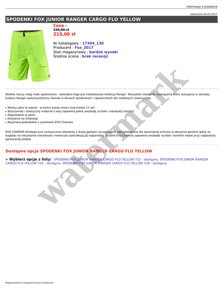 Informacje o produkcie Utworzono 02-03-2017 SPODENKI FOX JUNIOR RANGER CARGO FLO YELLOW Cena : 239,00 zł 215,00 zł er m ar k Nr katalogowy : 17304_130 Producent : Fox_2017 Stan magazynowy : bardzo wysoki Średnia ocena : brak recenzji Wielkie rzeczy mają małe opakowania - dowodem tego jest młodzieżowa kolekcja Ranger. Wszystkie niezwykłe rozwiązania które stosujemy w dorosłej kolekcji Ranger wykorzystaliśmy również w bluzach spodenkach i rękawiczkach dla młodszych rowerzystów. ● ● ● ● ● Wiemy jakie to ważne - w końcu każdy mistrz miał kiedyś 11 lat! Wytrzymały i elastyczny materiał 2-way zapewnia pełną swobodę ruchów i niezwykły komfort Regulowane w pasie Kieszenie na drobiazgi Wypinana podszewka z systemem EVO Chamois EVO CHAMOIS Strategicznie umieszczone elementy o dużej gęstości są specjalnie zaprojektowane dla optymalnej ochrony w obszarze górskim gdzie ze względu na nieustanne nierówności rowerzyści potrzebują jej najbardziej. System Evo Chamois zapewnia swobodę ruchów i komfort nawet przy najbardziej agresywnej jeździe Dostępne opcje SPODENKI FOX JUNIOR RANGER CARGO FLO YELLOW » Wybierz opcje z listy: SPODENKI FOX JUNIOR RANGER CARGO FLO YELLOW Y22 - dostępny, SPODENKI FOX JUNIOR RANGER w at CARGO FLO YELLOW Y24 - dostępny, SPODENKI FOX JUNIOR RANGER CARGO FLO YELLOW Y26 - dostępny. Wygenerowano w programie www.oscGold.com