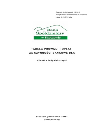 Załącznik do Uchwały Nr 159/2016 Zarządu Banku Spółdzielczego w Skoczowie z dnia 13.10.2016 roku TA B E L A P R O W I Z J I I O P Ł AT Z A CZYNNOŚCI B AN KOW E DL A K l i e n t ów I n d yw i d u a l n y c h S k o c z ó w , p a ź d z i e r n i k 2 0 1 6 r. (tekst jednolity) Zakres operacji i usług bankowych przedstawionych w „Tabeli prowizji i opłat za czynności bankowe dla Klientów Indywidualnych ” zwanej dalej Tabelą dotyczy: osób fizycznych nie prowadzących działalności gospodarczej – rezydentów i nierezydentów oraz Pracowniczych Kas Zapomogowo Pożyczkowych (PKZP), Szkolnych Kas Oszczędnościowych (SKO). Zasady pobierania opłat i prowizji bankowych 1. 2. 3. 4. 5. 6. 7. 8. 9. 10. 11. 12. 13. 14. 15. 16. 17. Opłaty i prowizje od posiadaczy rachunków bankowych w Banku Spółdzielczym pobierane są z tych rachunków w dniu dokonania operacji bankowej lub wpłacane w gotówce w kasie . Opłaty i prowizje za usługi o charakterze cyklicznym lub ciągłym, realizowane na zlecenie posiadacza rachunku prowadzonego w Banku Spółdzielczym mogą być pobierane okresowo w terminach uzgodnionych z posiadaczem rachunku, nie rzadziej jednak niż raz w kwartale. Od pozostałych klientów opłaty i prowizje pobierane są w gotówce w kasach Banku Spółdzielczego w dniu dokonania operacji bankowej . Pobrane opłaty i prowizje nie podlegają zwrotowi w przypadku odstąpienia od transakcji lub ich anulowania z przyczyn, za które Bank Spółdzielczy nie ponosi odpowiedzialności (z wyłączeniem prowizji za udzielenie kredytu konsumenckiego). Wszelkie opłaty i prowizje bankowe pokrywa zleceniodawca operacji chyba, że zawarte umowy stanowią inaczej. Obowiązek ustalania poprawnej wysokości opłaty i prowizji od wpłat i wypłat gotówkowych oraz ich pobrania obciąża pracownika przyjmującego dowód wpłaty lub dokument wypłaty od klienta. Fakt pobrania prowizji odnotowuje się na wszystkich odcinkach dowodu tylko w przypadku gdy prowizja pobierana jest kasowo. Kwoty pobieranych prowizji i opłat podlegają zaokrągleniu do jednego grosza na zasadach ogólnych. Dotyczy to również kwot prowizji i opłat pobieranych w PLN od operacji dokonywanych w obrocie dewizowym . Kwoty pobierane w walucie obcej zaokrąglane są wg analogicznych zasad. Nie pobiera się prowizji i opłat od: 1) wpłat i wypłat na rachunki terminowych lokat oszczędnościowych, rachunków oszczędnościoworozliczeniowych oraz rachunków oszczędnościowych, o ile Tabela nie przewiduje inaczej; 2) wpłat na poczet spłat odsetek i kredytów oraz innych zobowiązań zaciągniętych w Banku Spółdzielczym oraz wypłat kredytów realizowanych w gotówce ; 3) wpłat na cele społeczno-użyteczne na rzecz organizacji i fundacji, oraz których wniesienie upoważnia ofiarodawcę na mocy przepisów szczególnych do uzyskania ulgi w podatku dochodowym; 4) wpłat na rachunki bankowe w przypadku, gdy z umowy zawartej z posiadaczem rachunku wynika, że opłatę uiszcza odbiorca należności. Nie pobiera się opłat za poszukiwanie rachunków bankowych i udzielanie pisemnej informacji o obrotach i stanach rachunków , gdy poszukiwanie dokonywane jest na żądanie osób, o których mowa w art. 110 Prawa bankowego. Za usługi nietypowe i nie przewidziane w Tabeli – Zarząd Banku Spółdzielczego może ustalić opłatę wg rzeczywistych kosztów lub według umowy z klientem, bądź wyrazić zgodę na odstąpienie od jej pobrania, o ile jest to racjonalnie uzasadnione i nie jest sprzeczne z interesem Banku Spółdzielczego. Określone w niniejszej Tabeli prowizje i opłaty dotyczące kredytów, odnoszą się do kredytów i pożyczek udzielonych ze środków Banku Spółdzielczego. W przypadku kredytów i pożyczek udzielanych ze środków lub na podstawie umów zawartych przez Bank Spółdzielczy z innymi bankami i instytucjami ( np. Bank Gospodarstwa Krajowego, Agencja Restrukturyzacji i Modernizacji Rolnictwa , Państwowy Fundusz Rehabilitacji Osób Niepełnosprawnych ) obowiązują postanowienia tych umów, a w przypadku ich braku należy stosować prowizje i opłaty określone w Tabeli . Za operacje dewizowe zlecone przez rezydentów i nierezydentów pobiera się dodatkowo opłaty i prowizje podane przez banki pośredniczące i inne podmioty finansowe przy wykonaniu zlecenia oraz poniesione koszty kurierskie i telekomunikacyjne. Opłaty i prowizje od czynności bankowych w obrocie dewizowym ustalane są w walucie polskiej. W sytuacji , gdy podstawę naliczania prowizji określonej procentowo stanowi kwota w walucie obcej, opłata/prowizja ustalona w PLN pobierana jest od klienta w walucie obcej, do przeliczania stosowany jest kurs średni NBP obowiązujący w dniu pobrania należności. Opłaty i prowizje niezapłacone przez stronę zagraniczną w ciągu trzech miesięcy od daty wysłania wezwania do zapłaty obciążają stronę krajową . Bank Spółdzielczy może ustalić i pobierać zryczałtowane opłaty na pokrycie kosztów naliczanych przez pośredniczące banki zagraniczne. Tabela nie jest równoznaczna z ofertą Banku. Istnienie określonej pozycji w Tabeli nie zobowiązuje Banku do sprzedaży produktu/usługi, której dotyczy. Dla wszystkich kart VISA w przypadku transakcji bezgotówkowych i wypłat gotówki pobierana jest dodatkowa prowizja Banku – 3% wartości transakcji, przy stosowaniu kursu własnego VISA w przypadku transakcji dokonywanych w walutach innych niż waluta rachunku bankowego. 2 ROZDZIAŁ I Rachunki bankowe w PLN L.p. Treść Treść Stawka prowizji lub opłaty 1. Za otwarcie rachunku wkładu oszczędnościowego lub rachunku oszczędnościowo – rozliczeniowego lub rachunku oszczędnościowo – rozliczeniowego Junior bez opłat 2. Opłata za prowadzenie rachunku oszczędnościowo-rozliczeniowego*: 1) bez dostępu przez System Internet Banking - miesięcznie 2) z dostępem przez System Internet Banking – miesięcznie 3) Junior Wypłaty gotówkowe z rachunków wkładów oszcz