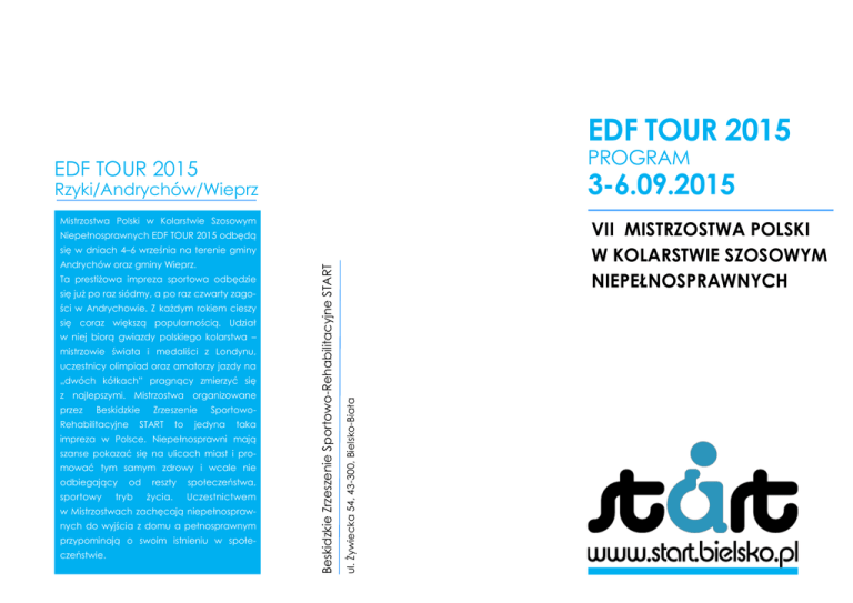EDF TOUR 2015 PROGRAM EDF TOUR 2015 3-6.09.2015 Rzyki/Andrychów/Wieprz Mistrzostwa Polski w Kolarstwie Szosowym VII MISTRZOSTWA POLSKI W KOLARSTWIE SZOSOWYM NIEPEŁNOSPRAWNYCH Niepełnosprawnych EDF TOUR 2015 odbędą Ta prestiżowa impreza sportowa odbędzie się już po raz siódmy, a po raz czwarty zagości w Andrychowie. Z każdym rokiem cieszy się coraz większą popularnością. Udział w niej biorą gwiazdy polskiego kolarstwa – mistrzowie świata i medaliści z Londynu, uczestnicy olimpiad oraz amatorzy jazdy na „dwóch kółkach” pragnący zmierzyć się z najlepszymi. Mistrzostwa organizowane przez Beskidzkie Rehabilitacyjne Zrzeszenie START to Sportowo- jedyna taka impreza w Polsce. Niepełnosprawni mają szanse pokazać się na ulicach miast i pro- mować tym samym zdrowy i wcale nie odbiegający sportowy od tryb reszty życia. społeczeństwa, Uczestnictwem w Mistrzostwach zachęcają niepełnosprawnych do wyjścia z domu a pełnosprawnym przypominają o swoim istnieniu w społeczeństwie. ul. Żywiecka 54, 43-300, Bielsko-Biała Andrychów oraz gminy Wieprz. Beskidzkie Zrzeszenie Sportowo-Rehabilitacyjne START się w dniach 4–6 września na terenie gminy „Stosunek do osób niepełnosprawnych określa poziom rozwoju danego państwa we współczesnym świecie” 4 WRZEŚNIA (PIĄTEK) RZYKI INDYWIDUALNA JAZDA NA CZAS 8 km od 9.00 - biuro zawodów 12.00 - obiad w miejscu zakwaterowania 14.00 - zbiórka zawodników w strefie startu (Rzyki/Remiza) 14.30-18.00 Indywidualna jazda na czas 3 WRZEŚNIA (CZWARTEK) PRZYJAZD I ZAKWATEROWANIE Andrychów/Wadowice/Kęty od 14.00 - zakwaterowanie 14.00 - biuro zawodów oraz klasyfikacja medyczna zawodników 18.00 - obiadokolacja w miejscu zakwaterowania 19.00 - odprawa techniczna 20.00 - kolacja w miejscu zakwaterowania 6 WRZEŚNIA (NIEDZIELA) WIEPRZ WYŚCIG ZE STARTU WSPÓLNEGO 5,9 km - 1 pętla ilość km w zależności od grupy: od 80 km w dół - możliwa modyfikacja 7.00-9.00 - śniadanie w miejscu zakwaterowania i wykwaterowanie zawodników 11.15 - zbiórka zawodników w strefie startu, oglądanie trasy 12.30 WYŚCIG ZE STARTU WSPÓLNEGO 21.00 - odprawa techniczna ok 16.00 - ceremonia zakończenia rozdanie medali, poczęstunek (Wieprz) 5 WRZEŚNIA (SOBOTA) ANDRYCHÓW KRYTERIUM ULICZNE *organizator zastrzega sobie drobne zmiany w programie wyścig australijski 7.00-9.00 - śniadanie w miejscu zakwaterowania 12.30 - zbiórka zawodników w strefie startu 13.30-15.00 - kryterium uliczne 15.00 - przekąska w centrum Andrychowa 15.30 - ceremonia wręczenia medali za I i II dzień zawodów 18.00 - uroczysta kolacja 20.00 - premierowy pokaz filmu - To nie koniec drogi z wyprawy niepełnosprawnych motocyklistów do Rumunii. *miejsce zakwaterowania zawodników oraz siedziba biura zawodów będą ogłoszone po 15 sierpnia. Kontakt z nami Beskidzkie Zrzeszenie SportowoRehabilitacyjne START ul. Żywiecka 54 43-300 Bielsko-Biała +48 33 8124440 +48 663 984 392 [email protected] www.start.bielsko.pl