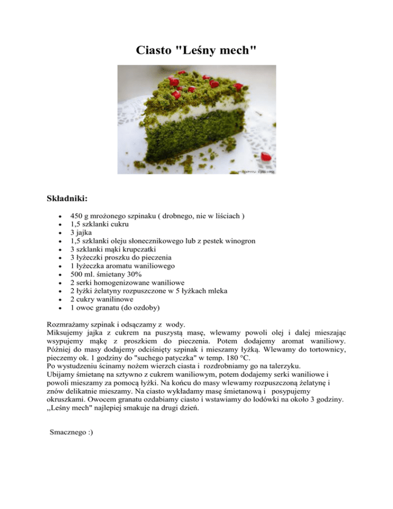 Ciasto "Leśny mech" Składniki: 450 g mrożonego szpinaku ( drobnego, nie w liściach ) 1,5 szklanki cukru 3 jajka 1,5 szklanki oleju słonecznikowego lub z pestek winogron 3 szklanki mąki krupczatki 3 łyżeczki proszku do pieczenia 1 łyżeczka aromatu waniliowego 500 ml. śmietany 30% 2 serki homogenizowane waniliowe 2 łyżki żelatyny rozpuszczone w 5 łyżkach mleka 2 cukry wanilinowe 1 owoc granatu (do ozdoby) Rozmrażamy szpinak i odsączamy z wody. Miksujemy jajka z cukrem na puszystą masę, wlewamy powoli olej i dalej mieszając wsypujemy mąkę z proszkiem do pieczenia. Potem dodajemy aromat waniliowy. Później do masy dodajemy odciśnięty szpinak i mieszamy łyżką. Wlewamy do tortownicy, pieczemy ok. 1 godziny do "suchego patyczka" w temp. 180 °C. Po wystudzeniu ścinamy nożem wierzch ciasta i rozdrobniamy go na talerzyku. Ubijamy śmietanę na sztywno z cukrem waniliowym, potem dodajemy serki waniliowe i powoli mieszamy za pomocą łyżki. Na końcu do masy wlewamy rozpuszczoną żelatynę i znów delikatnie mieszamy. Na ciasto wykładamy masę śmietanową i posypujemy okruszkami. Owocem granatu ozdabiamy ciasto i wstawiamy do lodówki na około 3 godziny. ,,Leśny mech" najlepiej smakuje na drugi dzień. Smacznego :)