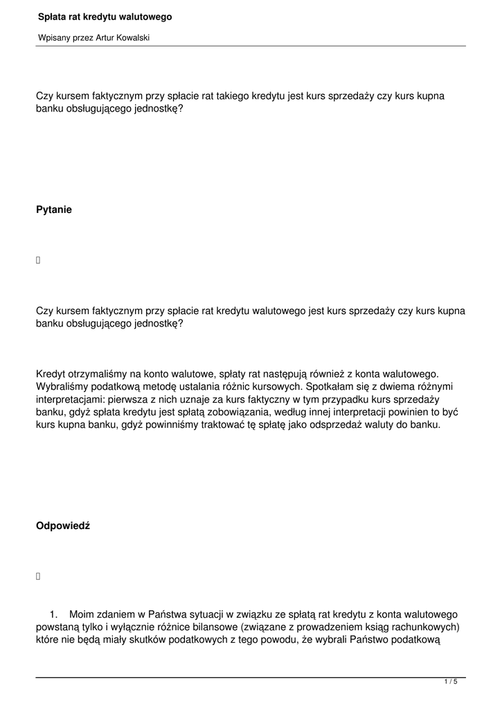 Spłata rat kredytu walutowego Wpisany przez Artur Kowalski Czy kursem faktycznym przy spłacie rat takiego kredytu jest kurs sprzedaży czy kurs kupna banku obsługującego jednostkę? Pytanie Czy kursem faktycznym przy spłacie rat kredytu walutowego jest kurs sprzedaży czy kurs kupna banku obsługującego jednostkę? Kredyt otrzymaliśmy na konto walutowe, spłaty rat następują również z konta walutowego. Wybraliśmy podatkową metodę ustalania różnic kursowych. Spotkałam się z dwiema różnymi interpretacjami: pierwsza z nich uznaje za kurs faktyczny w tym przypadku kurs sprzedaży banku, gdyż spłata kredytu jest spłatą zobowiązania, według innej interpretacji powinien to być kurs kupna banku, gdyż powinniśmy traktować tę spłatę jako odsprzedaż waluty do banku. Odpowiedź 1. Moim zdaniem w Państwa sytuacji w związku ze spłatą rat kredytu z konta walutowego powstaną tylko i wyłącznie różnice bilansowe (związane z prowadzeniem ksiąg rachunkowych) które nie będą miały skutków podatkowych z tego powodu, że wybrali Państwo podatkową 1/5 Spłata rat kredytu walutowego Wpisany przez Artur Kowalski metodę rozliczania różnic kursowych. 2. Tylko niejako przy okazji spłaty rat z rachunku walutowego konieczne będzie ustalenie różnicy kursowej, ale na płaszczyźnie innego zdarzenia gospodarczego - „wypływu waluty z konta walutowego" - przy tej okazji (ustalania różnić kursowych od wypływu walut z rachunku bankowego) w istocie moim zdaniem jako kurs faktyczny należałoby co do zasady przyjąć kurs kupna banku, z którego usług Państwo korzystają. Uzasadnienie Pojęcie „faktycznie zastosowanego kursu waluty" waluty pojawiło w przepisach ustaw podatkowych wraz z dodaniem w 2007 r. art. 15a do ustawy z dnia 15 lutego 1992 r. o podatku dochodowym od osób prawnych (tekst jedn.: Dz. U. z 2000 r. Nr 54, poz. 654 z późn. zm.) dalej u.p.d.o.p., regulującego nowe zasady naliczania różnic kursowych. Ustawa nie definiuje pojęcia „faktycznie zastosowanego kursu waluty". Organy podatkowe w wydawanych interpretacjach wyjaśniają, iż są to wszelkie kursy walutowe zastosowane przez podatnika, w tym bankowe, również przy transakcjach walutowych związanych z indywidualną umową z bankiem (np. interpretacja Dyrektora Izby Skarbowej w Warszawie z dnia 21 listopada 2008 r., IPPB3/423-1199/08-3/ER). W podobny sposób „kurs faktycznie zastosowany" został określony w znowelizowanych przepisach ustawy o rachunkowości, zgodnie z którymi faktycznie zastosowany kurs waluty wynika z charakteru operacji. 2/5 Spłata rat kredytu walutowego Wpisany przez Artur Kowalski Na gruncie powyższych uwag można wskazać, iż nigdy nie będzie tak, że kursem faktycznie zastosowanym winien być zawsze kurs sprzedaży banku czy też kurs kupna banku. Bowiem sama definicja i jej uzasadnienie pojawiające się w interpretacjach organów podatkowych wskazują, iż kurs może być ustalany jednostkowo przez zainteresowanych w inny sposób dla własnych potrzeb. Obawiam się, że Państwa wątpliwości mają jednak swoją przyczynę w czymś zupełnie innym niż sam sposób ustalenia kursu waluty. Piszą Państwo o odmiennych interpretacjach co do sposobu ustalenia faktycznego kursu, ale tak naprawdę, to ta odmienność interpretacji odnosi się do oceny samego charakteru zdarzeniu gospodarczego. Chodzi bowiem o to czy w Państwa sytuacji, gdy spłata rat kredytu walutowego następuje z rachunku walutowego i same raty są określane w walucie obcej (nie są przeliczane na PLN) wymaga to przeliczenia dla potrzeb rozliczenia z podatku dochodowego na PLN i po jakim kursie, i czy powstają różnice kursowe. Moim zdaniem w Państwa sytuacji w związku ze spłatą rat kredytu walutowego z konta walutowego powstaną tylko i wyłącznie różnice bilansowe (związane z prowadzeniem ksiąg rachunkowych) które nie będą miały skutków podatkowych z tego powodu, że wybrali Państwo podatkową metodę rozliczania różnic kursowych. Na gruncie podatkowym nie będzie żadnych różnic kursowych od spłacanych rat, bowiem sam kredyt i raty są spłacane w walucie obcej i nie ma potrzeby ich przeliczania na złote (pożyczam 1000 euro i oddaję 1000 euro, a nie oddaję tak jak w kredytach denominowanych równowartości 1000 euro w złotych). Istotne jest to, iż sama rata kredytu składa się z części kapitałowej i części odsetkowej. Dla celów podatkowych (inaczej niż dla celów księgowych) część kapitałowa nie jest w ogóle 3/5 Spłata rat kredytu walutowego Wpisany przez Artur Kowalski kwalifikowana po stronie kosztowej (zgodnie z art. 16 ust. 1 pkt 10 lit. a u.p.d.o.p. nie uważa się za koszt uzyskania przychodów wydatków na spłatę pożyczek (kredytów) z wyjątkiem skapitalizowanych odsetek od tych pożyczek, kredytów). Nie ma więc potrzeby jej przeliczania na PLN. Część odsetkowa, ponieważ będzie kosztem uzyskania przychodów, winna zostać przeliczona na PLN nie po kursie faktycznym, który jest stosowany przy rozliczaniu różnic kursowych, ale na zasadach określonych w art. 15 ust. 1 u.p.d.o.p po kursie średnim NBP z ostatniego dnia roboczego poprzedzającego dzień poniesienia kosztu. Odnosząc się do wskazywanej przez Państwa interpretacji, że spłata kredytu jest spłatą zobowiązania, zgadzam się z tym, ale tylko i wyłącznie na płaszczyźnie cywilnoprawnej. Na płaszczyźnie podatkowej spłata raty kapitałowej i odsetek winna zostać rozliczana podatkowo tak jak powyżej opisałem. Odnosząc się do wskazywanej przez Państwa drugiej interpretacji, że spłatę należy traktować jako odsprzedaż waluty do banku, uważam, iż z taką sytuacją mielibyśmy do czynienia tylko w sytuacji, gdyby spłata nie następowała w obcej walucie, ale w PLN. Dla celów podatkowych z uwagi na zapłatę raty kredytu z konta walutowego różnice kursowe winny być rozliczane tylko i wyłącznie w związku z faktem, iż w wyniku zapłaty 