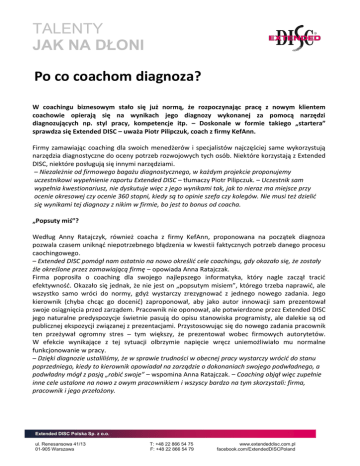 TALENTY JAK NA DŁONI Po co coachom diagnoza? W coachingu biznesowym stało się już normą, że rozpoczynając pracę z nowym klientem coachowie opierają się na wynikach jego diagnozy wykonanej za pomocą narzędzi diagnozujących np. styl pracy, kompetencje itp. – Doskonale w formie takiego „startera” sprawdza się Extended DISC – uważa Piotr Pilipczuk, coach z firmy KefAnn. Firmy zamawiając coaching dla swoich menedżerów i specjalistów najczęściej same wykorzystują narzędzia diagnostyczne do oceny potrzeb rozwojowych tych osób. Niektóre korzystają z Extended DISC, niektóre posługują się innymi narzędziami. – Niezależnie od firmowego bagażu diagnostycznego, w każdym projekcie proponujemy uczestnikowi wypełnienie raportu Extended DISC – tłumaczy Piotr Pilipczuk. – Uczestnik sam wypełnia kwestionariusz, nie dyskutuje więc z jego wynikami tak, jak to nieraz ma miejsce przy ocenie okresowej czy ocenie 360 stopni, kiedy są to opinie szefa czy kolegów. Nie musi też dzielić się wynikami tej diagnozy z nikim w firmie, bo jest to bonus od coacha. „Popsuty miś”? Według Anny Ratajczyk, również coacha z firmy KefAnn, proponowana na początek diagnoza pozwala czasem uniknąć niepotrzebnego błądzenia w kwestii faktycznych potrzeb danego procesu caochingowego. – Extended DISC pomógł nam ostatnio na nowo określić cele coachingu, gdy okazało się, że zostały źle określone przez zamawiającą firmę – opowiada Anna Ratajczak. Firma poprosiła o coaching dla swojego najlepszego informatyka, który nagle zaczął tracić efektywność. Okazało się jednak, że nie jest on „popsutym misiem”, którego trzeba naprawić, ale wszystko samo wróci do normy, gdyż wystarczy zrezygnować z jednego nowego zadania. Jego kierownik (chyba chcąc go docenić) zaproponował, aby jako autor innowacji sam prezentował swoje osiągnięcia przed zarządem. Pracownik nie oponował, ale potwierdzone przez Extended DISC jego naturalne predyspozycje świetnie pasują do opisu stanowiska programisty, ale dalekie są od publicznej ekspozycji związanej z prezentacjami. Przystosowując się do nowego zadania pracownik ten przeżywał ogromny stres – tym większy, że prezentował wobec firmowych autorytetów. W efekcie wynikające z tej sytuacji olbrzymie napięcie wręcz uniemożliwiało mu normalne funkcjonowanie w pracy. – Dzięki diagnozie ustaliliśmy, że w sprawie trudności w obecnej pracy wystarczy wrócić do stanu poprzedniego, kiedy to kierownik opowiadał na zarządzie o dokonaniach swojego podwładnego, a podwładny mógł z pasją „robić swoje” – wspomina Anna Ratajczak. – Coaching objął więc zupełnie inne cele ustalone na nowo z owym pracownikiem i wszyscy bardzo na tym skorzystali: firma, pracownik i jego przełożony. Extended DISC Polska Sp. z o.o. ul. Renesansowa 41/13 01-905 Warszawa T: +48 22 866 54 75 F: +48 22 866 54 79 www.extendeddisc.com.pl facebook.com/ExtendedDISCPoland TALENTY JAK NA DŁONI Jak rozmawiać z szefem? Oprócz diagnozy wstępnej coachowie z KefAnn wykorzystują nieraz Extended DISC do pogłębienia diagnozy w trakcie pracy z uczestnikiem. Uczestnik w miarę upływu czasu uzyskuje coraz lepszy wgląd w samego siebie i czasami zwierza się coachowi, że niby wszystko jest w porządku, ale... – I zaczynamy szukać – wyjaśnia Anna Ratajczak. – Jeżeli odpowiedź nie leży w zasięgu wzroku, sięgamy po narzędzia diagnostyczne, m.in. Extended DISC. Jako przykład użyteczności narzędzia przytacza przypadek uczestniczki, która w coachingu podnosiła poziom kompetencji, posiadała odpowiednie zasoby i zakres jej zadań był adekwatny, a jednak czuła, że coś jest nie tak. Raport Extended DISC ujawnił u niej poczucie niejasnych oczekiwań. Razem z coachem doszły do wniosku, że nad jakością jej funkcjonowania w pracy ciąży to, iż stara się sama odgadnąć, co jej szef miał na myśli zlecając zadania i nie tłumacząc o co mu konkretnie chodzi. (Szef akurat był takim typem, że w tematy wprowadzał na bardzo ogólnym poziomie, a nie operacyjnie: czego oczekuje, po czym konkretnie pozna, że osiągnęła cel.) Nigdy wcześniej nie przyszło jej do głowy, żeby wyciągać od przełożonego takie konkrety – jakby podświadomie zakładając, iż nierozumienie jego intencji świadczyłoby o braku inteligencji. – Badanie Extended DISC otworzyło nam nowe drzwi w coachingu: zaczęłyśmy pracować nad umiejętnością realistycznego spojrzenia na siebie; że tak naprawdę to nie potrafi odgadnąć, co szef ma na myśli i nie ma w tym nic wstydliwego – relacjonuje Anna Ratajczyk. – I druga umiejętność do doskonalenia: rozmawiać z przełożonym tak, aby wydostać od niego te operacyjne informacje, a równocześnie nie utracić w jego i własnych oczach wizerunku osoby inteligentnej. Wiele osób boi się wyciągać od szefa dodatkowe wyjaśnienia tylko dlatego, żeby nie wyjść na głupka albo buntownika. Dyski dla coachów Skoro narzędzie Extended DISC tak dobrze sprawdza się w pracy coacha, to nie bez kozery byłoby korzystać z niego samemu. W prowadzonej przez KefAnn szkole coachingu pozwalającej uzyskać międzynarodowy certyfikat ICC, każdy z kursantów ma okazję otrzymać własny raport, pomagający w lepszym poznaniu samego siebie. – Jest to narzędzie na tyle elastyczne, że można je było zmodyfikować i uzyskać wersję dostosowaną do potrzeb konkretnej grupy zawodowej: w tym przypadku coachów, trenerów, mentorów, jednym słowem osób pomagającym innym w rozwoju – mówi Piotr Pilipczuk. W trakcie 12-dniowej szkoły coachingu uczestnicy wypełniają na początku kwestionariusz i uzyskują swoje raporty oraz dostęp do materiałów elearningowych. Potem rozmawiają z coachami na temat podstawowych wyników raportu, a pod koniec kursu zapraszani są przedstawiciele Extended DISC, by ew. głębiej zinterpretować wyniki raportów. Raporty te pomagają uczes