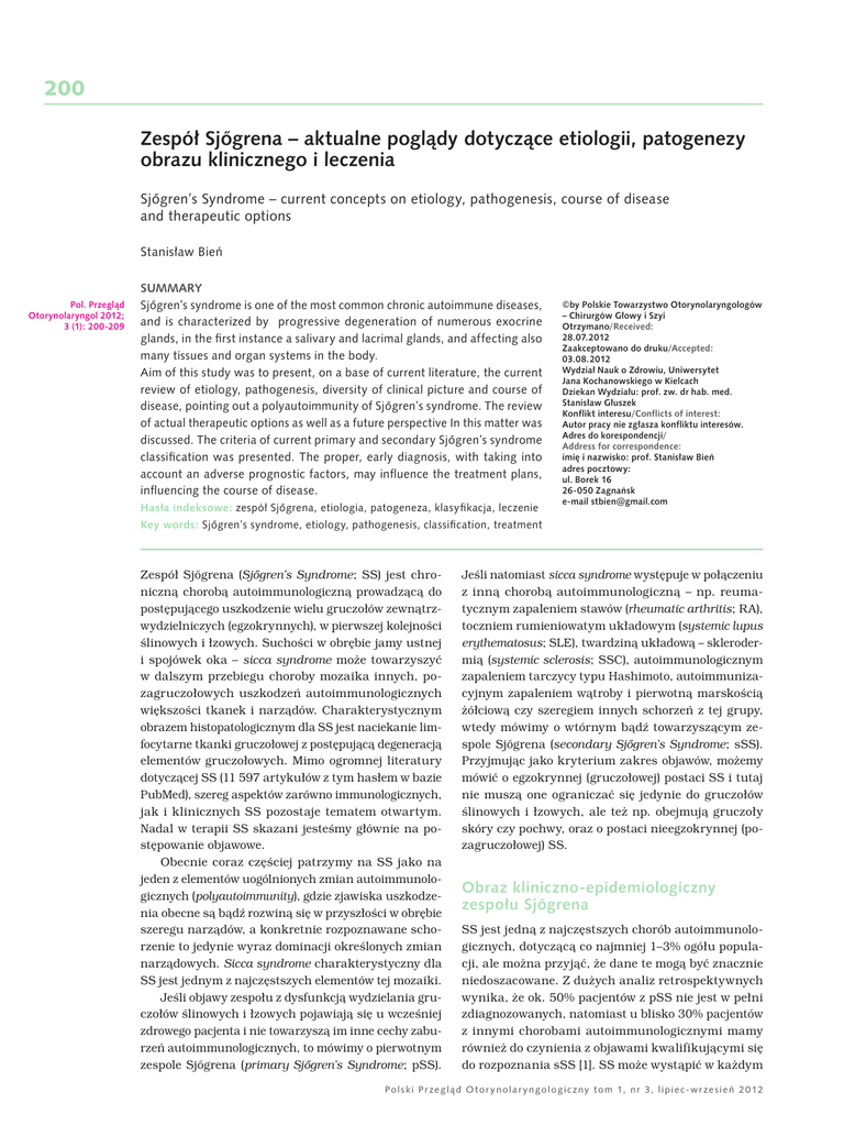 200 Zespół Sjőgrena – aktualne poglądy dotyczące etiologii, patogenezy obrazu klinicznego i leczenia Sjőgren’s Syndrome – current concepts on etiology, pathogenesis, course of disease and therapeutic options Stanisław Bień Pol. Przegląd Otorynolaryngol 2012; 3 (1): 200-209 SUMMARY Sjőgren’s syndrome is one of the most common chronic autoimmune diseases, and is characterized by progressive degeneration of numerous exocrine glands, in the first instance a salivary and lacrimal glands, and affecting also many tissues and organ systems in the body. Aim of this study was to present, on a base of current literature, the current review of etiology, pathogenesis, diversity of clinical picture and course of disease, pointing out a polyautoimmunity of Sjőgren’s syndrome. The review of actual therapeutic options as well as a future perspective In this matter was discussed. The criteria of current primary and secondary Sjőgren’s syndrome classification was presented. The proper, early diagnosis, with taking into account an adverse prognostic factors, may influence the treatment plans, influencing the course of disease. Hasła indeksowe: zespół Sjőgrena, etiologia, patogeneza, klasyfikacja, leczenie ©by Polskie Towarzystwo Otorynolaryngologów – Chirurgów Głowy i Szyi Otrzymano/Received: 28.07.2012 Zaakceptowano do druku/Accepted: 03.08.2012 Wydział Nauk o Zdrowiu, Uniwersytet Jana Kochanowskiego w Kielcach Dziekan Wydziału: prof. zw. dr hab. med. Stanisław Głuszek Konflikt interesu/Conflicts of interest: Autor pracy nie zgłasza konfliktu interesów. Adres do korespondencji/ Address for correspondence: imię i nazwisko: prof. Stanisław Bień adres pocztowy: ul. Borek 16 26-050 Zagnańsk e-mail [email protected] Key words: Sjőgren’s syndrome, etiology, pathogenesis, classification, treatment Zespół Sjőgrena (Sjőgren’s Syndrome; SS) jest chroniczną chorobą autoimmunologiczną prowadzącą do postępującego uszkodzenie wielu gruczołów zewnątrzwydzielniczych (egzokrynnych), w pierwszej kolejności ślinowych i łzowych. Suchości w obrębie jamy ustnej i spojówek oka – sicca syndrome może towarzyszyć w dalszym przebiegu choroby mozaika innych, pozagruczołowych uszkodzeń autoimmunologicznych większości tkanek i narządów. Charakterystycznym obrazem histopatologicznym dla SS jest naciekanie limfocytarne tkanki gruczołowej z postępującą degeneracją elementów gruczołowych. Mimo ogromnej literatury dotyczącej SS (11 597 artykułów z tym hasłem w bazie PubMed), szereg aspektów zarówno immunologicznych, jak i klinicznych SS pozostaje tematem otwartym. Nadal w terapii SS skazani jesteśmy głównie na postępowanie objawowe. Obecnie coraz częściej patrzymy na SS jako na jeden z elementów uogólnionych zmian autoimmunologicznych (polyautoimmunity), gdzie zjawiska uszkodzenia obecne są bądź rozwiną się w przyszłości w obrębie szeregu narządów, a konkretnie rozpoznawane schorzenie to jedynie wyraz dominacji określonych zmian narządowych. Sicca syndrome charakterystyczny dla SS jest jednym z najczęstszych elementów tej mozaiki. Jeśli objawy zespołu z dysfunkcją wydzielania gruczołów ślinowych i łzowych pojawiają się u wcześniej zdrowego pacjenta i nie towarzyszą im inne cechy zaburzeń autoimmunologicznych, to mówimy o pierwotnym zespole Sjőgrena (primary Sjőgren’s Syndrome; pSS). Jeśli natomiast sicca syndrome występuje w połączeniu z inną chorobą autoimmunologiczną – np. reumatycznym zapaleniem stawów (rheumatic arthritis; RA), toczniem rumieniowatym układowym (systemic lupus erythematosus; SLE), twardziną układową – sklerodermią (systemic sclerosis; SSC), autoimmunologicznym zapaleniem tarczycy typu Hashimoto, autoimmunizacyjnym zapaleniem wątroby i pierwotną marskością żółciową czy szeregiem innych schorzeń z tej grupy, wtedy mówimy o wtórnym bądź towarzyszącym zespole Sjőgrena (secondary Sjőgren’s Syndrome; sSS). Przyjmując jako kryterium zakres objawów, możemy mówić o egzokrynnej (gruczołowej) postaci SS i tutaj nie muszą one ograniczać się jedynie do gruczołów ślinowych i łzowych, ale też np. obejmują gruczoły skóry czy pochwy, oraz o postaci nieegzokrynnej (pozagruczołowej) SS. Obraz kliniczno-epidemiologiczny zespołu Sjőgrena SS jest jedną z najczęstszych chorób autoimmunologicznych, dotyczącą co najmniej 1–3% ogółu populacji, ale można przyjąć, że dane te mogą być znacznie niedoszacowane. Z dużych analiz retrospektywnych wynika, że ok. 50% pacjentów z pSS nie jest w pełni zdiagnozowanych, natomiast u blisko 30% pacjentów z innymi chorobami autoimmunologicznymi mamy również do czynienia z objawami kwalifikującymi się do rozpoznania sSS [1]. SS może wystąpić w każdym P o l s k i P r z e g l ą d O t o r y n o l a r y n g o l o g i c z n y t o m 1, n r 3 , l i p i e c - w r z e s i e ń 2 0 12 201 wieku, ale widzimy go najczęściej u kobiet w okresie około menopauzalnym, w proporcji K:M = 9:1 [2, 3]. Jeśli SS występuje u młodszych pacjentów, charakteryzuje się z reguły cięższym przebiegiem [2, 4]. Łagodny na ogół przebieg SS, gdzie dominują objawy suchości w jamie ustnej i spojówkach, sprawia, iż nie bierze się pod uwagę innych, słabiej widocznych objawów. W części jednak przypadków ta chroniczna z definicji choroba postępuje i prowadzić może do ciężkich powikłań ogólnych, a nawet do śmierci. Tam gdzie dominującym obrazem choroby immunologicznej są ciężkie objawy ogólne (bóle i ograniczenia ruchomości stawów, cechy niewydolności wątroby czy nerek, ciężkie zaburzenia neurologiczne), objawy suchości w jamie ustnej czy worku spojówkowym są często bagatelizowane. Próbując określić czynniki ryzyka niekorzystnego przebiegu choroby w pSS, wymienia się obniżenie w surowicy poziomu białek układu dopełniacza C3 i C4, obecność krążących krioglobulin – z tendencją do s