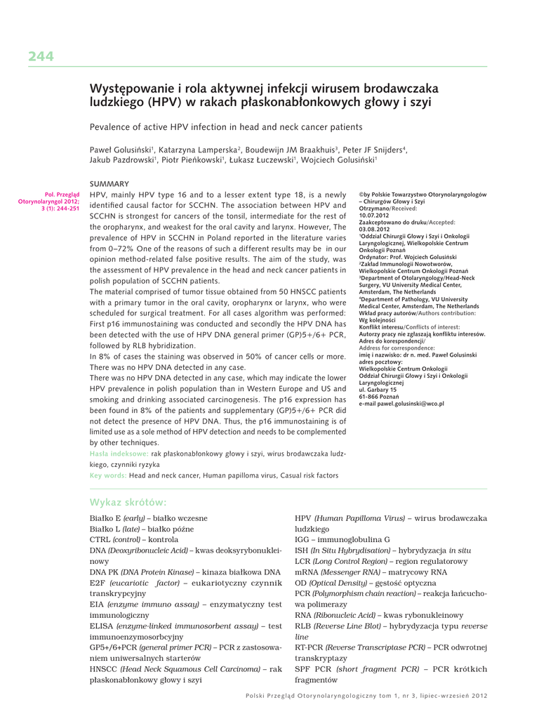 244 Występowanie i rola aktywnej infekcji wirusem brodawczaka ludzkiego (HPV) w rakach płaskonabłonkowych głowy i szyi Pevalence of active HPV infection in head and neck cancer patients Paweł Golusiński1, Katarzyna Lamperska 2, Boudewijn JM Braakhuis3, Peter JF Snijders 4, Jakub Pazdrowski1, Piotr Pieńkowski1, Łukasz Łuczewski1, Wojciech Golusiński1 Pol. Przegląd Otorynolaryngol 2012; 3 (1): 244-251 SUMMARY HPV, mainly HPV type 16 and to a lesser extent type 18, is a newly identified causal factor for SCCHN. The association between HPV and SCCHN is strongest for cancers of the tonsil, intermediate for the rest of the oropharynx, and weakest for the oral cavity and larynx. However, The prevalence of HPV in SCCHN in Poland reported in the literature varies from 0 –72% One of the reasons of such a different results may be in our opinion method-related false positive results. The aim of the study, was the assessment of HPV prevalence in the head and neck cancer patients in polish population of SCCHN patients. The material comprised of tumor tissue obtained from 50 HNSCC patients with a primary tumor in the oral cavity, oropharynx or larynx, who were scheduled for surgical treatment. For all cases algorithm was performed: First p16 immunostaining was conducted and secondly the HPV DNA has been detected with the use of HPV DNA general primer (GP)5+/6+ PCR, followed by RLB hybridization. In 8% of cases the staining was observed in 50% of cancer cells or more. There was no HPV DNA detected in any case. There was no HPV DNA detected in any case, which may indicate the lower HPV prevalence in polish population than in Western Europe and US and smoking and drinking associated carcinogenesis. The p16 expression has been found in 8% of the patients and supplementary (GP)5+/6+ PCR did not detect the presence of HPV DNA. Thus, the p16 immunostaining is of limited use as a sole method of HPV detection and needs to be complemented by other techniques. ©by Polskie Towarzystwo Otorynolaryngologów – Chirurgów Głowy i Szyi Otrzymano/Received: 10.07.2012 Zaakceptowano do druku/Accepted: 03.08.2012 1 Oddział Chirurgii Głowy i Szyi i Onkologii Laryngologicznej, Wielkopolskie Centrum Onkologii Poznań Ordynator: Prof. Wojciech Golusiński 2 Zakład Immunologii Nowotworów, Wielkopolskie Centrum Onkologii Poznań 3 Department of Otolaryngology/Head-Neck Surgery, VU University Medical Center, Amsterdam, The Netherlands 4 Department of Pathology, VU University Medical Center, Amsterdam, The Netherlands Wkład pracy autorów/Authors contribution: Wg kolejności Konflikt interesu/Conflicts of interest: Autorzy pracy nie zgłaszają konfliktu interesów. Adres do korespondencji/ Address for correspondence: imię i nazwisko: dr n. med. Paweł Golusinski adres pocztowy: Wielkopolskie Centrum Onkologii Oddział Chirurgii Głowy i Szyi i Onkologii Laryngologicznej ul. Garbary 15 61-866 Poznań e-mail [email protected] Hasła indeksowe: rak płaskonabłonkowy głowy i szyi, wirus brodawczaka ludzkiego, czynniki ryzyka Key words: Head and neck cancer, Human papilloma virus, Casual risk factors Wykaz skrótów: Białko E (early) – białko wczesne Białko L (late) – białko późne CTRL (control) – kontrola DNA (Deoxyribonucleic Acid) – kwas deoksyrybonukleinowy DNA PK (DNA Protein Kinase) – kinaza białkowa DNA E2F (eucariotic factor) – eukariotyczny czynnik transkrypcyjny EIA (enzyme immuno assay) – enzymatyczny test immunologiczny ELISA (enzyme-linked immunosorbent assay) – test immunoenzymosorbcyjny GP5+/6+PCR (general primer PCR) – PCR z zastosowaniem uniwersalnych starterów HNSCC (Head Neck Squamous Cell Carcinoma) – rak płaskonabłonkowy głowy i szyi HPV (Human Papilloma Virus) – wirus brodawczaka ludzkiego IGG – immunoglobulina G ISH (In Situ Hybrydisation) – hybrydyzacja in situ LCR (Long Control Region) – region regulatorowy mRNA (Messenger RNA) – matrycowy RNA OD (Optical Density) – gęstość optyczna PCR (Polymorphism chain reaction) – reakcja łańcuchowa polimerazy RNA (Ribonucleic Acid) – kwas rybonukleinowy RLB (Reverse Line Blot) – hybrydyzacja typu reverse line RT-PCR (Reverse Transcriptase PCR) – PCR odwrotnej transkryptazy SPF PCR (short fragment PCR) – PCR krótkich fragmentów P o l s k i P r z e g l ą d O t o r y n o l a r y n g o l o g i c z n y t o m 1, n r 3 , l i p i e c - w r z e s i e ń 2 0 12 245 Tabela I. Rozpoznanie histopatologiczne i stopień dojrzałości nowotworu Table I. Histopathological diagnosis of cancer and degree of maturity Stopień dojrzałości G N G1 G2 G3 Carcinoma planoepitheliale keratodes 26 7 19 2 Carcinoma planoepitheliale akeratodes 13 1 7 5 Carcinoma planoepitheliale partim keratodes 11 1 8 0 Razem 50 9 34 7 Rozpoznanie Tabela II. Klasyfikacja TNM Table II. TNM clasyfication Lokalizacja TNM T N M N T1 T2 T3 T4 N0 N1 N2 M Jama ustna 31 2 15 5 0 10 17 4 0 Gardło środkowe 10 10 6 2 0 3 6 1 1 Krtań 9 2 4 1 3 5 4 0 0 RAZEM 50 14 25 8 3 18 27 5 1 Wstęp Raki płaskonabłonkowe głowy i szyi stanowią heterogenną grupę nowotworów. Rozwijają się w różnych lokalizacjach pierwotnych, ale związane są ze wspólnymi czynnikami ryzyka i wykazują podobne cechy patologiczne. Rocznie na świecie rozpoznaje się około 650 000 nowych zachorowań na nowotwory głowy i szyi, co stanowi ok. 6% wszystkich nowotworów złośliwych. W ciągu ostatnich dwudziestu lat odnotowano nieznaczny spadek ogólnej liczby zachorowań na raka głowy i szyi, w szczególności raka krtani [1]. Jednocześnie w Europie i Stanach Zjednoczonych obserwuje się stały wzrost zachorowań na raka zlokalizowanego w obrębie jamy ustnej i gardła środkowego. Dotyczy to przede wszystkim chorych poniżej 40. roku życia [2, 3]. Spożywanie wysokoprocentowych napojów alkoholowych oraz palenie tytoniu uważa się za podstawowe czynniki ryzyka rozwoju raka głowy i szyi. Około 75% wszystkich raków tego regionu związanych jest z występowa