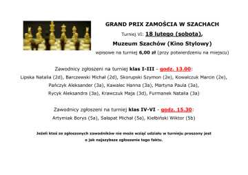 GRAND PRIX ZAMOŚCIA W SZACHACH Turniej VI: 18 lutego (sobota), Muzeum Szachów (Kino Stylowy) wpisowe na turniej 6,00 zł (przy potwierdzeniu na miejscu) Zawodnicy zgłoszeni na turniej klas I-III - godz. 13.00: Lipska Natalia (2d), Barczewski Michał (2d), Skorupski Szymon (2e), Kowalczuk Marcin (2e), Pańczyk Aleksander (3a), Kawalec Hanna (3a), Martyna Paula (3a), Rycyk Aleksandra (3a), Krawczuk Maja (3d), Furmanek Natalia (3a) Zawodnicy zgłoszeni na turniej klas IV-VI - godz. 15.30: Artymiak Borys (5a), Sałapat Michał (5a), Kiełbiński Wiktor (5b) Jeżeli ktoś ze zgłoszonych zawodników nie może wziąć udziału w turnieju proszony jest o jak najszybsze zgłoszenie tego faktu.