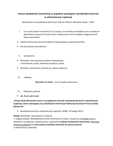 Ocena działalności kontrolnej w aspekcie wymogów standardów kontroli w administracji rządowej Opracowano na podstawie informacji: Marcin Dobruk, Mirosław Stasik – KSAP I. Co to jest jakość w kontroli? Co to znaczy, że kontrola prowadzona jest na dobrym jakościowo poziomie? Ile jest warta Twoja praca? Za ile kupiłbyś usługę kontroli, którą wykonałeś? Jakość kontroli jest obrazem jakości funkcjonującej w danej jednostce. Kto kontroluje kontrolerów? II. Samoocena Wewnątrz: kierownictwo (nadzór funkcjonalny i samoocena), audyt, kontrola zarządcza, służby Zewnątrz: kontrolerzy zewnętrzni, opinia publiczna III. refleksja Nie patrz na mnie! …bo mi spada samoocena IV. Podstawy prawne art. 8 ust. pkt.3 uok „Prezes Rady Ministrów może w szczególności określić standardy kontroli w administracji rządowej, które udostępnia się w Biuletynie Informacji Publicznej Kancelarii Prezesa Rady Ministrów” Standardy kontroli w administracji rządowej, KPRM, 10 lutego 2012r. Wstęp: Standardy, opracowane w oparciu o bogatą wiedzę i doświadczenie służb kontrolnych w kraju i za granicą, określają ramy w dziedzinie zarządzania, wykonywania i zapewniania jakości działalności kontrolnej. Stanowią również podstawę do oceny jakości działania komórek do spraw kontroli w administracji rządowej. III. Standardy pracy; 3. Zapewnienie jakości 3.1. Kierownik komórki do spraw kontroli zapewnia wsparcie merytoryczne oraz właściwy nadzór nad prawidłową realizacją zadań kontrolera na każdym etapie postępowania kontrolnego, tak aby zapewnić osiągnięcie celu kontroli oraz odpowiednią jakość prac. 3.2. Minimalnym wymogiem nadzoru jest obowiązek weryfikacji dokumentacji kontrolnej w celu potwierdzenia prawidłowości i adekwatności dokonanych ustaleń oraz sformułowanych ocen i wniosków. 3.3. Kierownik komórki do spraw kontroli zapewnia zarządzanie wiedzą w tej komórce. 3.4. Kierownik komórki do spraw kontroli opracowuje i realizuje program zapewnienia jakości, mający na celu umożliwienie oceny zgodności działalności tej komórki z ustawą o kontroli i standardami wydanymi na podstawie ustawy o kontroli. 3.5. Program zapewnienia jakości, obejmujący wszystkie aspekty działalności kontrolnej komórki do spraw kontroli, uwzględnia zarówno oceny wewnętrzne (samooceny), jak i oceny zewnętrzne. Szczegółowość programu zapewnienia jakości jest adekwatna do charakteru i zakresu prowadzonej działalności kontrolnej i wielkości komórki do spraw kontroli. 3.6. Ocena wewnętrzna dotyczy przeglądów okresowych, obejmujących wybrane (samoocena niepełna) lub wszystkie aspekty działalności kontrolnej (samoocena pełna). Samoocena może być potwierdzona oceną zewnętrzną. 3.7. Ocena zewnętrzna przeprowadzana jest okresowo przez osobę lub zespół spoza jednostki. 3.8. Osoby dokonujące ocen powinny cechować się profesjonalizmem w dziedzinie kontroli oraz kierować się zasadami podstawowymi (uczciwość i rzetelność, niezależność i obiektywizm, poufność, profesjonalny osąd). 3.9. Oceny wewnętrzne mogą być prowadzone w każdym czasie, natomiast pierwsze oceny zewnętrzne powinny mieć miejsce nie później niż po trzech latach od dnia wejścia w życie ustawy o kontroli (tj. do końca 2014 r.). Kolejne oceny zewnętrzne powinny być dokonywane nie rzadziej niż raz na trzy lata. 3.10. Wyniki ocen … są przekazywane do KPRM…(?) V. Zasoby ludzkie komórki do spraw kontroli; 1. Zagadnienia ogólne 1.1. Kierownik komórki do spraw kontroli zapewnia, że kontrolerzy, jako zespół, posiadają wymagane kompetencje na poziomie zapewniającym najwyższą jakość, wydajność i skuteczność prowadzonej działalności kontrolnej. 1.2. Celem zarządzania zasobami ludzkimi jest osiągnięcie najwyższej jakości działalności kontrolnej, której zakres, charakter i jakość są zgodne z oczekiwaniami zarządzającego kontrolę, ustawą o kontroli oraz standardami wydanymi na podstawie ustawy o kontroli. 1.3. Zarządzanie zasobami ludzkimi obejmuje wdrożenie właściwych procedur rekrutacji, rozwoju zawodowego, szkolenia i oceny pracy kontrolerów. V. Środowisko kontroli - elementy, znaczenie: realizacja programu kontroli, udokumentowanie kontroli, prawidłowe wystąpienie pokontrolne, sposób wdrożenia wniosków i zaleceń, zgodność z budżetem i harmonogramem, rozwój zawodowy kontrolerów, poprawne relacje z kontrolowanymi, kontrola umożliwia ocenę jednostki i jej poprawę działalności. VI. Wysoka jakość funkcji środowiska kontroli, to: Wysoka jakość wykonanych zadań kontrolnych Źródło wiedzy dla organizacji Prewencja (szkolenia, zasady metodyki, udział w naradach kadry kierowniczej, itp.) Współpraca wewnętrzna (między komórkami organizacyjnymi) VII. Zapewnienie jakości – etapy oceny: Planowanie Realizacja kontroli Sprawozdawczość VIII. Zapewnienie jakości - Planowanie – elementy oceny: Cele kontroli – jasno określone Ryzyko – oszacowane i opisane Harmonogram kontroli Realizacja zaleceń – sprawdzić IX. Zapewnienie jakości - Realizacja kontroli, elementy oceny: Dobór zespołu i przygotowanie Nadzór nad kontrolerami Prace zgodne z harmonogramem Zapewnienie wsparcia dla kontrolerów Właściwe przechowywanie dokumentacji roboczej Przestrzeganie zasad i trybu X. Zapewnienie jakości - Sprawozdawczość – elementy oceny: Projekt wystąpienia: zwięzły, jasny, dokładny, prosty, obiektywny. Fakty prezentowane neutralnie. Projekt konstruktywny, tzn. prezentuje pozytywne i negatywne ustalenia. Ustalenia ocenione z uwzględnieniem: istotności, zgodności z prawem, faktów. Projekt został zweryfikowany i zatwierdzony zgodnie z procedurami. Kontrolowany miał możliwość wniesienia uwag. XI. Typy oceny jakości kontroli: Oceniamy funkcję/pozycję kontroli (nie kontrolera – jako osobę). Zapewniamy zgodność z: przepisami uok, wytycznymi MSW, standardami, procedurami. Proces 