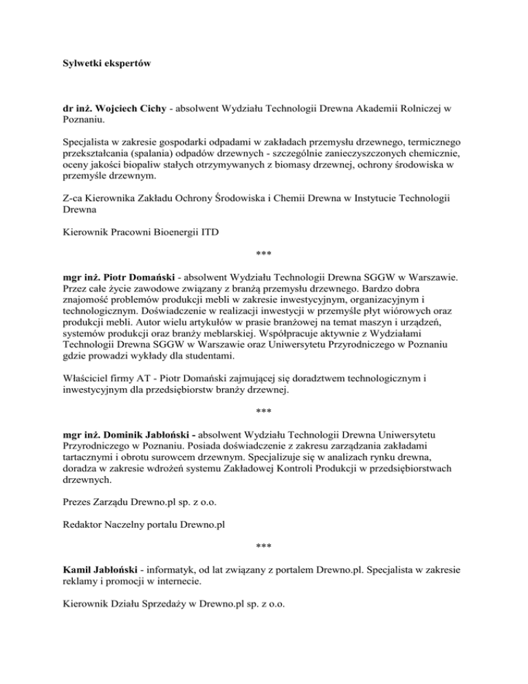 Sylwetki ekspertów dr inż. Wojciech Cichy - absolwent Wydziału Technologii Drewna Akademii Rolniczej w Poznaniu. Specjalista w zakresie gospodarki odpadami w zakładach przemysłu drzewnego, termicznego przekształcania (spalania) odpadów drzewnych - szczególnie zanieczyszczonych chemicznie, oceny jakości biopaliw stałych otrzymywanych z biomasy drzewnej, ochrony środowiska w przemyśle drzewnym. Z-ca Kierownika Zakładu Ochrony Środowiska i Chemii Drewna w Instytucie Technologii Drewna Kierownik Pracowni Bioenergii ITD *** mgr inż. Piotr Domański - absolwent Wydziału Technologii Drewna SGGW w Warszawie. Przez całe życie zawodowe związany z branżą przemysłu drzewnego. Bardzo dobra znajomość problemów produkcji mebli w zakresie inwestycyjnym, organizacyjnym i technologicznym. Doświadczenie w realizacji inwestycji w przemyśle płyt wiórowych oraz produkcji mebli. Autor wielu artykułów w prasie branżowej na temat maszyn i urządzeń, systemów produkcji oraz branży meblarskiej. Współpracuje aktywnie z Wydziałami Technologii Drewna SGGW w Warszawie oraz Uniwersytetu Przyrodniczego w Poznaniu gdzie prowadzi wykłady dla studentami. Właściciel firmy AT - Piotr Domański zajmującej się doradztwem technologicznym i inwestycyjnym dla przedsiębiorstw branży drzewnej. *** mgr inż. Dominik Jabłoński - absolwent Wydziału Technologii Drewna Uniwersytetu Przyrodniczego w Poznaniu. Posiada doświadczenie z zakresu zarządzania zakładami tartacznymi i obrotu surowcem drzewnym. Specjalizuje się w analizach rynku drewna, doradza w zakresie wdrożeń systemu Zakładowej Kontroli Produkcji w przedsiębiorstwach drzewnych. Prezes Zarządu Drewno.pl sp. z o.o. Redaktor Naczelny portalu Drewno.pl *** Kamil Jabłoński - informatyk, od lat związany z portalem Drewno.pl. Specjalista w zakresie reklamy i promocji w internecie. Kierownik Działu Sprzedaży w Drewno.pl sp. z o.o. *** dr inż. Krzysztof Jodłowski, etatowy pracownik Instytutu Badawczego Leśnictwa, specjalizuje się w technologii technice pozyskiwania drewna. Przewodniczący Rady PEFC Polska. dr inż. Michał Kalinowski, etatowy pracownik Instytutu Badawczego Leśnictwa, specjalizuje się w zagadnieniach związanych z pozyskiwaniem roślin użytkowych runa leśnego. Reprezentuje PEFC Polska. PEFC to największa na świecie organizacja zajmująca się certyfikacją leśnictwa. PEFC dostarcza mechanizm potwierdzający, że nabywcy drewna i wyrobów z papieru promują zrównoważoną gospodarkę leśną. *** mgr inż. Ilona OLsztyńska - absolwentka Wydziału Leśnego SGGW w Warszawie. Od 2001 roku związana z branżą drzewną. Kierownik ds. Rozwoju Produktów Certyfikowanych w Obszarze Regulowanym Prawnie (CORP) oraz Auditor Wiodący w zakresie: certyfikacji SNS dla dostawców i producentów biomasy, Zakładowej Kontroli Produkcji w branży drzewnej, certyfikacji systemów FSC i PEFC oraz systemów zarządzania jakością wg ISO 9001, oraz do spraw EUTR. Członek Komitetu Technicznego powołanego przy Polskim Komitecie Normalizacyjnym (KT 215 ds. Projektowania i Wykonawstwa Konstrukcji z Drewna i z Materiałów Drewnopochodnych) oraz auditor/ekspert Polskiego Centrum Akredytacji. Współtwórca Krajowego Standardu Uwierzytelniania Biomasy. Ekspert w zakresie uwierzytelniania upraw energetycznych oraz biomasy na cele energetyczne. Reprezentuje firmę SGS specjalizującą się w dziedzinie inspekcji, weryfikacji, badań i certyfikacji, zatrudniając ponad 85.000 etatowych pracowników w sieci ponad 1800 biur i laboratoriów na całym świecie. SGS Polska zatrudnia 650 etatowych pracowników i posiada ponad 30 oddziałów w całym kraju. SGS działa m.in. w zakresie uwierzytelniania oraz certyfikacji biomasy na cele energetyczne zgodnie z własnym standardem PL-KSUB-SNS:2014; certyfikacji przedsiębiorstw drzewnych w zakresie zgodności Zakładowej Kontroli Produkcji z normami europejskimi w tym PN-EN 14081-1+A1 dla drewna konstrukcyjnego sortowanego wytrzymałościowo (CE); certyfikacji FSC i PEFC – zarówno gospodarstw leśnych jak i zakładów drzewnych oraz systemów zarządzania ISO. SGS Polska posiada status Organizacji Monitorującej w zakresie EUTR. Więcej na temat oferty SGS Polska na stronie www.sgs.pl *** mgr inż. Andrzej Półrolniczak - posiada długoletnie doświadczenie w branży technologii obróbki drewna. Ekspert w zakresie organizacji, zarządzania i inwestycji w przedsiębiorstwach przemysłu drzewnego. Prezes Stowarzyszenia Producentów Maszyn, Urządzeń i Narzędzi do Obróbki Drewna DROMA, Dyrektor Projektu Targów Drema i DremaSilesia organizowanych przez Międzynarodowe Targi Poznańskie. *** mgr inż. Dariusz Rutkowski - absolwent Wydziału Leśnego Uniwersytetu Przyrodniczego w Poznaniu oraz Studium podyplomowego: Zarządzanie projektami europejskimi z wykorzystaniem technologii informatycznych, Wydział Zarządzania Uniwersytet Ekonomiczny Poznań. Ekspert w dziedzinie dotacji z UE oraz dofinansowań ZUS. Od 2004 roku zajmuję się pozyskiwaniem, rozliczaniem i zarządzaniem projektami europejskimi realizowanymi w leśnictwie i branży drzewnej. Prezes Zarządu Forest Consulting Center sp. z o.o. Doradca Dyrektora ds. dotacji europejskich – Leśny Zakład Doświadczalny Uniwersytetu Przyrodniczego w Poznaniu Wykładowca z zakresu zarządzania projektami europejskimi: około 50 szkoleń dla przedsiębiorców z sektora MŚP na terenie całej Polski z zakresu pozyskiwania dotacji na inwestycje w przedsiębiorstwach. *** mgr Jacek Rutkowski - ekspert w dziedzinie certyfikowanych szkoleń branży drzewnej i leśnej. Project manager w Forest Consulting Center sp. z o.o.