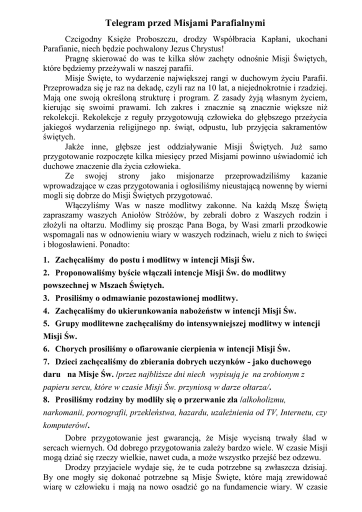 Telegram przed Misjami Parafialnymi Czcigodny Księże Proboszczu, drodzy Współbracia Kapłani, ukochani Parafianie, niech będzie pochwalony Jezus Chrystus! Pragnę skierować do was te kilka słów zachęty odnośnie Misji Świętych, które będziemy przeżywali w naszej parafii. Misje Święte, to wydarzenie największej rangi w duchowym życiu Parafii. Przeprowadza się je raz na dekadę, czyli raz na 10 lat, a niejednokrotnie i rzadziej. Mają one swoją określoną strukturę i program. Z zasady żyją własnym życiem, kierując się swoimi prawami. Ich zakres i znacznie są znacznie większe niż rekolekcji. Rekolekcje z reguły przygotowują człowieka do głębszego przeżycia jakiegoś wydarzenia religijnego np. świąt, odpustu, lub przyjęcia sakramentów świętych. Jakże inne, głębsze jest oddziaływanie Misji Świętych. Już samo przygotowanie rozpoczęte kilka miesięcy przed Misjami powinno uświadomić ich duchowe znaczenie dla życia człowieka. Ze swojej strony jako misjonarze przeprowadziliśmy kazanie wprowadzające w czas przygotowania i ogłosiliśmy nieustającą nowennę by wierni mogli się dobrze do Misji Świętych przygotować. Włączyliśmy Was w nasze modlitwy zakonne. Na każdą Mszę Świętą zapraszamy waszych Aniołów Stróżów, by zebrali dobro z Waszych rodzin i złożyli na ołtarzu. Modlimy się prosząc Pana Boga, by Wasi zmarli przodkowie wspomagali nas w odnowieniu wiary w waszych rodzinach, wielu z nich to święci i błogosławieni. Ponadto: 1. Zachęcaliśmy do postu i modlitwy w intencji Misji Św. 2. Proponowaliśmy byście włączali intencje Misji Św. do modlitwy powszechnej w Mszach Świętych. 3. Prosiliśmy o odmawianie pozostawionej modlitwy. 4. Zachęcaliśmy do ukierunkowania nabożeństw w intencji Misji Św. 5. Grupy modlitewne zachęcaliśmy do intensywniejszej modlitwy w intencji Misji Św. 6. Chorych prosiliśmy o ofiarowanie cierpienia w intencji Misji Św. 7. Dzieci zachęcaliśmy do zbierania dobrych uczynków - jako duchowego daru na Misje Św. /przez najbliższe dni niech wypisują je na zrobionym z papieru sercu, które w czasie Misji Św. przyniosą w darze ołtarza/. 8. Prosiliśmy rodziny by modliły się o przerwanie zła /alkoholizmu, narkomanii, pornografii, przekleństwa, hazardu, uzależnienia od TV, Internetu, czy komputerów/. Dobre przygotowanie jest gwarancją, że Misje wycisną trwały ślad w sercach wiernych. Od dobrego przygotowania zależy bardzo wiele. W czasie Misji mogą dziać się rzeczy wielkie, nawet cuda, a może wszystko przejść bez odzewu. Drodzy przyjaciele wydaje się, że te cuda potrzebne są zwłaszcza dzisiaj. By one mogły się dokonać potrzebne są Misje Święte, które mają zrewidować wiarę w człowieku i mają na nowo osadzić go na fundamencie wiary. W czasie Misji Świętych wierni mają znaleźć odpowiedź na kilka pytań. Jaka jest ich wiara? Jaki obraz Boga noszą w sercu? Czy wierzą że Bóg przemówił do człowieka objawiając ludzkości Siebie Samego i swoją tajemnicę? Jest to konieczne ze względu za zamieszanie wokół pojęcia Boga i wiary, gdyż na skutek błędnych poglądów i fałszywych interpretacji, nawet wybrani chrześcijanie katolicy, zostają zwiedzeni ulegając destrukcyjnym wpływom. Ludzie coraz częściej cofają się w wierze do czasu sprzed objawienia i zaczynają wierzyć po swojemu, jedne przykazania negują, inne traktują wybiórczo. W parlamentach świata przegłosowują i usuwają prawa Boże, wprowadzając na ich miejsce prawa bezbożne. Jest to całkowicie sprzeczne z Objawieniem Bożym i może ściągnąć na cale narody nie błogosławieństwo a przekleństwo. Żyjąc w tym chorym świecie, musimy na nowo przeżyć doświadczenie prawdziwej chrześcijańskiej wiary i uświadomić sobie, że my, chrześcijanie katolicy, wierzymy nie tylko w Boga, ale że przyjęliśmy za prawdę, iż Bóg przemówił do człowieka i my zawierzyliśmy Jego Słowom. Że w świetle wiary dał nam zrozumienie Swojej Tajemnicy, świata i sensu ludzkiego życia, cierpienia i śmierci, problemu zła i grzechu. To On, Stwórca wszystkiego, rozpostarł przed nami wspaniałą perspektywę życia wiecznego zapraszając nas do Swojego Królestwa. Jest to perspektywa życia, które już nigdy nie będzie miało końca. To ten Bóg przemówił do nas ostatecznie przez Swojego Syna, który z wysokości Krzyża wyznał ludzkości miłość do końca. Moc tego krzyża włożył w ręce swoich uczniów, którym zagwarantował, że jeśli uwierzą, to w jego imię całe piekło będzie im posłuszne. I właśnie o tej wierze będziemy mówili i tę wiarę będziemy odnawiali w czasie Misji Świętych w naszej parafii. Prawdziwa bowiem wiara, jest ukazywaniem nieskończonego Miłosierdzia Bożego i doświadczeniem niezmierzonych bogactw Ducha Świętego w Którego Mocy głosimy prawdę o Bogu i człowieku, dając wiernym nadzieję życia wiecznego. W oczekiwaniu na Misje Święte wszystko składam w serce Niepokalanej i Świętego Józefa. Święta Rodzino z Nazaretu – Jezu, Maryjo, Józefie oświecajcie nas, dopomagajcie nam i ratujcie nas. Amen Z modlitwą Ks. Bogusław Jaworowski Misjonarz Świętej Rodziny
