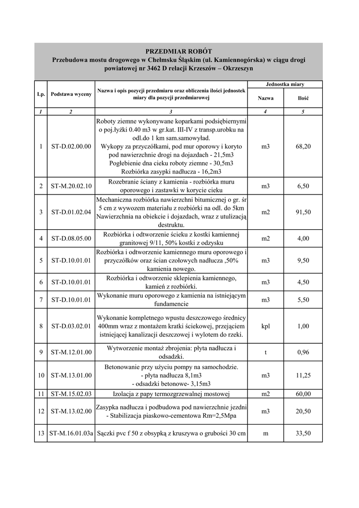 PRZEDMIAR ROBÓT Przebudowa mostu drogowego w Chełmsku Śląskim (ul. Kamiennogórska) w ciągu drogi powiatowej nr 3462 D relacji Krzeszów – Okrzeszyn Jednostka miary Lp. Podstawa wyceny Nazwa i opis pozycji przedmiaru oraz obliczenia ilości jednostek miary dla pozycji przedmiarowej 1 2 3 Nazwa Ilość 4 5 m3 68,20 m3 6,50 m2 91,50 m2 4,00 m3 9,50 m3 4,50 m3 5,50 kpl 1,00 Wytworzenie montaŜ zbrojenia: płyta nadłucza i odsadzki. t 0,96 10 ST-M.13.01.00 Betonowanie przy uŜyciu pompy na samochodzie. - płyta nadłucza 8,1m3 - odsadzki betonowe- 3,15m3 m3 11,25 11 ST-M.15.02.03 Izolacja z papy termozgrzewalnej mostowej m2 60,00 12 ST-M.13.02.00 Zasypka nadłucza i podbudowa pod nawierzchnie jezdni - Stabilizacja piaskowo-cementowa Rm=2,5Mpa m3 20,50 13 ST-M.16.01.03a Sączki pvc f 50 z obsypką z kruszywa o grubości 30 cm m 33,50 1 Roboty ziemne wykonywane koparkami podsiębiernymi o poj.łyŜki 0.40 m3 w gr.kat. III-IV z transp.urobku na odl.do 1 km sam.samowyład. ST-D.02.00.00 Wykopy za przyczółkami, pod mur oporowy i koryto pod nawierzchnie drogi na dojazdach - 21,5m3 Pogłebienie dna cieku roboty ziemne - 30,5m3 Rozbiórka zasypki nadłucza - 16,2m3 2 ST-M.20.02.10 3 ST-D.01.02.04 4 ST-D.08.05.00 5 ST-D.10.01.01 6 ST-D.10.01.01 7 ST-D.10.01.01 8 Wykonanie kompletnego wpustu deszczowego średnicy ST-D.03.02.01 400mm wraz z montaŜem kratki ściekowej, przejąciem istniejącej kanalizacji deszczowej i wylotem do rzeki. 9 ST-M.12.01.00 Rozebranie ściany z kamienia - rozbiórka muru oporowego i zastawki w korycie cieku Mechaniczna rozbiórka nawierzchni bitumicznej o gr. śr 5 cm z wywozem materiału z rozbiórki na odl. do 5km Nawierzchnia na obiekcie i dojazdach, wraz z utulizacją destruktu. Rozbiórka i odtworzenie ścieku z kostki kamiennej granitowej 9/11, 50% kostki z odzysku Rozbiórka i odtworzenie kamiennego muru oporowego i przyczółków oraz ścian czołowych nadłucza ,50% kamienia nowego. Rozbiórka i odtworzenie sklepienia kamiennego, kamień z rozbiórki. Wykonanie muru oporowego z kamienia na istniejącym fundamencie Zasypanie wykopów pospółką z zagęszczeniem 14 ST-D.02.03.01d (wypełnienie przestrzeni za murem oporowym i przyczółkami) Wykonanie spoinowania murów kamiennych 15 ST-D.10.01.01 (spoinowanie przyczółków, podniebienia łuku i murów oporowych) 16 ST-D.04.04.04 Podbudowa z kruszyw łamanych gr. 20 cm m3 10,25 m2 58,00 m2 57,00 17 ST-D.05.03.05 Nawierzchnie z mieszanek mineralno-bitumicznych asfaltowych o grubości 6 cm (warstwa wiąŜąca) m2 91,50 18 ST-D.05.03.05 Skropienie asfaltem nawierzchni drogowych: m2 91,50 19 ST-D.05.03.05 Nawierzchnie z mieszanek mineralno-bitumicznych asfaltowych o grubości 4 cm (warstwa ścieralna) m2 96,50 t 0,41 m2 68,50 m 14,20 Wykonanie i montaŜ balustrad na moście wraz z malowaniem Umocnienie dna narzutem kamiennym wraz z dostawą i ST-D.06.01.02 montaŜem dyli drewnianych. ST-D.08.01.01 KrawęŜnik betonowy 15x20 20 ST-M.14.02.01 21 22