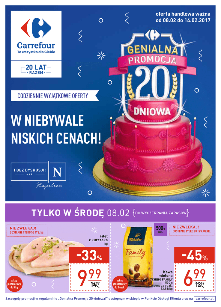 Szczegóły promocji w regulaminie „Genialna Promocja 20-dniowa!” dostępnym w sklepie w Punkcie Obsługi Klienta oraz na carrefour.pl