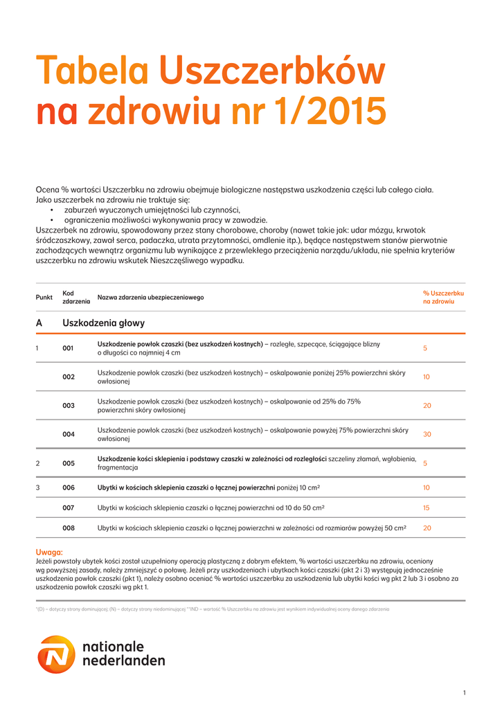 Tabela Uszczerbków na zdrowiu nr 1/2015 Ocena % wartości Uszczerbku na zdrowiu obejmuje biologiczne następstwa uszkodzenia części lub całego ciała. Jako uszczerbek na zdrowiu nie traktuje się: • zaburzeń wyuczonych umiejętności lub czynności, • ograniczenia możliwości wykonywania pracy w zawodzie. Uszczerbek na zdrowiu, spowodowany przez stany chorobowe, choroby (nawet takie jak: udar mózgu, krwotok śródczaszkowy, zawał serca, padaczka, utrata przytomności, omdlenie itp.), będące następstwem stanów pierwotnie zachodzących wewnątrz organizmu lub wynikające z przewlekłego przeciążenia narządu/układu, nie spełnia kryteriów uszczerbku na zdrowiu wskutek Nieszczęśliwego wypadku. Punkt Kod zdarzenia A Uszkodzenia głowy 1 001 Uszkodzenie powłok czaszki (bez uszkodzeń kostnych) – rozległe, szpecące, ściągające blizny o długości co najmniej 4 cm 5 002 Uszkodzenie powłok czaszki (bez uszkodzeń kostnych) – oskalpowanie poniżej 25% powierzchni skóry owłosionej 10 003 Uszkodzenie powłok czaszki (bez uszkodzeń kostnych) – oskalpowanie od 25% do 75% powierzchni skóry owłosionej 20 004 Uszkodzenie powłok czaszki (bez uszkodzeń kostnych) – oskalpowanie powyżej 75% powierzchni skóry owłosionej 30 2 005 Uszkodzenie kości sklepienia i podstawy czaszki w zależności od rozległości szczeliny złamań, wgłobienia, 5 fragmentacja 3 006 Ubytki w kościach sklepienia czaszki o łącznej powierzchni poniżej 10 cm² 10 007 Ubytki w kościach sklepienia czaszki o łącznej powierzchni od 10 do 50 cm² 15 008 Ubytki w kościach sklepienia czaszki o łącznej powierzchni w zależności od rozmiarów powyżej 50 cm² 20 Nazwa zdarzenia ubezpieczeniowego % Uszczerbku na zdrowiu Uwaga: Jeżeli powstały ubytek kości został uzupełniony operacją plastyczną z dobrym efektem, % wartości uszczerbku na zdrowiu, oceniony wg powyższej zasady, należy zmniejszyć o połowę. Jeżeli przy uszkodzeniach i ubytkach kości czaszki (pkt 2 i 3) występują jednocześnie uszkodzenia powłok czaszki (pkt 1), należy osobno oceniać % wartości uszczerbku za uszkodzenia lub ubytki kości wg pkt 2 lub 3 i osobno za uszkodzenia powłok czaszki wg pkt 1. *(D) – dotyczy strony dominującej; (N) – dotyczy strony niedominującej **IND – wartość % Uszczerbku na zdrowiu jest wynikiem indywidualnej oceny danego zdarzenia 1 Kod zdarzenia Nazwa zdarzenia ubezpieczeniowego % Uszczerbku na zdrowiu 4 009 Utrwalone, utrzymujące się mimo prawidłowego leczenia, powikłania towarzyszące uszkodzeniom wymienionym w punktach 1, 2, 3 w postaci: nawracającego, mimo leczenia operacyjnego, płynotoku usznego lub nosowego, przewlekłego zapalenia kości, ropowicy podczepcowej leczonej operacyjnie – należy uszczerbek zwiększyć o 10% 10 5 010 Porażenia i niedowłady pochodzenia mózgowego: porażenie połowicze, porażenie kończyn dolnych uniemożliwiające samodzielne stanie i chodzenie 0–1° wg skali Lovette’a 100 011 Porażenia i niedowłady pochodzenia mózgowego: głęboki niedowład połowiczy lub obu kończyn dolnych, znacznie utrudniający sprawność kończyn 2° lub 2/3° wg skali Lovette’a 80 012 Porażenia i niedowłady pochodzenia mózgowego: średniego stopnia niedowład połowiczy lub niedowład obu kończyn dolnych 3° lub 3/4° wg skali Lovette’a 60 013 Porażenia i niedowłady pochodzenia mózgowego: nieznacznego stopnia (niewielki, dyskretny) niedowład połowiczy lub obu kończyn dolnych 4° lub 4/5° wg skali Lovette’a, dyskretny deficyt siły przy obecności zaburzeń napięcia mięśniowego, niedostateczności precyzji ruchów itp. 40 014 Porażenia i niedowłady pochodzenia mózgowego: porażenie kończyny górnej 0–1° wg skali Lovette’a, z niedowładem kończyny dolnej 3–4° wg skali Lovette’a (D)* 80 015 Porażenia i niedowłady pochodzenia mózgowego: porażenie kończyny górnej 0–1° wg skali Lovette’a, z niedowładem kończyny dolnej 3–4° wg skali Lovette’a (N)* 70 016 Porażenia i niedowłady pochodzenia mózgowego: niedowład kończyny górnej 3–4° wg skali Lovette’a, z porażeniem kończyny dolnej 0–1° wg skali Lovette’a: (D)* 80 017 Porażenia i niedowłady pochodzenia mózgowego: niedowład kończyny górnej 3–4° wg skali Lovette’a z porażeniem kończyny dolnej 0–1° wg skali Lovette’a (N)* 70 018 Porażenia i niedowłady pochodzenia mózgowego: monoparezy pochodzenia ośrodkowego dotyczące kończyny górnej 0–1° wg skali Lovette’a (D)* 50 019 Porażenia i niedowłady pochodzenia mózgowego: monoparezy pochodzenia ośrodkowego dotyczące kończyny górnej 0–1° wg skali Lovette’a (N)* 40 020 Porażenia i niedowłady pochodzenia mózgowego: monoparezy pochodzenia ośrodkowego dotyczące kończyny górnej 2°–2/3 ° wg skali Lovette’a (D)* 40 021 Porażenia i niedowłady pochodzenia mózgowego: monoparezy pochodzenia ośrodkowego dotyczące kończyny górnej 2°–2/3 ° wg skali Lovette’a (N)* 30 022 Porażenia i niedowłady pochodzenia mózgowego: monoparezy pochodzenia ośrodkowego dotyczące kończyny górnej 3–4° wg skali Lovette’a (D)* 25 023 Porażenia i niedowłady pochodzenia mózgowego: monoparezy pochodzenia ośrodkowego dotyczące kończyny górnej 3–4° wg skali Lovette’a (N)* 15 024 Porażenia i niedowłady pochodzenia mózgowego: monoparezy pochodzenia ośrodkowego dotyczące kończyny dolnej 0–1° wg skali Lovette’a 45 025 Porażenia i niedowłady pochodzenia mózgowego: monoparezy pochodzenia ośrodkowego dotyczące kończyny dolnej 2–2/3° wg skali Lovette’a 30 026 Porażenia i niedowłady pochodzenia mózgowego: monoparezy pochodzenia ośrodkowego dotyczące kończyny dolnej 3–3/4 ° wg skali Lovette’a 20 027 Porażenia i niedowłady pochodzenia mózgowego: monoparezy pochodzenia ośrodkowego dotyczące kończyny dolnej 4–4/5° wg skali Lovette’a 10 Punkt *(D) – dotyczy strony dominującej; (N) – dotyczy strony niedominuj