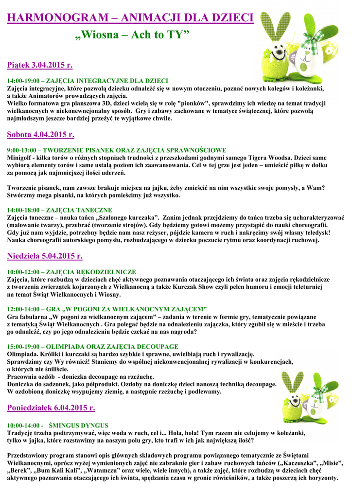 HARMONOGRAM – ANIMACJI DLA DZIECI „Wiosna – Ach to TY” Piątek 3.04.2015 r. 14:00-19:00 – ZAJĘCIA INTEGRACYJNE DLA DZIECI Zajęcia integracyjne, które pozwolą dziecku odnaleźć się w nowym otoczeniu, poznać nowych kolegów i koleżanki, a także Animatorów prowadzących zajęcia. Wielko formatowa gra planszowa 3D, dzieci wcielą się w rolę "pionków", sprawdzimy ich wiedzę na temat tradycji wielkanocnych w niekonewncjonalny sposób. Gry i zabawy zachowane w tematyce świątecznej, które pozwolą najmłodszym jeszcze bardziej przeżyć te wyjątkowe chwile. Sobota 4.04.2015 r. 9:00-13:00 – TWORZENIE PISANEK ORAZ ZAJĘCIA SPRAWNOŚCIOWE Minigolf - kilka torów o różnych stopniach trudności z przeszkodami godnymi samego Tigera Woodsa. Dzieci same wybiorą elementy torów i same ustalą poziom ich zaawansowania. Cel w tej grze jest jeden – umieścić piłkę w dołku za pomocą jak najmniejszej ilości uderzeń. Tworzenie pisanek, nam zawsze brakuje miejsca na jajku, żeby zmieścić na nim wszystkie swoje pomysły, a Wam? Stwórzmy mega pisanki, na których pomieścimy już wszystko. 14:00-18:00 – ZAJĘCIA TANECZNE Zajęcia taneczne – nauka tańca „Szalonego kurczaka”. Zanim jednak przejdziemy do tańca trzeba się ucharakteryzować (malowanie twarzy), przebrać (tworzenie strojów). Gdy będziemy gotowi możemy przystąpić do nauki choreografii. Gdy już nam wyjdzie, potrzebny będzie nam nasz reżyser, pójdzie kamera w ruch i nakręcimy swój własny teledysk! Nauka choreografii autorskiego pomysłu, rozbudzającego w dziecku poczucie rytmu oraz koordynacji ruchowej. Niedziela 5.04.2015 r. 10:00-12:00 – ZAJĘCIA RĘKODZIELNICZE Zajęcia, które rozbudzą w dzieciach chęć aktywnego poznawania otaczającego ich świata oraz zajęcia rękodzielnicze z tworzenia zwierzątek kojarzonych z Wielkanocną a także Kurczak Show czyli pełen humoru i emocji teleturniej na temat Świąt Wielkanocnych i Wiosny. 12:00-14:00 – GRA „W POGONI ZA WIELKANOCNYM ZAJĄCEM” Gra fabularna „W pogoni za wielkanocnym zającem” – zadania w terenie w formie gry, tematycznie powiązane z tematyką Świąt Wielkanocnych . Gra polegać będzie na odnalezieniu zajączka, który zgubił się w mieście i trzeba go odnaleźć, czy po jego odnalezieniu będzie czekać na nas nagroda? 15:00-19:00 – OLIMPIADA ORAZ ZAJĘCIA DECOUPAGE Olimpiada. Króliki i kurczaki są bardzo szybkie i sprawne, uwielbiają ruch i rywalizację. Sprawdzimy czy Wy również! Staniemy do wspólnej niekonwencjonalnej rywalizacji w konkurencjach, o których nie śniliście. Pracownia ozdób - doniczka decoupage na rzeżuchę. Doniczka do sadzonek, jako półprodukt. Ozdoby na doniczkę dzieci nanoszą techniką decoupage. W ozdobioną doniczkę wsypujemy ziemię, a następnie rzeżuchę i podlewamy. Poniedziałek 6.04.2015 r. 10:00-14:00 - ŚMINGUS DYNGUS Tradycję trzeba podtrzymywać, więc woda w ruch, cel i... Hola, hola! Tym razem nie celujemy w koleżanki, tylko w jajka, które rozstawimy na naszym polu gry, kto trafi w ich jak największą ilość? Przedstawiony program stanowi opis głównych składowych programu powiązanego tematycznie ze Świętami Wielkanocnymi, oprócz wyżej wymienionych zajęć nie zabraknie gier i zabaw ruchowych tańców („Kaczuszka”, „Misie”, „Berek”, „Bum Kali Kali”, „Watamczu” oraz wiele, wiele innych), a także zajęć, które rozbudzą w dzieciach chęć aktywnego poznawania otaczającego ich świata, spędzania czasu w gronie rówieśników, a także poszerzą ich horyzonty.