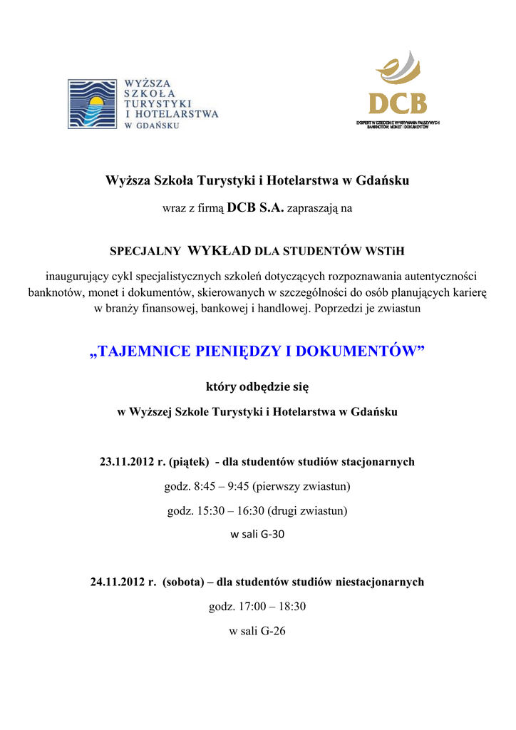 WyŜsza Szkoła Turystyki i Hotelarstwa w Gdańsku wraz z firmą DCB S.A. zapraszają na SPECJALNY WYKŁAD DLA STUDENTÓW WSTiH inaugurujący cykl specjalistycznych szkoleń dotyczących rozpoznawania autentyczności banknotów, monet i dokumentów, skierowanych w szczególności do osób planujących karierę w branŜy finansowej, bankowej i handlowej. Poprzedzi je zwiastun „TAJEMNICE PIENIĘDZY I DOKUMENTÓW” który odbędzie się w WyŜszej Szkole Turystyki i Hotelarstwa w Gdańsku 23.11.2012 r. (piątek) - dla studentów studiów stacjonarnych godz. 8:45 – 9:45 (pierwszy zwiastun) godz. 15:30 – 16:30 (drugi zwiastun) w sali G-30 24.11.2012 r. (sobota) – dla studentów studiów niestacjonarnych godz. 17:00 – 18:30 w sali G-26 PIENIĄDZE…..Budzą poŜądanie i zazdrość. Bywaj motywem zbrodni, ale teŜ skłaniają do działań szlachetnych… Jako środek płatniczy towarzyszą człowiekowi od wieków, są uniwersalnym miernikiem wartości towarów i usług. W swojej konstrukcji dąŜące do ideału, aczkolwiek ciągle jeszcze niedoskonałe… Jak wiele tajemnic jeszcze skrywają przed nami? DOKUMENTY…określają naszą toŜsamość, kluczowe informacje i dane. Mogą przynieść fortunę a ich nierozsądne uŜywanie moŜe ściągnąć spore kłopoty…. Co kryją w sobie dokumenty? W programie: • PodróŜ w czasie i przestrzeni – historia pieniądza w skrócie, czyli od denara do dolara. Jak ewoluował i rozprzestrzeniał się on po kuli ziemskiej. • Fałszerstwo – zbrodnia prawie doskonała? Motywy, oczekiwania i sposoby fałszerzy pieniędzy. • Najsławniejsze fałszerstwa w dziejach. • Budowa banknotu – konstrukcja zabezpieczeń świadczących o oryginalności znaku pienięŜnego. • Zabezpieczenia dokumentów toŜsamości potwierdzające autentyczność. • Co mi zrobisz jak mnie złapiesz? Odpowiedzialność z tytułu Kodeksu Karnego za produkcję, rozpowszechnianie i nieświadome wprowadzenie w obieg falsyfikatu oraz co grozi za podrabianie dokumentów i podszywanie się pod inną osobę. • Social Responsibility - jeden za wszystkich wszyscy za jednego. Jak obywatelska postawa i uczciwość mogą przyczynić się do zwiększenia bezpieczeństwa finansowego i prawnego na rynku. • Kasjer – ikona zaufania publicznego czy wróg publiczny nr 1? Idąc do mechanika, informatyka, czy lekarza wierzysz, Ŝe jest fachowcem i zna się na rzeczy. Czy moŜesz ufać kasjerom i jednocześnie wymagać specjalistycznej wiedzy z zakresu precyzyjnego określania oryginalności pieniędzy? W arkana wiedzy wprowadzi nas DCB S.A. – ekspert w dziedzinie wykrywania fałszywych banknotów, monet i dokumentów, który zajmuje się profesjonalnymi szkoleniami z zakresu rozpoznawania autentyczności zabezpieczeń znaków pienięŜnych. Dodatkowo: • Punkt badania autentyczności banknotów – bezpłatnie sprawdź, co masz w portfelu • Zapisz się na jedno z oferowanych przez nas szkoleń i zgarnij 1. 000. 000 $ dolarów Wszystkich zainteresowanych tematyką autentyczności pieniędzy i zabezpieczeń stosowanych w banknotach i dokumentach zapraszamy do udziału w szkoleniach zorganizowanych przy współpracy Wielkopolskiej WyŜszej Szkoły Społeczno - Ekonomicznej oraz firmy DCB S.A. pod hasłem „Tajemnice pieniędzy i dokumentów”, w czasie których zdobędziecie wiedzę praktyczną i teoretyczną , potwierdzoną zaświadczeniem, wymaganym w niejednej pracy. TuŜ po wykładzie będzie moŜna zapisać się na udział w wybranym szkoleniu: • Szkolenie podstawowe z PLN i EUR • Szkolenie z rozpoznawania autentyczności dokumentów • Kurs Kasjer złotowy z certyfikatem Tego dnia obowiązywać będą specjalne ceny i prezenty Szczegóły u organizatora oraz w Sekcji Kształcenia WSTiH (tel. 520 26 14 w. 165; [email protected]). ZAPRASZAMY. ZAINWESTUJ W SWÓJ ROZWÓJ I LEPSZY START NA DRODZE KARIERY. ZADBAJ O SIEBIE I SWOJE BEZPIECZEŃSTWO.