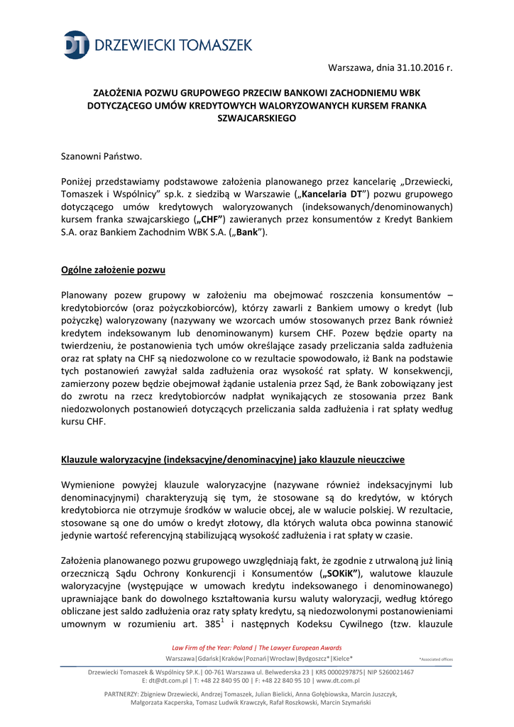 Warszawa, dnia 31.10.2016 r. ZAŁOŻENIA POZWU GRUPOWEGO PRZECIW BANKOWI ZACHODNIEMU WBK DOTYCZĄCEGO UMÓW KREDYTOWYCH WALORYZOWANYCH KURSEM FRANKA SZWAJCARSKIEGO Szanowni Państwo. Poniżej przedstawiamy podstawowe założenia planowanego przez kancelarię „Drzewiecki, Tomaszek i Wspólnicy” sp.k. z siedzibą w Warszawie („Kancelaria DT”) pozwu grupowego dotyczącego umów kredytowych waloryzowanych (indeksowanych/denominowanych) kursem franka szwajcarskiego („CHF”) zawieranych przez konsumentów z Kredyt Bankiem S.A. oraz Bankiem Zachodnim WBK S.A. („Bank”). Ogólne założenie pozwu Planowany pozew grupowy w założeniu ma obejmować roszczenia konsumentów – kredytobiorców (oraz pożyczkobiorców), którzy zawarli z Bankiem umowy o kredyt (lub pożyczkę) waloryzowany (nazywany we wzorcach umów stosowanych przez Bank również kredytem indeksowanym lub denominowanym) kursem CHF. Pozew będzie oparty na twierdzeniu, że postanowienia tych umów określające zasady przeliczania salda zadłużenia oraz rat spłaty na CHF są niedozwolone co w rezultacie spowodowało, iż Bank na podstawie tych postanowień zawyżał salda zadłużenia oraz wysokość rat spłaty. W konsekwencji, zamierzony pozew będzie obejmował żądanie ustalenia przez Sąd, że Bank zobowiązany jest do zwrotu na rzecz kredytobiorców nadpłat wynikających ze stosowania przez Bank niedozwolonych postanowień dotyczących przeliczania salda zadłużenia i rat spłaty według kursu CHF. Klauzule waloryzacyjne (indeksacyjne/denominacyjne) jako klauzule nieuczciwe Wymienione powyżej klauzule waloryzacyjne (nazywane również indeksacyjnymi lub denominacyjnymi) charakteryzują się tym, że stosowane są do kredytów, w których kredytobiorca nie otrzymuje środków w walucie obcej, ale w walucie polskiej. W rezultacie, stosowane są one do umów o kredyt złotowy, dla których waluta obca powinna stanowić jedynie wartość referencyjną stabilizującą wysokość zadłużenia i rat spłaty w czasie. Założenia planowanego pozwu grupowego uwzględniają fakt, że zgodnie z utrwaloną już linią orzeczniczą Sądu Ochrony Konkurencji i Konsumentów („SOKiK”), walutowe klauzule waloryzacyjne (występujące w umowach kredytu indeksowanego i denominowanego) uprawniające bank do dowolnego kształtowania kursu waluty waloryzacji, według którego obliczane jest saldo zadłużenia oraz raty spłaty kredytu, są niedozwolonymi postanowieniami umownym w rozumieniu art. 3851 i następnych Kodeksu Cywilnego (tzw. klauzule Law Firm of the Year: Poland | The Lawyer European Awards Warszawa|Gdańsk|Kraków|Poznań|Wrocław|Bydgoszcz*|Kielce* Drzewiecki Tomaszek & Wspólnicy SP.K.| 00-761 Warszawa ul. Belwederska 23 | KRS 0000297875| NIP 5260021467 E: [email protected] | T: +48 22 840 95 00 | F: +48 22 840 95 10 | www.dt.com.pl PARTNERZY: Zbigniew Drzewiecki, Andrzej Tomaszek, Julian Bielicki, Anna Gołębiowska, Marcin Juszczyk, Małgorzata Kacperska, Tomasz Ludwik Krawczyk, Rafał Roszkowski, Marcin Szymański *Associated offices Pozew grupowy BZ WBK – informacje wstępne 31 października 2016 r. abuzywne). Takie postanowienia, zgodnie z art. 3851 § 1 Kodeksu Cywilnego, są sprzeczne z dobrymi obyczajami i rażąco naruszają interes konsumenta. Powyższe stanowisko zajął w szeregu wyroków SOKiK, Sąd Apelacyjny w Warszawie, a także Sąd Najwyższy, a w oficjalnych dokumentach stanowisko takie prezentuje Prezes Urzędu Ochrony Konkurencji i Konsumentów, Rzecznik Praw Obywatelskich oraz Rzecznik Finansowy. Klauzule waloryzacyjne (indeksacyjne/denominacyjne) w umowach Kredyt Bank S.A. oraz BZ WBK S.A. W ocenie Kancelarii DT wzorce umowne stosowane przez Kredyt Bank S.A. oraz BZ WBK S.A. zawierają niedozwolone postanowienia umowne w rozumieniu opisanym powyżej. W umowach kredytowych stosowanych przez Bank, które przeanalizowała Kancelaria DT, przewidziano bowiem, że salda zadłużenia oraz raty spłaty kredytu przeliczane są według kursu CHF określonego w tabeli kursów walut obcych obowiązującej w Banku. Umowy kredytowe Banku nie określają zarazem sposobu ustalania kursu waluty obcej, co oznacza, że Bank ustalał ów kurs w sposób dowolny, w tym również w zakresie wysokości spreadu walutowego. Skutki stosowania klauzul umowach kredytowych waloryzacyjnych (indeksacyjnych/denominacyjnych) w Następstwem uznania stosowanych przez Bank klauzul za niedozwolone w rozumieniu art. 3851 § 1 Kodeksu Cywilnego jest to, że nie wiążą one konsumenta (od chwili zawarcia umowy), a zarazem strony są związane umową w pozostałym zakresie. Stanowisko takie potwierdza jednoznacznie również Trybunał Sprawiedliwości Unii Europejskiej w jednolitym orzecznictwie. Skutek taki oznacza, że saldo zadłużenia i wysokość rat spłaty kredytu powinny być ustalane bez przeliczania na walutę obcą, a jednocześnie w mocy pozostają wskazane w umowie zasady oprocentowania kredytu i marży (oprocentowanie pozostaje oparte o LIBOR dla CHF). Fakt, że Bank wykonywał umowy kredytowe, stosując postanowienia kursowe, które nie wiązały konsumentów, powodował, że Bank zawyżał saldo zadłużenia oraz raty spłaty. Oznacza to jednocześnie, że pobieranie dotychczasowych rat w zawyżonej wysokości doprowadziło do powstania po stronie kredytobiorców nadpłaty, która stanowi nienależne świadczenie na rzecz Banku. Na tej samej zasadzie Bank powinien pobierać niższe raty w przyszłości oraz wykazywać niższe saldo zadłużenia niż wynikające z waloryzacji (indeksowania lub denominowania). Opisany powyżej stan rzeczy w ocenie Kancelarii DT stanowi podstawę do wystąpienia wobec Banku z roszczeniem o zwrot nienależnego świadczenia na podstawie art. 405 i 410 Kodeksu Cywilnego, zgodnie z którymi - kto bez podstawy prawnej uzyskał korzyść majątkową kosztem innej osoby, obowiązany jest do jej zwrotu, co dotyczy w szczególności świadczenia nienależnego. 2 Pozew grupowy BZ WBK 