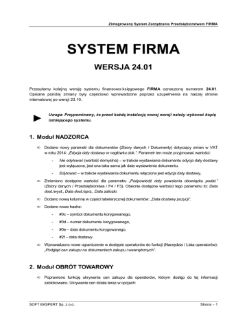 Zintegrowany System Zarządzania Przedsiębiorstwem FIRMA SYSTEM FIRMA WERSJA 24.01 Przesyłamy kolejną wersję systemu finansowo-księgowego FIRMA oznaczoną numerem 24.01. Opisane poniżej zmiany były częściowo wprowadzone poprzez uzupełnienia na naszej stronie internetowej po wersji 23.10. ► Uwaga: Przypominamy, że przed każdą instalacją nowej wersji należy wykonać kopię istniejącego systemu. 1. Moduł NADZORCA • Dodano nowy parametr dla dokumentów (Zbiory danych / Dokumenty) dotyczący zmian w VAT w roku 2014: „Edycja daty dostawy w nagłówku dok.”. Parametr ten może przyjmować wartości: - Nie edytować (wartość domyślna) – w trakcie wystawiania dokumentu edycja daty dostawy jest wyłączona, jest ona taka sama jak data wystawienia dokumentu. - Edytować – w trakcie wystawiania dokumentu włączona jest edycja daty dostawy, • Zmieniono dostępne wartości dla parametru „Podpowiedź daty powstania obowiązku podat.” (Zbiory danych / Przedsiębiorstwa / F4 / F3). Obecnie dostępne wartości tego parametru to: Data dost./wyst., Data dost./sprz., Data zaliczki. • Dodano nową kolumnę w części tabelarycznej dokumentów: „Data dostawy pozycji”. • Dodano nowe hashe: • - #0c – symbol dokumentu korygowanego, - #0d – numer dokumentu korygowanego, - #0e – data dokumentu korygowanego, - #2f – data dostawy. Wprowadzono nowe ograniczenie w dostępie operatorów do funkcji (Narzędzia / Lista operatorów): „Podgląd cen zakupu na dokumentach zakupu i wewnętrznych”. 2. Moduł OBRÓT TOWAROWY • Poprawiono funkcję ukrywania cen zakupu dla operatorów, którym dostęp do tej informacji zablokowano. Ukrywanie cen działa teraz w opcjach: SOFT EKSPERT Sp. z o.o. Strona − 1 Zintegrowany System Zarządzania Przedsiębiorstwem FIRMA - Podgląd marży dla pozycji (ALT+T) w trakcie edycji dokumentów sprzedaży, - Kontrola sprzedaży poniżej cen zakupu w trakcie edycji dokumentów sprzedaży, - Podglądu cen zakupu w przeglądzie przedmiotów obrotu. • Dodano nowy parametr (Narzędzia / Parametry / Dokumentów 2): „Inwentaryzacja - dodawanie towaru czytnikiem kodów wg FIFO”. Po jego ustawieniu na TAK, gdy towar zostanie znaleziony czytnikiem kodów kreskowych, pojawia się okienko z informacją o towarze i możliwością wpisania dla niego ilości. Po zatwierdzeniu program dodaje pozycje do inwentaryzacji zgodnie z FIFO. • W trakcie wystawiania paragonów poprawiono opcję ściągania danych z ofert i zamówień. • W trakcie wystawiania dokumentu inwentaryzacji poprawiono działanie opcji wyszukiwania (ALT+W). • Poprawiono opcję dodawania pojedynczego towaru do listy towarowej kolektora danych. • Wprowadzono modyfikacje dotyczące zmian w ustawie o VAT w roku 2014: - Strona − 2 Sprzedaż - w nagłówku dokumentu dodano pole z datą dostawy. W zależności od ustawienia parametru w module NADZORCA, można ustawić je jako do edycji lub nie. W związku z powyższą zmianą uległ zmianie również sposób wyświetlania i edycji danych dotyczących podpowiedzi bonifikaty dla dokumentu: i. Wystawianie dokumentu bez możliwości edycji daty dostawy. Data dostawy przyjmowana jest taka sama, jak data wystawienia dokumentu. Dokument po przesłaniu do modułu VAT ma wpływ na obliczenie podatku należnego. Gdy na dokument ściągamy dostawy (w-zetki), wówczas data dostawy dokumentu zmienia się na pustą. Taki dokument nie ma wpływu na obliczenie podatku naliczonego w VAT (nawet po przesłaniu do VAT). ii. Wystawianie dokumentu z możliwością edycji daty dostawy. Jeżeli data dostawy w nagłówku zostanie wypełniona, dokument automatycznie staje się dokumentem dostawy. Po przesłaniu do VAT ma wpływ na obliczenie podatku należnego. Ściągnięcie na taki dokument innych dostaw (w-zetek) spowoduje, że traci on status dostawy. Dokument nie będzie miał wpływu na wyliczenie podatku należnego. Ściągnięcie dostaw na taki dokument spowoduje wyzerowanie daty dostawy w jego nagłówku. Pozostawienie pustej daty dostawy umożliwia wystawianie tzw. faktury zbiorczej, składającej się z jednej lub kilku dostaw. W tym przypadku datę dostawy wypełnia się w pozycjach dokumentu. Wypełnienie daty dla pozycji spowoduje, że po zapisaniu dokumentu zbiorczego (bez wypełnionej daty dostawy w nagłówku) program umożliwi utworzenie dokumentów dostaw dla pozycji z jednakowymi datami dostawy. Użytkownik ma możliwość wpisania daty dostawy w pozycjach dokumentu przez naciśnięcie klawisza <F2>. Wprowadzana jest wówczas data systemowa komputera. Wygenerowane w ten sposób dostawy będą miały wpływ na wyliczenie podatku należnego. Faktura zbiorcza (dokument zbiorczy) nie ma takiej SOFT EKSPERT Sp. z o.o. Zintegrowany System Zarządzania Przedsiębiorstwem FIRMA możliwości. Dokument dostawy jak też dokument zbiorczy ma możliwość wydrukowania daty dostawy pozycji w tabeli towarów. - Zakup - do VAT przesyłane są dokumenty z wypełnionym symbolem i numerem dokumentu obcego. Taki dokument ma wpływ na wyliczenie podatku naliczonego. • Dodano nową kolumnę w części tabelarycznej dokumentów: „Data dostawy pozycji”. • Dodano nowe hashe: - #0c – symbol dokumentu korygowanego, - #0d – numer dokumentu korygowanego, - #0e – data dokumentu korygowanego, - #2f – data dostawy. 3. Moduł VAT • Wprowadzono modyfikacje w pliku e-deklaracji VAT-7 / VAT-7K. Dodano eksport numeru telefonu. • Wprowadzono modyfikacje związane ze zmianami w ustawie o VAT w roku 2014: - W roku 2014 wprowadzono możliwość wypełnienia daty dostawy w dokumencie wprowadzanym do ewidencji. W związku z powyższym zmieniają się zasady rozliczeń podatku VAT: i. Sprzedaż - do obliczenia podatku należnego będą brane pod uwagę tylko dokumenty zaliczkowe, korekty oraz dokumenty z wypełnioną datą dostawy. ii. Zakup - podatek naliczony będzie naliczany dla wszystkich dokumentów w ewidencji, wprowadzonych po stronie nabyć. - Dok