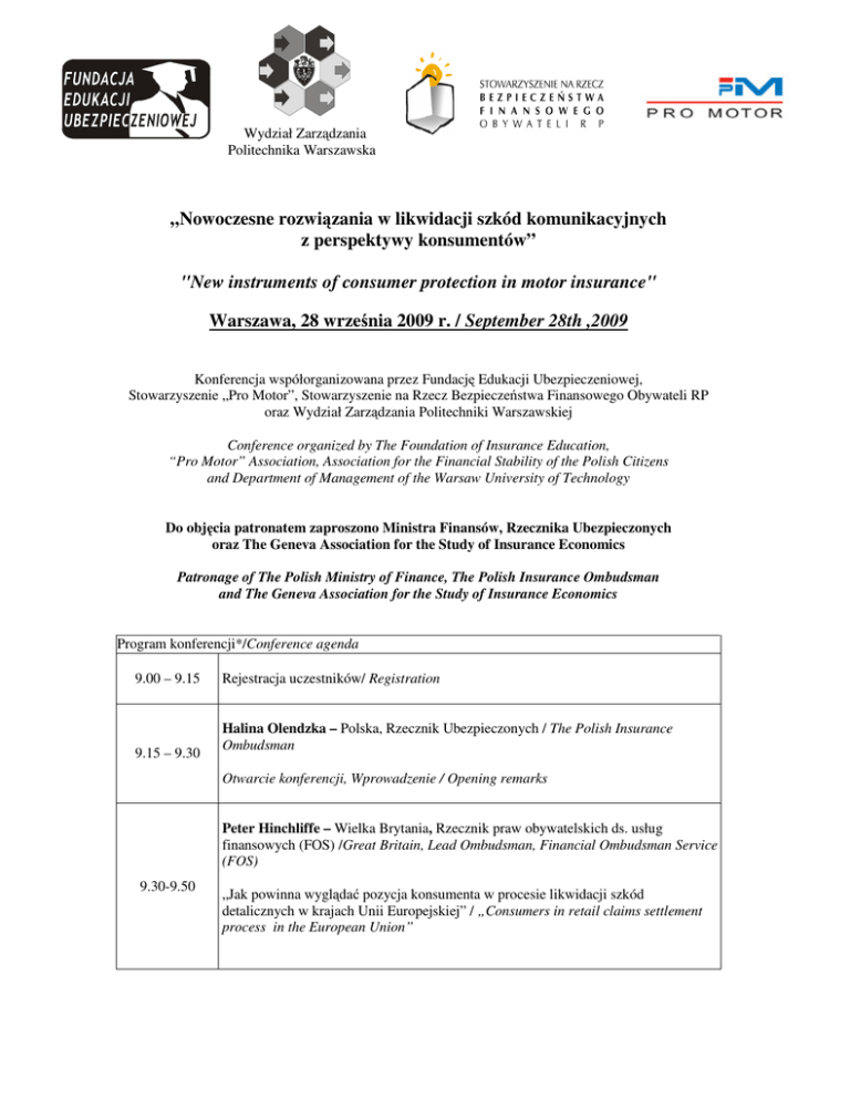 Wydział Zarządzania Politechnika Warszawska „Nowoczesne rozwiązania w likwidacji szkód komunikacyjnych z perspektywy konsumentów” "New instruments of consumer protection in motor insurance" Warszawa, 28 września 2009 r. / September 28th ,2009 Konferencja współorganizowana przez Fundację Edukacji Ubezpieczeniowej, Stowarzyszenie „Pro Motor”, Stowarzyszenie na Rzecz Bezpieczeństwa Finansowego Obywateli RP oraz Wydział Zarządzania Politechniki Warszawskiej Conference organized by The Foundation of Insurance Education, “Pro Motor” Association, Association for the Financial Stability of the Polish Citizens and Department of Management of the Warsaw University of Technology Do objęcia patronatem zaproszono Ministra Finansów, Rzecznika Ubezpieczonych oraz The Geneva Association for the Study of Insurance Economics Patronage of The Polish Ministry of Finance, The Polish Insurance Ombudsman and The Geneva Association for the Study of Insurance Economics Program konferencji*/Conference agenda 9.00 – 9.15 9.15 – 9.30 Rejestracja uczestników/ Registration Halina Olendzka – Polska, Rzecznik Ubezpieczonych / The Polish Insurance Ombudsman Otwarcie konferencji, Wprowadzenie / Opening remarks Peter Hinchliffe – Wielka Brytania, Rzecznik praw obywatelskich ds. usług finansowych (FOS) /Great Britain, Lead Ombudsman, Financial Ombudsman Service (FOS) 9.30-9.50 „Jak powinna wyglądać pozycja konsumenta w procesie likwidacji szkód detalicznych w krajach Unii Europejskiej” / „Consumers in retail claims settlement process in the European Union” Dariusz Daniluk – Polska, Wiceminister Finansów / Poland, Vice-Minister of Finance 9.50-10.10 10.10-10.30 „Alternatywne rozwiązania w likwidacji szkód komunikacyjnych z perspektywy regulatora” / „Regulatory perspective on alternative models of claims resolution” Przerwa kawowa / Coffee break Daniel Frala – Belgia, Dyrektor Zarządzający, DATASSUR / Belgium, Managing Director, DATASSUR „Funkcjonowanie systemu bezpośredniej likwidacji szkód w Belgii” / „Direct claims settlement system for motor third party liability insurance (MTPL) in Belgium” Paolo Panarelli – Włochy, Dyrektor Generalny Koncesjonariusza Publicznych Usług Ubezpieczeniowych (CONSAP) / Italy, General Director, Concessionaire for Public Insurance Services (CONSAP) „Architektura systemu bezpośredniej likwidacji szkód z tytułu OC posiadaczy pojazdów mechanicznych we Włoszech” / „Direct claims settlement system for motor third party liability insurance (MTPL) in Italy” 10.30-11.50 Maria Luisa Cavina – Włochy, Dyrektor Departamentu Ochrony Konsumentów, Instytut do spraw monitorowania ubezpieczeń prywatnych oraz interesów zbiorowych (ISVAP) / Italy, Director of Consumer Protection Departament, Institute for monitoring private insurance and collective interests (ISVAP) „Instrumenty ochrony konsumentów w ramach ubezpieczenia OC posiadaczy pojazdów mechanicznych we Włoszech” / „Instruments for consumer protection in motor third party liability insurance (MTPL) in Italy” Evgeny Vasilyev – Rosja, Dyrektor Departamentu Metodologii, Rosyjskie Stowarzyszenie Ubezpieczycieli Komunikacyjnych (RAMI) / Russia, Director, Russian Assocition of Motor Insurers (RAMI) „Zagadnienia bezpośredniej likwidacji szkód w Rosji” / „Direct claims settlement system in motor third party liability insurance (MTPL) – Russian experience” Eva Tidefelt – Szwecja, Departament Prawny, firma Folksam Insurance/ Sweden, Legal Department, Folksam Insurance Company “System odpowiedzialności strony pierwszej w ubezpieczeniach komunikacyjnych odpowiedzialności cywilnej w Szwecji. Założenia, problemy i implikacje” / „First Party Liability Scheme in motor third party liability insurance (MTPL) in Sweden. Concept, issues and implications” dr Katarzyna Ludwichowska – Polska, Uniwersytet Mikołaja Kopernika w Toruniu / Poland , Nicolaus Copernicus University in Toruń 11.50-12.10 12.10 – 12.40 12.40-13.10 „Optymalizacja systemu kompensacji szkód – doświadczenia międzynarodowe” / „Optimization of claims settlement systems – international perspective” Pytania i odpowiedzi / Questions and answers Obiad/Lunch Bartłomiej Chmielowiec – Polska, główny specjalista w Wydziale Prawnym Biura Rzecznika Ubezpieczonych / Poland, The Polish Insurance Ombudsman Office, Legal Departament, Head Expert 13.10-13.30 „Propozycja legislacyjna Rzecznika w odniesieniu do rzeczoznawców samochodowych” / “Legislative proposal of Insurance Ombudsman regarding certified motor experts” Mariusz Mankiewicz – Polska, Wiceprezes Zarządu firmy DEKRA Polska / Poland, Vice-President of the Management Board, DEKRA Polska Company 13.30-13.50 „Rzeczoznawstwo samochodowe w wybranych krajach UE” / Expert services in selected EU countries” Walenty Dudziak – Polska, Wiceprezes Stowarzyszenia Rzeczoznawców Techniki Samochodowej i Ruchu Drogowego „Ekspertmot” / Poland, Vice-President, Association of Certified Motor Experts „Ekspertmot” 13.50 – 14.10 „Szerzej o propozycji Rzecznika Ubezpieczonych z punktu widzenia zainteresowanych” / ”Remarks on Ombudsman’s legislative proposal” dr Marcin Orlicki – Polska, Uniwersytet im. Adama Mickiewicza w Poznaniu / Poland, Adam Mickiewicz University in Poznań 14.10 -14.30 14.30-15.00 „Ocena prawna możliwości skorzystania z systemu bezpośredniej likwidacji szkody oraz propozycji Rzecznika Ubezpieczonych odnośnie niezależnych rzeczoznawców samochodowych” / Legal assessment of direct claims settlement and certified motor expert systems” Pytania i odpowiedzi / Questions and answers Podsumowanie i zakończenie konferencji / Closing comments 15.00-15.20 Prof. dr hab. Jan Monkiewicz – Polska, Wiceprzewodniczący Stowarzyszenia „Promotor” / Poland, Vice President, Pro Motor Association Aleksander Daszewski – Polska, Prezes Fundacji Edukacji Ubezpieczeniowej /