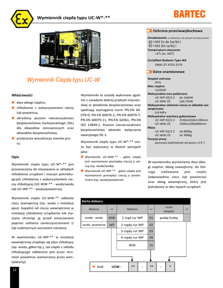 Wymiennik ciepła typu UC-W*-** Ochrona przeciwwybuchowa Oznakowanie w zależności od użytych komponentów I M2 Ex de [ia/ib] I I M2 [Ex ia/ib] I Temperatura otoczenia +40C do +400C Certyfikat Badania Typu WE OBAC 07 ATEX 257X Dane znamionowe Wymiennik Ciepła typu UC-W Właściwości dwa obiegi cieplne, chłodzenie z wykorzystaniem cieczy lub powietrza, określony poziom nienaruszalności bezpieczeństwa funkcjonalnego (SIL) dla obwodów sterowniczych oraz obwodów bezpieczeństwa, przejrzysta wizualizacja stanów pracy. Opis Wymiennik ciepła typu UC-W*-** jest przeznaczony do stosowania w układach chłodzenia urządzeń i maszyn potrzebujących chłodzenia z wykorzystaniem cieczy chłodzącej (UC-WW-** - woda/woda lub UC-WP-** - woda/powietrze). Wymiennik ciepła UC-WW-** oddziela ciecz zewnętrzną (np. woda z instalacji ppoż. kopalni) od cieczy wewnętrznej w instalacji chłodzenia urządzenia lub maszyny chroniąc ją przed zniszczeniem poprzez zatkania zanieczyszczeniami i/ lub nadmiernym wzrostem ciśnienia. Wymienniki te zostały wykonane zgodnie z zasadami dobrej praktyki inżynierskiej w dziedzinie bezpieczeństwa oraz spełniają wymagania norm PN-EN 60079-0; PN-EN 60079-1; PN-EN 60079-7; PN-EN 60079-11, PN-EN 62061, PN-EN ISO 13849-1. Poziom nienaruszalności bezpieczeństwa obwodu wyłączania awaryjnego SIL 2. Wymiennik ciepła typu UC-W*-** może być wykonany w dwóch wersjach jako: Wymiennik UC-WW-** - gdzie ciepło jest wymieniane pomiędzy cieczą a cieczą (np. woda/woda) W wymienniku wyróżniamy dwa obiegi cieplne: obieg zewnętrzny, do którego oddawane jest ciepło (odpowiednio ciecz lub powietrze) oraz obieg wewnętrzny, który jest jednakowy w obu typach urządzeń. Wymiennik UC-WP-** - gdzie ciepło jest wymieniane pomiędzy cieczą a powietrzem (np. woda/powietrze) Karta doboru Medium kod Medium kod Liczba obiegów woda - woda WW 1 rząd rur WP 01 podaj liczbę woda- powietrze WP 2 rzędy rur WP 02 3 rzędy rur WP 03 4 rzędy rur WP 04 WW 25 W wymienniku UC-WP-** w instalacji wewnętrznej znajduje się płyn chłodzący (np. woda, glikol itp.), zaś ciepło z układu chłodzącego odbierane jest przez strumień powietrza wytworzony przez wentylator(y). 12 Stopień ochrony IP55 Moc cieplna 2x25kW Maksymalna moc pobierana UC-WP-02/2.2 do 2x6kW UC-WW-25 2x0,75kW Maksymalne ciśnienie cieczy w układzie wewnętrznym 0,8 MPa Maksymalne wymiary gabarytowe UC-WP-02/2.2 2530x1650x1100mm UC-WW-25 1600x1500x600mm Masa UC-WP-02/2.2 ok 800kg UC-WW-25 ok 300kg Pozycja pracy pionowa (odchylenie od pionu ±15) Kod: UCW - ** - ** - * kod