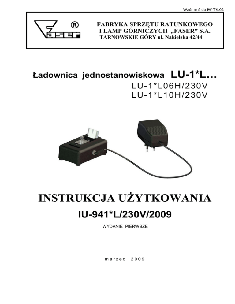 Wzór nr 5 do IW-TK.02 FABRYKA SPRZĘTU RATUNKOWEGO I LAMP GÓRNICZYCH „FASER” S.A. TARNOWSKIE GÓRY ul. Nakielska 42/44 Ładownica jednostanowiskowa LU-1*L… LU-1*L06H/230V LU-1*L10H/230V INSTRUKCJA UŻYTKOWANIA IU-941*L/230V/2009 WYDANIE PIERWSZE marzec 2009 –2– IU-941*L/230V/2009 wyd.1 1. PRZEZNACZENIE. Ładownica jednostanowiskowa LU-1*L…/230V jest uniwersalną ładownicą przeznaczoną do ładowania akumulatorów lamp nahełmnych produkcji „FASER”S.A. z akumulatorami Ni-MH o napięciu nominalnym 3,6 V. W zależności od typy ładownicy przeznaczone są do: - Ładownica LU-1*L06H/230V - do ładowania lamp nahełmnych typu LN-04, LN-IZA - Ładownica LU-1*L10H/230V - do ładowania lamp nahełmnych typu LG-3M, LG-3MH Układ elektroniczny ładownicy umożliwia pełną kontrolę przebiegu ładowania akumulatora przy pomocy systemu mikroprocesorowego. Sygnalizacja oparta na diodach LED informuje użytkownika o aktualnym stanie pracy urządzenia tj. ładowanie, lampa gotowa do pracy, awaria. UWAGA - Niebezpieczeństwo obrażenia Nigdy nie podłączaj do ładownicy akumulatorów nie przewidzianych do ładowania (np. akumulatorów litowo – jonowych) – mogą się przegrzać i wybuchnąć 2. OPIS TECHNICZNY 2.1. Dane techniczne : - ilość stanowisk do ładowania - napięcie zasilania - parametry wyjściowe zasilacza - 1 - 230 VAC / 50 Hz - 8 VDC / 1,8 A - prąd ładowania nominalny - prąd doładowania - kryterium końca ładowania - czas ładowania - 1000- 8% mA - 100 mA - - ΔV lub maksymalny czas ładowania - max 6 h (ładownica LU-1*L06H/230V) max 10 h (ładownica LU-1*L10H/230V) - minimalne napięcie akumulatora -0V (napięcie rozpoznawane przez ładowarkę) - temperatura pracy - stopień ochrony obudowy - obudowa - masa (zasilacz + moduł ładowarki) - wymiary gabarytowe (l x b x h) - -5 C +60 C IP 30 z tworzywa sztucznego (kolor czarny) 400 g (200 g + 200 g ) 120 mm x 70 mm x 73 mm (wymiary modułu ładowarki) Moduł ładowarki Nr 941A*06H Nr 941A*10H Rys. 1 Ładownica LU-1*L…/230V - widok Zasilacz impulsowy Nr FA-0530 –3– IU-941*L/230V/2009 wyd.1 2.2. Właściwości użytkowe mikroprocesorowa kontrola procesu ładowania sygnalizacja aktualnego stanu pracy ładowarki (z wyróżnieniem stanu zakończenia ładowania akumulatora – dioda zielona) pomiary rzeczywistych napięć akumulatora (z pominięciem spadków napięć na połączeniach i przewodach) zabezpieczenie przed przeładowaniem akumulatora (ograniczenie czasowe ; - ΔV ) sygnalizacja przerwy w obwodzie ładowania (odłączenia akumulatora od ładowarki) sygnalizacja zbyt małego prądu ładowarki sygnalizacja braku zasilania zabezpieczenie przed samorozładowaniem i rozładowaniem akumulatora przez układy elektroniczne (np. przez moduł diody LED) przy podłączonej lampie na stanowisku ładownicy. 2.3. Konstrukcja Ładownica jednostanowiskowa LU-1*L…/230V składa się z dwóch elementów : - „Zasilacza impulsowego” - „Modułu ładowarki” Głównym elementem „Modułu ładowarki” jest układ elektroniczny oparty na mikroprocesorze, który kontroluje proces ładowania. Informacja o aktualnym stanie ładowarki przekazywana jest przy pomocy diod LED wyprowadzonych na zewnątrz obudowy. „Moduł ładowarki” posiada również podstawkę kontaktową (sworzeń i sprężyna kontaktowa), na której podłącza się do ładowania akumulator (poprzez głowicę lampy nahełmnej). „Zasilacz impulsowy” posiada wtyczkę umożliwiającą bezpośrednie podłączenie do gniazda sieci zasilającej. „Zasilacz impulsowy” z „Modułem ładowarki” połączony jest przewodem zakończonym wtykiem umożliwiającym podłączenie do gniazda w „Module ładowarki”. 2.4. Działanie Ładownica jest zasilana z sieci jednofazowej. UWAGA - nie jest wymagane podłączenie ładownicy do sieci wyposażonej w przewód ochronny. Ładowanie akumulatorów odbywa się metodą stałoprądową. Po zakończeniu ładowania, ładownica przechodzi automatycznie w stan „ŁADOWANIE ZAKOŃCZONE” utrzymując akumulator w pełnej gotowości do pracy. Parametry ładowania akumulatora są kontrolowane przez system mikroprocesorowy ładownicy, który precyzyjnie steruje prądem ładowania akumulatora, jak i maksymalnym czasem ładowania. Pomiary napięć akumulatora przez układ ładowarki dokonywane są bezprądowo, co eliminuje błędy wprowadzane przez rezystancje przewodów i połączeń pomiędzy ładowarką, a akumulatorem. Sygnalizacja aktualnego stanu pracy zrealizowana jest za pomocą diod LED w „Module ładowarki” wg Tabeli 1. Układ jest odporny na zaniki napięcia zasilającego – po ponownym jego włączeniu następuje kontynuacja procesu ładowania. Ładownica kontroluje stan obwodu ładowania akumulatora – przerwa w obwodzie, zła jakość połączeń powoduje sygnalizację usterki. Na ściance bocznej „Modułu ładowarki” znajdują się diody LED. UWAGA – W „Zasilaczu” znajduje się dioda sygnalizacyjna informująca o stanie pracy „Zasilacza”. –4– IU-941*L/230V/2009 wyd.1 Legenda: – dioda LED nie świeci – dioda LED świeci – dioda LED świeci pulsacyjnie Tabela 1 Dioda Stan ładowarki Gotowość (brak podłączenia akumulatora) Stan występuje po włączeniu zasilania. Licznik czasu wyzerowany Ładowanie (akumulator nie naładowany) Stan występuje po włączenia zasilania i podłączeniu akumulatora lampy Ładowanie (akumulator nie naładowany – końcowa faza ładowania) Stan występuje po włączenia zasilania i podłączeniu akumulatora lampy Przerwa w obwodzie ładowania (akumulator nie naładowany) Ładowarka czeka na podłączenie akumulatora w celu kontynuowania procesu ładowania. Stan utrzymuje się przez kilkanaście sekund (po upływie tego czasu diody przestają migać, zostaje wyzerowany licznik czasu, a ładowarka przechodzi w stan „Gotowość”). Po usunięciu przerwy w obwodzie ładowania, ładowarka przechodzi w stan „Ładowanie” Zbyt mały prąd ład