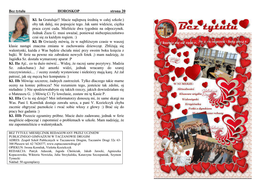 Bez tytułu HOROSKOP strona 20 Kl. Ia Gratuluje!! Macie najlepszą średnią w całej szkole:) oby tak dalej, nie popsujcie tego. Jak sami widzicie, ciężka praca czyni cuda. Mieliście dwa tygodnie na odpoczynek. Jednak Zuza G. musi uważać, ponieważ niebezpieczeństwo czai się za każdym rogiem. :) Kl. Ib Gwiazdy mówią, że w najbliższym czasie w waszej klasie nastąpi znaczna zmiana w zachowaniu dziewcząt. Zbliżają się walentynki, każda z Was będzie chciała mieć przy swoim boku księcia z bajki. W ferie na pewno nie zabraknie nowych fotek ;) mam nadzieję, że Jagódka Sz. dostała wymarzony aparat :P Kl. IIa Ajć.. co tu dużo mówić... Widzę, że raczej same pozytywy. Madzia Sz. zakochana:) Już amorki widzi, jednak wracamy do szarej rzeczywistości.... :/ oceny zostały wystawione i niektórzy mają karę. Aż żal patrzeć, jak się męczą bez komputera :) Kl. IIb Mówiąc szczerze, żadnych zastrzeżeń. Tylko dlaczego takie marne oceny na koniec półrocza? Nie rozumiem tego, jesteście tak zdolni, oj nieładnie :) Nie spodziewałabym się takich rzeczy, jakich dowiedziałam się o Mateuszu G. :) Mówię Ci Ty lowelasie, zostaw mi tę Kasie P. Kl. IIIa Co tu się dzieje? Moi informatorzy donoszą mi, że same skargi na Was. Pani I. Korniluk dostaje zawału serca, a pani V. Kozielczyk chyba zacznie obgryzać paznokcie i rwać sobie włosy z głowy :) Brać się do pracy bez gadania :) Kl. IIIb Piszecie egzaminy próbne. Macie dużo zadawane, jednak w ferie mogliście odpocząć i zapomnieć o problemach w szkole. Mam nadzieję, że nie zapomnieliście o walentynkach. BEZ TYTUŁU MIESIĘCZNIK REDAGOWANY PRZEZ UCZNIÓW PUBLICZNEGO GIMNAZJUM W TACZANOWIE DRUGIM ADRES: Zespół Szkół Publicznych w Taczanowie Drugim, Taczanów Drugi 32c 63300 Pleszew tel. 62 7428377, www.zsptaczanowdrugi.pl OPIEKUN: Iwona Korniluk, Violetta Kozielczyk REDAKCJA: Patryk Adaszak, Jagoda Chróściak, Jakub Jarocki, Agnieszka Kopaczewska, Wiktoria Nowicka, Julia Strzykalska, Katarzyna Szczepaniak, Szymon Tymecki Nakład: 50 egzemplarzy Bez tytułu SUPER KONKURS strona 2 Bez tytułu LUDZIE LISTY PISZĄ strona 19 Droga redakcjo, Oto kolejna edycja SUPER EXTRA FAJNEGO i specjalnego konkursu dla czytelników „Bez tytułu”. By wziąć udział w konkursie wystarczy: Zdobyć naszą gazetkę Bez tytułu. Otworzyć gazetkę na stronie z tym konkursem. Zobaczyć, co kryje się w zawiniątku w na tej stronie. Jeżeli znalazłeś kuponie smutną buźką, to po prostu fart tym razem Ci nie dopisał. Jeśli jednak znalazłeś, np. napis: ”OŁÓWEK”, „NOTESIK”. „LIZAK”, to oznacza, że wygrałeś fajny prezencik. Nagrodami będą m.in.. guma do żucia, lizak lub jakiś sprzęcik przydatny w szkole, np.: długopis, ołówek, zeszyt, cyrkiel. Jeżeli już wygrałeś, po odbiór nagrody musisz zgłosić się wraz ze swoją gazetką i oryginalnym kuponem do opiekunki gazetki pani I. Korniluk, wtedy otrzymasz wygraną przez siebie nagrodę. Sprawdź sam: SPRÓBUJ SZCZĘŚCIA I OTWÓRZ KARTECZKĘ !!! Jeśli nie udało Ci się za pierwszym razem, spróbuj jeszcze raz! Jestem waszym stałym czytelnikiem i chciałbym prosić Was o pomoc. Od dłuższego czasu spotykam się z dziewczyną (cały tydzień). Jak wiecie, wielkimi krokami zbliżają się walentynki i za bardzo nie wiem, jak uczcić ten dzień z moją drugą połówką. Bardzo proszę o pomoc w wybraniu prezentu dla niej. Jasiu Drogi Jasiu, przed Tobą wielkie wyzwanie. Podamy Ci kilka miejsc na wspólne spędzenie z twoją drugą połówką tego dnia. Zaproś ją: - do kina na romantyczny film, - na romantyczną kolację, - do siebie do domu, - przygotujcie razem kolacje, - na wieczorny spacer, - do teatru, - na koncert ulubionego zespołu. Kup jej: - bukiet czerwonych róż, - słodkie czekoladki, - biżuterie, - perfum, - jakiś ciuszek, - pluszowego misia, - ramkę z zdjęciem, na którym jesteście wy. Życzymy udanych walentynek. Redakcja Bez tytułu SZKOLNE STATYSTYKI strona 18 Dobiegło końca I półrocze. Przedstawiamy średnie klas orz uczniów, którzy uzyskali średnią 4,5 i powyżej. Klasa Ia Ib IIa IIb IIIa IIIb Średnia ocen 3,94 3,47 3,34 3,18 3,53 3,27 Klasa Ia Dawid Sobański – 5,15 Kanrad Wasielewski – 4, 69 Zuzanna Kamieniarczyk – 4,62 Mateusz Wawryniuk – 4,62 Klasa Ib Patrycja Mularczyk -4,85 Klasa IIa Wiktoria Nowicka – 5,29 Klasa IIb Kinga Małecka – 5,0 Emilia Grobelna – 4,57 Klasa IIIa Agnieszka Kopaszewska – 4,75 Jakub Jarocki – 4,5 Klasa IIIb Angelika Zarębska – 4,93 Klaudia Pawlak – 4,86 Średnia frekwencja 92,76% 94,345 94,91% 91,41% 94,05% 92,78% Bez tytułu KLASOWE WIGILIE strona 3 W dniu 20.12.2013r. w wielu klasach odbyła się wigilia. Uczestniczyli w niej uczniowie ze swoimi wychowawcami. Na stołach pojawiły się tradycyjne potrawy. Zanim jednak wszyscy zasiedli na swoich miejscach, to podzielili się opłatkiem, składając sobie przy tym życzenia. Na trzeciej godzinie lekcyjnej klasa IIb zaprezentowała swoje umiejętności aktorskie w tegorocznych jasełkach. Talent wokalny pokazały też dwie uczennice z klasy Ia, śpiewając kolędy. Zapytaliśmy kilkoro uczniów z klasy IIa, co sądzą o tym uroczystym, wigilijnym dniu: Magdalena Sz. – Jako prezent dostałam bransoletki, świecznik i Rafaello. Na wigilii bardzo mi się podobało, ponieważ panowała wesoła i miła atmosfera. Wiktoria W. – Moim mikołajem okazała się Oktawia P. Dostałam kosmetyki i słodycze. Wigilia podobała mi się i była przyjemna atmosfera. Miłosz A. – Bardzo mi się podobało na wigilii, było super. Sebastian Sz. – Podobał mi się jasełka. Mikołaj J. – Ta wigilia była lepsza od ostatniej, ponieważ nie było lekcji. Patryk A. – Dostałem zestaw kosmetyków „Axe” i było fajnie. Natalia M. – Dostałam kosmetyki i czekoladę. Podarowała mi je Klaudia H. Klaudia H. – Pod choinkę od mikołaja (w domyśle Natalia M.) otrzymałam zestaw kosmetyków „Avon”. Bez tytu