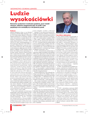 RATOWNICTWO I OCHRONA LUDNOŚCI Ludzie wysokościówki Ratownictwo wysokościowe to doskonałe wyszkolenie, sprzęt i techniki ratownicze. Jednak bez zaangażowania ludzi, ich wysiłku i trudu specjalizacja ta nie rozwinęłaby się w tak dynamiczny sposób. Prekursor Miastem rodzinnym st. bryg. w st. sp. Edwarda Gierskiego jest Bielsko-Biała. Opuścił je w wieku 14 lat, rozpoczynając edukację w Oficerskim Studium Pożarniczym we Wrocławiu. Kolejne szkoły, które ukończył, to Szkoła Oficerów Pożarnictwa w Warszawie (1958-61), Wyższa Oficerska Szkoła Pożarnicza (1976-80) i SGSP (1993-95). W 1968 r. uzyskał specjalizację w zakresie operacyjno-taktycznym. Choć służbę rozpoczynał w Zielonej Górze, swoje życie zawodowe związał z Warszawą. Jako 21-letni podporucznik pożarnictwa objął stanowisko dowódcy plutonu w Oddziale VI ZSP. Kolejnym etapem kariery była funkcja oficera operacyjnego stołecznego punktu alarmowo-dyspozycyjnego (dziś to stanowisko kierowania) – gigantyczna praca, w której w pewnym momencie przestał już liczyć interwencje podejmowane przez warszawskich strażaków. Rocznie było ich ponad dwa tysiące. – Przyglądając się z bliska różnorodności występujących w mieście zagrożeń, dostrzegłem, że potrzeby ratownicze są tu znacznie szersze niż gaszenie pożarów. Mój pomysł na organizację ratownictwa wysokościowego, o którym rozmawiamy, narodził się podczas centralnych pokazów pożarniczych z okazji Dnia Strażaka, połączonych z obchodami 600-lecia miasta Ostrołęki, które odbywały się w 1973 r. Byłem wtedy świeżo upieczonym oficerem operacyjnym, wyznaczonym przez ówczesnego komendanta głównego do opracowania scenariusza tego wydarzenia. Jednym z jego elementów był desant powietrzny sprzętu pożarniczego i załogi strażaków – wspomina. Jeżeli chodzi o sprzęt, to w tym czasie w mieście było siedem 30-metrowych drabin mechanicznych, później za pieniądze z budżetu miasta zakupiono 55-metrową drabinę i 66-metrowy samochodowy podnośnik hydrauliczny. – Sprzęt ten gromadziliśmy w oddziale na warszawskim Bemowie, gdzie zlokalizowane jest lotnisko, należące wtedy do MSW. W tym czasie rozpoczęły się również prace umożliwiające wykorzystanie śmigłowców Nadwiślańskich Jednostek Wojskowych, Ministerstwa Spraw Wewnętrznych czy Centralnego Lotnictwa Sanitarnego. – W 1973 r. otrzymaliśmy z Instytutu Lotnictwa w Warszawie podpisaną przez pilota doświadczalnego I klasy Ryszarda Witkowskiego opinię o możliwościach wykorzystywania ratownictwa śmigłowcowego w razie 16 PP 1.indd 16 1/2011 pożaru budynków wysokich w Warszawie – wspomina. W tym samym roku Stołeczna Komenda SP rozpoczęła współpracę z dzisiejszym CNBOP w Józefowie dotyczącą dopuszczania do użytkowania sprzętu ratownictwa wysokościowego. 1977 r. był początkiem współpracy SKSP z NJW i MSW w zakresie wykorzystania śmigłowców do celów ratowniczych i patrolowych. W 1979 r. Komenda Stołeczna przeprowadziła pierwsze szkolenie grupy strażaków, które obejmowało desanty na linach ze śmigłowców w zerowej prędkości, tzn. w zawisie nad ziemią. Pododdział ratownictwa wysokościowego bazujący na Oddziale VII powstał w 1981 r. W 1977 r. Edward Gierski został powołany na stanowisko zastępcy komendanta wojewódzkiego PSP do spraw operacyjnych. Jako prekursor idei strażaka-ratownika przygotowanego do działań w najtrudniejszych sytuacjach był również twórcą oddziału ratownictwa techniczno-chemicznego (1976-78) i wodnego (1977-78). Doprowadził do wprowadzenia przez prezydenta Warszawy tzw. planu organizacji ratownictwa technicznego – ORT. W swojej pracy inżynierskiej jako pierwszy określił organizację, wyposażenie i zasady działania oddziałów strażackich większych niż batalion. W tym przypadku za zgodą komendanta głównego SP powołana została pierwsza w kraju odwodowa brygada pożarnicza. Pod przewodnictwem st. bryg. Edwarda Gierskiego na początku lat 80. ubiegłego wieku powstał zautomatyzowany system kierowania siłami i środkami. Był to – w odróżnieniu od tzw. banków informacji, jakie opracowano w kilku komendach na terenie kraju – system dynamiczny. Jako zastępca komendanta wojewódzkiego SP nadzorował on działania związane z zakupem w PZL Świdnik śmigłowca ratowniczego W-3 Sokół, który był pierwszą i jedyną maszyną latającą w wyposażeniu warszawskiej straży pożarnej. Odznaczony m.in. Krzyżem Kawalerskim, Oficerskim i Komandorskim Orderu Odrodzenia Polski, Edward Gierski na pierwszym miejscu zawsze stawiał dobro służby. Jest autorem kilkunastu podręczników pożarniczych, m.in. dotyczących działań ratowniczo-gaśniczych w budynkach wysokich i wysokościowych. Dzisiaj jako działacz Związku OSP przekazuje swoją ogromną wiedzę kolejnym pokoleniom strażaków w Izabelinie. Edward Gierski Czas dobrze wykorzystany St. bryg. Ireneusz Grubek swoją przygodę ze strażą pożarną rozpoczynał w Oddziale II warszawskiej straży pożarnej, gdzie trafił po ukończeniu Szkoły Oficerów Pożarnictwa. Po 12 latach służby w warszawskich Włochach, we wrześniu 1983 r. został komendantem rejonowym SP dla dzielnicy Warszawa Wola, w której znajdował się Oddział VII. Na jego bazie oraz Oddziału VI tworzyły się struktury ratownictwa wysokościowego. – Pierwsze ćwiczenia podejmowaliśmy z ówczesnymi oddziałami MO i antyterrorystami. Szybko jednak zorientowaliśmy się, że choć techniki podobne, to różni nas rodzaj zadań. Dlatego chcieliśmy podpatrzeć, jak pracuje GOPR. Bardzo przyjazne nastawienie do nas, między innymi ze strony ówczesnego naczelnika Jana Komornickiego, sprawiło, że pod okiem instruktorów GOPR pierwsza grupa warszawskich strażaków przeszła odpowiednie kursy górskie, a potem jaskiniowe – wspomina st. bryg w st. sp. Ireneusz Grubek. W 1985 r. do podziału bojowego SKSP wprowadzony został pierwszy s
