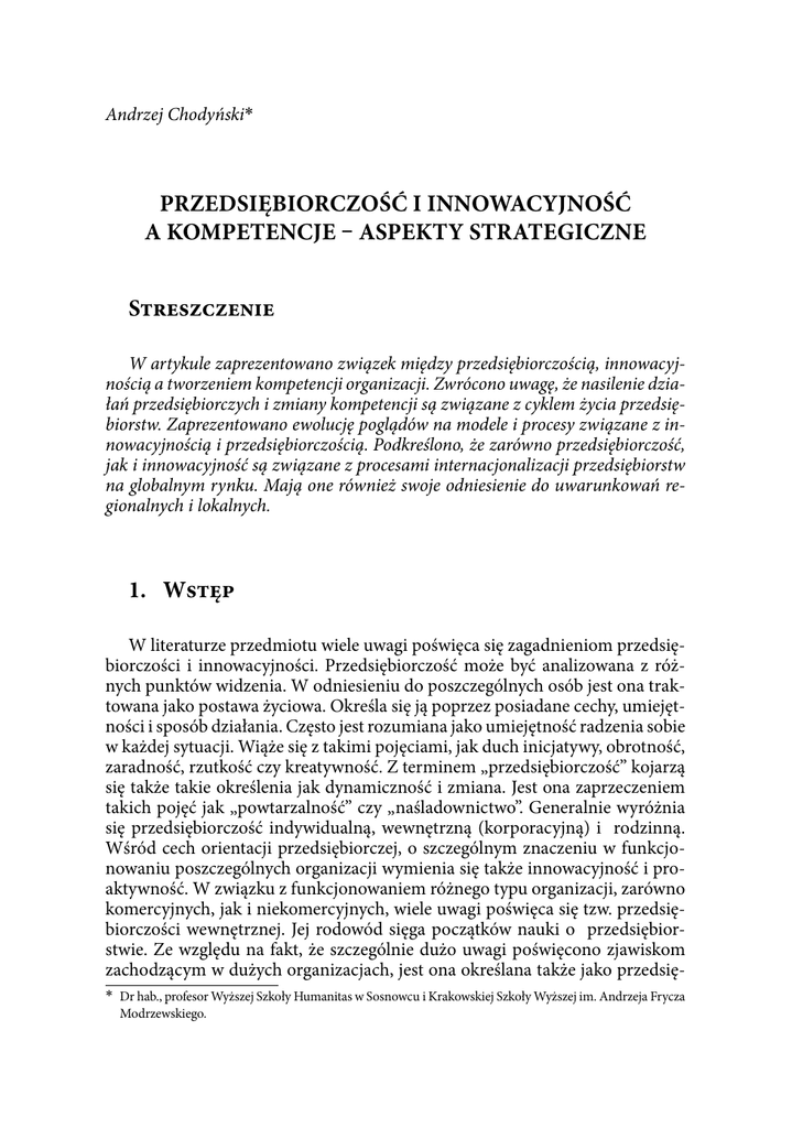 Andrzej Chodyński* PRZEDSIĘBIORCZOŚĆ I INNOWACYJNOŚĆ A KOMPETENCJE – ASPEKTY STRATEGICZNE Streszczenie W artykule zaprezentowano związek między przedsiębiorczością, innowacyjnością a tworzeniem kompetencji organizacji. Zwrócono uwagę, że nasilenie działań przedsiębiorczych i zmiany kompetencji są związane z cyklem życia przedsiębiorstw. Zaprezentowano ewolucję poglądów na modele i procesy związane z innowacyjnością i przedsiębiorczością. Podkreślono, że zarówno przedsiębiorczość, jak i innowacyjność są związane z procesami internacjonalizacji przedsiębiorstw na globalnym rynku. Mają one również swoje odniesienie do uwarunkowań regionalnych i lokalnych. 1. Wstęp W literaturze przedmiotu wiele uwagi poświęca się zagadnieniom przedsiębiorczości i innowacyjności. Przedsiębiorczość może być analizowana z różnych punktów widzenia. W odniesieniu do poszczególnych osób jest ona traktowana jako postawa życiowa. Określa się ją poprzez posiadane cechy, umiejętności i sposób działania. Często jest rozumiana jako umiejętność radzenia sobie w każdej sytuacji. Wiąże się z takimi pojęciami, jak duch inicjatywy, obrotność, zaradność, rzutkość czy kreatywność. Z terminem „przedsiębiorczość” kojarzą się także takie określenia jak dynamiczność i zmiana. Jest ona zaprzeczeniem takich pojęć jak „powtarzalność” czy „naśladownictwo”. Generalnie wyróżnia się przedsiębiorczość indywidualną, wewnętrzną (korporacyjną) i rodzinną. Wśród cech orientacji przedsiębiorczej, o szczególnym znaczeniu w funkcjonowaniu poszczególnych organizacji wymienia się także innowacyjność i proaktywność. W związku z funkcjonowaniem różnego typu organizacji, zarówno komercyjnych, jak i niekomercyjnych, wiele uwagi poświęca się tzw. przedsiębiorczości wewnętrznej. Jej rodowód sięga początków nauki o przedsiębiorstwie. Ze względu na fakt, że szczególnie dużo uwagi poświęcono zjawiskom zachodzącym w dużych organizacjach, jest ona określana także jako przedsię* Dr hab., profesor Wyższej Szkoły Humanitas w Sosnowcu i Krakowskiej Szkoły Wyższej im. Andrzeja Frycza Modrzewskiego. Andrzej Chodyński – Przedsiębiorczość i innowacyjność a kompetencje – aspekty strategiczne biorczość korporacyjna. Z przedsiębiorczością wiąże się pojęcie innowacyjności. Często oba te pojęcia, mając na uwadze rozwój organizacji, głównie przedsiębiorstw, analizowane są z punktu widzenia tworzonych kompetencji. Istotna jest bowiem odpowiedź na następujące pytania: − jak przedsiębiorczość wpływa na tworzenie kompetencji organizacji i − czy zdolności innowacyjne organizacji są przejawem posiadanych kompetencji. W niniejszej publikacji uzasadniono pogląd, że kompetencje organizacji są tworzone w oparciu o wykorzystanie kompetencji poszczególnych pracowników, w szczególności w oparciu o pracę zespołową z wykorzystaniem kreatywności poszczególnych osób, w oparciu o proces uczenia się. Innowacyjność organizacji została z kolei uznana za przejaw posiadanych kompetencji1. 2. Przedsiębiorczość a innowacyjność organizacji W odniesieniu do działalności gospodarczej przedsiębiorczość jest postrzegana jako organizowanie zasobów ekonomicznych w zyskowne przedsięwzięcia. Często towarzyszą temu nierutynowe decyzje. Działania o charakterze przedsiębiorczym wiążą się z ryzykiem. Jednak skutki tych działań przejawiają się w postaci nowych produktów, sposobów wytwarzania czy form organizacji biznesu. Są one także postrzegane przez pryzmat indywidualnych działań zmierzających do tworzenia firm. Faktycznie postawa przedsiębiorcza może być utożsamiana z postawą innowacyjną. Szczególnie ważna jest przedsiębiorczość rozwojowa o wysokim poziomie innowacyjności, nakładów, ale i efektów. Wiąże się ona głównie z funkcjonowaniem większych organizacji. Kojarzenie słów „przedsiębiorczość” i „innowacyjnosć” ma swoje uzasadnienie, gdyż wywodzi się z poglądów J. Schumpetera. Szumpeter postrzegał bowiem przedsiębiorczość jako wprowadzanie zmian określanych jako innowacje. Przedsiębiorczość w jego rozumieniu to działalność polegająca na wprowadzaniu nowych kombinacji czynników produkcji, nowych wyrobów i metod, zdobywaniu nowych rynków zbytu i nowych źródeł zaopatrzenia oraz na tworzeniu nowych, bardziej efektywnych form organizacyjnych działalności gospodarczej2. Według tych poglądów przedsiębiorczość wiąże się wprost z innowacjami, a efektem działań przedsiębiorczych są innowacje. Traktowanie tych dwóch pojęć łącznie może wynikać również ze sformułowania P. Druckera, że innowacja jest specyficznym narzędziem przedsiębiorczości. Mocno akcentowane są w literaturze również poglądy I. Kirznera, że przedsiębiorczość to postrzeganie i wykorzystanie szans. 1 A. Chodyński, Wiedza i kompetencje ekologiczne w strategiach rozwoju przedsiębiorstw, Difin, Warszawa 2007. 2 P.F. Drucker, Innowacja i przedsiębiorczość. Praktyka i zasady, PWE, Warszawa 1992, s. 36. 32 Zeszyty Naukowe Wyższej Szkoły Humanitas Analizując związki między przedsiębiorczością a innowacjami, warto mieć na względzie fakt, że definicji innowacji jest już sporo, a jednak w dalszym ciągu toczy się dyskusja o tym, czym jest innowacja. Ze względu na przedmiot innowacji wyróżnia się innowacje technologiczne, organizacyjne, ekonomiczne, społeczne i ekologiczne. Innowacja technologiczna obejmuje nowe produkty i procesy oraz znaczące zmiany technologiczne w produktach i procesach. Ogólną definicję innowacji podał P. Drucker. Według tego autora innowacja to jakościowa odmienność akceptowana przez odbiorców3. Rozróżnienie pojęć „przedsiębiorczość” i „innowacyjność” może być dosyć trudne. M. Bratnicki i J. Strużyna zwracają uwagę, że przedsiębiorczoś