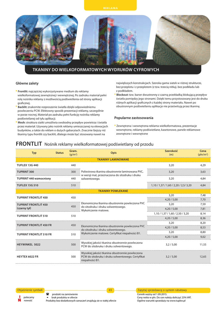 R EAKMLAA M A R E KL TKANINY DO WIELKOFORMATOWYCH WYDRUKÓW CYFROWYCH największych konstrukcjach. Szeroka gama siatek w różnej strukturze, bez przeplotu i z przeplotem (z tzw. trzecią nitką), bez podkładu lub z podkładem. Blockout: tzw. baner dwustronny z czarną przekładką blokującą przepływ światła pomiędzy jego stronami. Dzięki temu przystosowany jest do druku różnych aplikacji graficznych z każdej strony materiału. Nawet po obustronnym podświetleniu aplikacje nie prześwitują przez tkaninę. Główne zalety Frontlit: najczęściej wykorzystywane medium do reklamy wielkoformatowej zewnętrznej i wewnętrznej. Po zadruku materiał pełni rolę nośnika reklamy z możliwością podświetlenia od strony aplikacji graficznej. Backlit: znakomite rozproszenie światła dzięki odpowiedniemu powleczeniu PCW. Efektowny sposób prezentacji reklamy, szczególnie w porze nocnej. Materiał po zadruku pełni funkcję nośnika reklamy podświetlanej od tyłu aplikacji. Mesh: struktura siatki umożliwia swobodny przepływ powietrza i światła przez materiał. Używany jako nośnik reklamy umieszczanej na elewacjach budynków, a także do reklam o dużych gabarytach. Znacznie lżejszy niż tkaniny typu frontlit czy backlit, dlatego może być stosowany nawet na FRONTLIT Popularne zastosowania Zewnętrzna i wewnętrzna reklama wielkoformatowa, prezentacje wewnętrzne, reklamy podświetlane, kasetonowe, panele reklamowe zewnętrzne i wewnętrzne Nośnik reklamy wielkoformatowej podświetlany od przodu Typ Typ Status Status Gram. Gram. (g/m2)2) (g/m Szerokość Szerokość (m) (m) Opis Opis Cena (pln/m2) TKANINY TkaninyLAMINOWANE laminowane ZT304010 TUFLEX 13G 440 TU-FLEX 13G 440 TUPRINT 300 TU-FLEX 15G 510 440 440 300 510 Poliestrowa tkanina obustronnie laminowana PVC, w wersji mat,tkanina przeznaczona do sitodruku i druku Poliestrowa obustronnie laminowana PVC, solwentowego. w wersji mat, przeznaczona do sitodruku i druku 3,20 3,2 3,20 1,1 / 1,37 / 1,6 / 2,2 / 2,5 / 3,2 4,29 4,103,60 3,63 4,604,00 TUPRINT 440 wzmocniony ZT303510 TU-PRINT; ZT303010 Heywinkel 440 solwentowego. Tkaniny powlekane TUFLEX 15G 510 450 TU-PRINT Frontlit 1,60 / 2,20 Ekonomiczna tkanina obustronnie powleczona PVC do 1,10 / 1,37 /3,2 / 4,2 / 5,0/ 2,5/ 3,20 5,90 7,104,84 sitodruku i druku solwentowego. Wykończenie TKANINY POWLEKANE 1,1 / 1,37 / 1,6 / 2,5 / 3,2 / 4,2 / 5,0 7,606,80 matowe. 3,20 7,48 Ekonomiczna tkanina obustronnie powleczona PVC 3,2 / 5,0 6,40 7,907,70 4,20/ 4,2 / 5,00 do sitodruku i druku solwentowego. Wykończenie Ekonomiczna tkanina obustronnie powleczona PVC 3,2 3,20 / 4,2 / 5,0 7,20 8,407,59 matowe. Certyfikat niepalności B1. do sitodruku i druku solwentowego. 4,20 / 5,00 7,81 Wysokiej jakości tkanina obustronnie powleczona PVC Wykończenie matowe. 3,2/ 1,60 / 4,2 // 2,50 5,0 / 3,20 9,00 10,408,14 1,10 / 1,37 do sitodruku i druku solwentowego. 510 450 TU-PRINT Frontlit 510 510 TUPRINT 450 TU-PRINTFRONTLIT Frontlit 450 FR 450 450 TU-PRINTFRONTLIT Frontlit 510 FR TUPRINT 450 (czarny tył) HEYWINKEL Frontlit 5022 TUPRINT FRONTLIT 510 510 450 430 510 3,20 MESH Nośnik wielkoformatowej o strukturze siatki, TUPRINT FRONTLIT 450reklamy FR 450 Ekonomiczna tkanina obustronnie powleczona PVC sitodruku i druku solwentowego. umożliwiający swobodny przepływ do powietrza i światła TUPRINT FRONTLIT 510 FR ZT304020 TU-FLEX; ZT303020 Heywinkel Typ HEYWINKEL 5022 Status TU-FLEX Mesh 280 FR z przeplotem HEYTEX 6022 FR TU-FLEX Mesh 280 FR z przeplotem i podkładem 510 Wykończenie matowe. Certyfikat niepalności B1. Gram. Wysokiej jakości tkaninaOpis obustronnie powleczona 500 2) (g/m PCW do sitobruku i druku solwentowego. Ekonomiczna poliestrowa siatka powleczona PVC, 280 jakości tkaninaniepalności obustronnieB1. powleczona zWysokiej przeplotem. Certyfikat PCW do sitobruku i druku solwentowego. Certyfikat 500 Ekonomiczna poliestrowa siatka powleczona PVC, niepalności B1. 280 z przeplotem i podkładem. Certyfikat niepalności B1. Heywinkel Mesh 5071 FR 330 Wysokiej jakości poliestrowa siatka PVC, matowa. Certyfikat niepalności B1. TU-PRINT Mesh 350 FR z przeplotem 350 Wysokiej jakości poliestrowa siatka powleczona PVC, z przeplotem. Certyfikat niepalności B1. 45 65 Objaśnienie symboli Objaśnienie ! N produkt na zamówienie polecamy polecamy nowość - brak brakproduktu produktuw wofercie ofercie Produkty bez dodatkowych oznaczeń znajdują sie w stałej ofercie 4,84 4,20 / 5,00 8,36 3,20 8,20 4,20 / 5,00 8,53 3,20 8,80 4,20 / 5,00 9,02 Szerokość 3,2 / 5,00(m) Cena 11,552) (pln/m 3,2 / 5,0 3,2 / 5,00 3,2 6,40 12,65 6,60 3,2 / 4,2 / 5 8,90 3,2 / 5,0 8,90 Zapytaj osprzedawcę o system rabatowy Zapytaj sprzedawcę system rabatowy Cennik ważny od 04 maja 2011. Cennik ważny od 1.09.2015. Ceny w pln.doliczyć Do cen należy doliczyć 23% VAT. Ceny netto w pln. Donetto cen należy 23% VAT. warunki sprzedaży na www.tuplex.pl Ogólne warunkiOgólne sprzedaży na www.tuplex.pl R E KL A M A MESH Nośnik reklamy wielkoformatowej o strukturze siatki ZT304020 TU-FLEX; ZT303020 Heywinkel Typ Status Gram. (g/m2) Opis 280 Ekonomiczna poliestrowa siatka powleczona PVC z przeplotem. TUFLEX MESH 280 Z PODKŁADEM 280 Ekonomiczna poliestrowa siatka powleczona PVC, z przeplotem i podkładem. TUFLEX MESH 280 FR 280 Ekonomiczna poliestrowa siatka powleczona PVC z przeplotem. Certyfikat niepalności FR. TUFLEX MESH 280 Szerokość (m) Cena (pln/m2) 3,2 6,82 5,0 7,37 3,2 7,26 3,2 7,37 5,0 8,36 TUFLEX MESH 280 Z PODKŁADEM FR 280 Ekonomiczna poliestrowa siatka powleczona PVC, z przeplotem i podkładem. Certyfikat niepalności FR. 3,2 7,70 HEYWINKEL MESH 5071 FR 340 Wysokiej jakości poliestrowa siatka powleczona PVC, z przeplotem. Certyfikat niepalności B1/M1. 3,2 / 5,0 12,10 REKLAMA BACKLIT Nośnik reklamy wielkoformatowej podświetlany od tyłu ZT303030 Heywinkel, ZT303530 TU-PRINT BACKLIT Nośnik reklamy wielkoformatowej podświetlany od tyłu Typ Status ZT303030 Heywinkel, ZT303530 TU-PRINT Gram. (g/m2) TUP