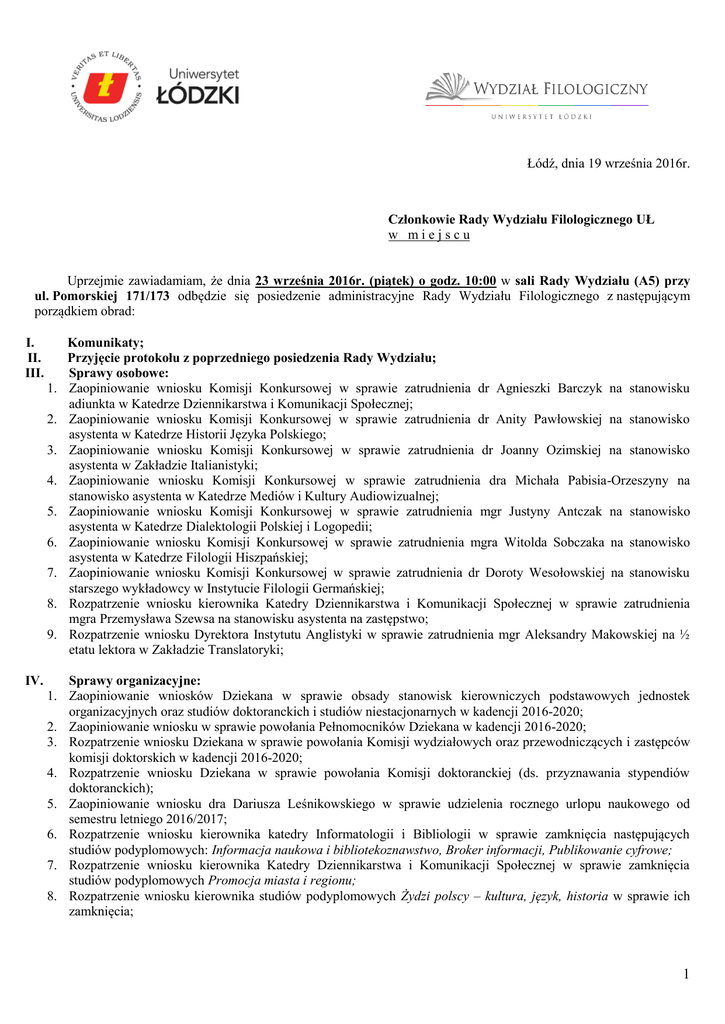 Łódź, dnia 19 września 2016r. Członkowie Rady Wydziału Filologicznego UŁ w miejscu Uprzejmie zawiadamiam, że dnia 23 września 2016r. (piątek) o godz. 10:00 w sali Rady Wydziału (A5) przy ul. Pomorskiej 171/173 odbędzie się posiedzenie administracyjne Rady Wydziału Filologicznego z następującym porządkiem obrad: I. II. III. 1. 2. 3. 4. 5. 6. 7. 8. 9. IV. Komunikaty; Przyjęcie protokołu z poprzedniego posiedzenia Rady Wydziału; Sprawy osobowe: Zaopiniowanie wniosku Komisji Konkursowej w sprawie zatrudnienia dr Agnieszki Barczyk na stanowisku adiunkta w Katedrze Dziennikarstwa i Komunikacji Społecznej; Zaopiniowanie wniosku Komisji Konkursowej w sprawie zatrudnienia dr Anity Pawłowskiej na stanowisko asystenta w Katedrze Historii Języka Polskiego; Zaopiniowanie wniosku Komisji Konkursowej w sprawie zatrudnienia dr Joanny Ozimskiej na stanowisko asystenta w Zakładzie Italianistyki; Zaopiniowanie wniosku Komisji Konkursowej w sprawie zatrudnienia dra Michała Pabisia-Orzeszyny na stanowisko asystenta w Katedrze Mediów i Kultury Audiowizualnej; Zaopiniowanie wniosku Komisji Konkursowej w sprawie zatrudnienia mgr Justyny Antczak na stanowisko asystenta w Katedrze Dialektologii Polskiej i Logopedii; Zaopiniowanie wniosku Komisji Konkursowej w sprawie zatrudnienia mgra Witolda Sobczaka na stanowisko asystenta w Katedrze Filologii Hiszpańskiej; Zaopiniowanie wniosku Komisji Konkursowej w sprawie zatrudnienia dr Doroty Wesołowskiej na stanowisku starszego wykładowcy w Instytucie Filologii Germańskiej; Rozpatrzenie wniosku kierownika Katedry Dziennikarstwa i Komunikacji Społecznej w sprawie zatrudnienia mgra Przemysława Szewsa na stanowisku asystenta na zastępstwo; Rozpatrzenie wniosku Dyrektora Instytutu Anglistyki w sprawie zatrudnienia mgr Aleksandry Makowskiej na ½ etatu lektora w Zakładzie Translatoryki; Sprawy organizacyjne: 1. Zaopiniowanie wniosków Dziekana w sprawie obsady stanowisk kierowniczych podstawowych jednostek organizacyjnych oraz studiów doktoranckich i studiów niestacjonarnych w kadencji 2016-2020; 2. Zaopiniowanie wniosku w sprawie powołania Pełnomocników Dziekana w kadencji 2016-2020; 3. Rozpatrzenie wniosku Dziekana w sprawie powołania Komisji wydziałowych oraz przewodniczących i zastępców komisji doktorskich w kadencji 2016-2020; 4. Rozpatrzenie wniosku Dziekana w sprawie powołania Komisji doktoranckiej (ds. przyznawania stypendiów doktoranckich); 5. Zaopiniowanie wniosku dra Dariusza Leśnikowskiego w sprawie udzielenia rocznego urlopu naukowego od semestru letniego 2016/2017; 6. Rozpatrzenie wniosku kierownika katedry Informatologii i Bibliologii w sprawie zamknięcia następujących studiów podyplomowych: Informacja naukowa i bibliotekoznawstwo, Broker informacji, Publikowanie cyfrowe; 7. Rozpatrzenie wniosku kierownika Katedry Dziennikarstwa i Komunikacji Społecznej w sprawie zamknięcia studiów podyplomowych Promocja miasta i regionu; 8. Rozpatrzenie wniosku kierownika studiów podyplomowych Żydzi polscy – kultura, język, historia w sprawie ich zamknięcia; 1 9. Rozpatrzenie wniosku kierownika studiów podyplomowych Studium Przekładu Filmowego w sprawie ich zamknięcia; 10. Rozpatrzenie wniosku kierownika studiów podyplomowych Język rosyjski w biznesie i turystyce w sprawie ich zamknięcia; 11. Rozpatrzenie wniosku kierownika studiów podyplomowych Komunikacja międzykulturowa w cyfrowym świecie w sprawie ich zamknięcia; 12. Rozpatrzenie wniosku w sprawie powołania mgr Anny Barańskiej-Szmitko na koordynatora ds. Erasmusa na kierunku dziennikarstwo i komunikacja społeczna w roku akademickim 2016/2017; 13. Rozpatrzenie wniosku kierownika Katedry Dialektologii Polskiej i Logopedii w sprawie zawarcia umowy o współpracy między Wydziałem Filologicznym UŁ a Szkołą Podstawową nr 139 w Łodzi; V. Sprawy naukowe: 1. Rozpatrzenie wniosku Komisji w sprawie nadania stopnia naukowego doktora habilitowanego w dyscyplinie literaturoznawstwo dr. Kacprowi Bartczakowi; 2. Rozpatrzenie wniosku Komisji w sprawie nadania stopnia naukowego doktora habilitowanego w dyscyplinie kulturoznawstwo dr. Konradowi Klejsie; 3. Rozpatrzenie wniosku Dziekana w sprawie powołania Komisji ds. postępowania habilitacyjnego dr Katarzyny Sikorskiej-Bujnowicz; 4. Rozpatrzenie wniosku Dziekana w sprawie powołania Komisji ds. postępowania habilitacyjnego dra Artura Pełki; 5. Zatwierdzenie wniosku Komisji w sprawie nadania stopnia naukowego doktora nauk humanistycznych w dyscyplinie językoznawstwo mgr Magdalenie Wojence-Karasek; 6. Zatwierdzenie wniosku Komisji w sprawie nadania stopnia naukowego doktora nauk humanistycznych w dyscyplinie językoznawstwo mgr Oldze Majchrzak; 7. Zatwierdzenie wniosku Komisji w sprawie nadania stopnia naukowego doktora nauk humanistycznych w dyscyplinie literaturoznawstwo mgr. Marcinowi Cyrulskiemu; 8. Rozpatrzenie wniosku dra hab.prof.UŁ Przemysława Krakowiana w sprawie wyznaczenia recenzentów pracy doktorskiej mgr Agnieszki Gadomskiej oraz składu Komisji doktorskich; 9. Rozpatrzenie podania mgra Witolda Sobczaka w sprawie wszczęcia przewodu doktorskiego w dyscyplinie językoznawstwo na podstawie pracy pt. Formy czasownikowe wyrażające następczość w standardowym języku hiszpańskim i w jego odmianie meksykańskiej oraz wyznaczenia prof.dr hab. Wiaczesława Nowikowa na promotora; 10. Rozpatrzenie podania mgr Agnieszki Pacek w sprawie wszczęcia przewodu doktorskiego w dyscyplinie kulturoznawstwo na podstawie pracy pt. Od tabu śmierci do pragnienia nieśmiertelności. Problematyka wypierania śmierci w kulturze Zachodu – perspektywa współczesna oraz wyznaczenia dr hab.prof.UŁ Bogdana Banasiaka na promotora; 11. Rozpatrzenie podania mgr Danuty Pietrzak w sprawie wszczęcia przewodu doktorskiego w dyscyplinie językoznawstwo na podstawie pracy pt. Rozwój kompetencji zawodowych kandydatów na nauczycieli języka angielskiego w kontekście Krajowych Ram Kwalifikacji oraz wyznaczenia dr hab.prof.U