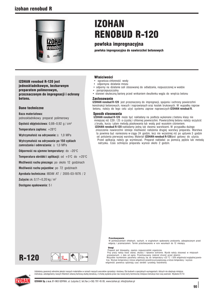izohan renobud R IZOHAN RENOBUD R-120 powłoka impregnacyjna powłoka impregnacyjna do nawierzchni betonowych Właściwości • ogranicza chłonność wody • odpornyna działanie mrozu • odporny na działanie soli stosowanej do odladzania, rozpuszczonej w wodzie • paroprzepuszczalny • stanowi skuteczną barierę przed wnikaniem dwutlenku węgla do wnętrza betonu IZOHAN renobud R-120 jest jednoskładnikowym, bezbarwnym preparatem polimerowym, przeznaczonym do impregnacji i ochrony betonu. Zastosowanie Dane techniczne IZOHAN renobud R-120 jest przeznaczony do impregnacji, spajania i ochrony powierzchni konstrukcji betonowych, nowych i naprawianych oraz kostek brukowych. W wypadku napraw betonu, należy do tego celu użyć systemu zapraw naprawczych IZOHAN renobud. R. Baza materiałowa: jednoskładnikowy preparat polimerowy Gęstość objętościowa: 0,88–0,92 g / cm3 Temperatura zapłonu: +28°C Wytrzymałość na odrywanie: ≥ 1,0 MPa Wytrzymałość na odrywanie po 150 cyklach zamrażania i odmrażania: ≥ 1,0 MPa Sposób stosowania IZOHAN renobud R-120 może być nakładany na podłoża wykonane z betonu klasy nie mniejszej niż C20 / 25 o czystej i chłonnej powierzchni. Powierzchnię betonu należy oczyścić z brudu, kurzu i plam metodą piaskowania lub wodą pod wysokim ciśnieniem. IZOHAN renobud R-120 nakładamy jedną lub dwoma warstwami. W przypadku dużego zniszczenia nawierzchni istnieje możliwość nałożenia drugiej warstwy preparatu. Warstwa ta powinna być naniesiona w ciągu 24 godzin, lecz nie wcześniej niż po upływie 3 godzin od położenia pierwszej warstwy. Materiał IZOHAN renobud R-120 jest gotowy do użycia. Przed aplikacją należy go wymieszać. Preparat nakładać za pomocą pędzla lub metodą natrysku. Czas schnięcia preparatu wynosi około 2 godzin. Odporność na ujemne temperatury: do –20°C Temperatura obróbki i aplikacji: od +5°C do +25°C Możliwość ruchu pieszego: po około 12 godzinach Możliwość ruchu pojazdów: po 72 godzinach Aprobata techniczna: IBDiM AT / 2005-03-1876 / 2 Zużycie: ok. 0,17÷0,20 kg / m2 Dostępne opakowania: 5 l Przechowywanie W pomieszczeniach chłodnych, suchych, w oryginalnym opakowaniu producenta, zabezpieczonym przed wilgocią i przemarzaniem. Termin przechowywania w w/w warunkach do 12 miesięcy. R-120 Uwagi Preparat jest łatwopalny, zawiera rozpuszczalniki organiczne. Przy pracy należy nosić odzież, okulary i rękawice ochronne. Wyrób należy stosować w miejscach przewiewnych, z dala od ognia. Przechowywany materiał chronić przed dziećmi. Wszystkie wymienione parametry odnoszą się do temperatury +23 °C i 55% wilgotności względnej powietrza. Wyższe temperatury i niższa wilgotność powietrza przyspieszają, a niższe temperatury i wyższa wilgotność powietrza opóźniają czas obróbki i przebieg twardnienia. Udzielamy gwarancji odnośnie jakości naszych materiałów w ramach naszych warunków sprzedaży i dostawy. Dla budowli o specjalnych wymaganiach, których nie obejmuje niniejsza instrukcja, udostępniamy naszym Klientom własną fachową służbę doradczą. Z chwilą wydania przez nas nowej karty technicznej niniejsza instrukcja traci swą ważność. Wydanie 01/13 IZOHAN Sp. z o.o. 81-963 GDYNIA, ul. Łużycka 2, tel./fax (+58) 781 45 85, www.izohan.pl, [email protected] 90