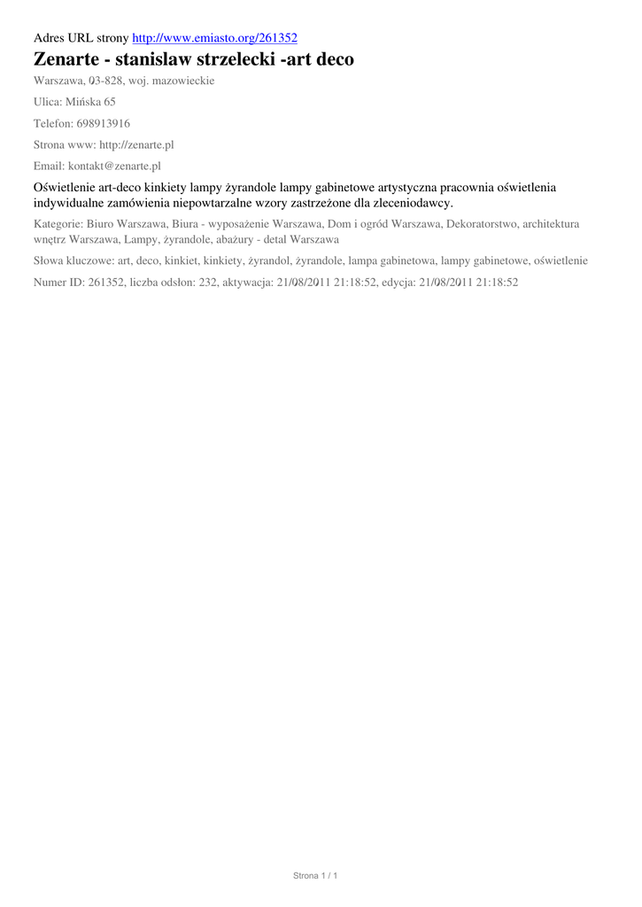 Adres URL strony http://www.emiasto.org/261352 Zenarte - stanislaw strzelecki -art deco Warszawa, 03-828, woj. mazowieckie Ulica: Mińska 65 Telefon: 698913916 Strona www: http://zenarte.pl Email: [email protected] Oświetlenie art-deco kinkiety lampy żyrandole lampy gabinetowe artystyczna pracownia oświetlenia indywidualne zamówienia niepowtarzalne wzory zastrzeżone dla zleceniodawcy. Kategorie: Biuro Warszawa, Biura - wyposażenie Warszawa, Dom i ogród Warszawa, Dekoratorstwo, architektura wnętrz Warszawa, Lampy, żyrandole, abażury - detal Warszawa Słowa kluczowe: art, deco, kinkiet, kinkiety, żyrandol, żyrandole, lampa gabinetowa, lampy gabinetowe, oświetlenie Numer ID: 261352, liczba odsłon: 232, aktywacja: 21/08/2011 21:18:52, edycja: 21/08/2011 21:18:52 Strona 1 / 1