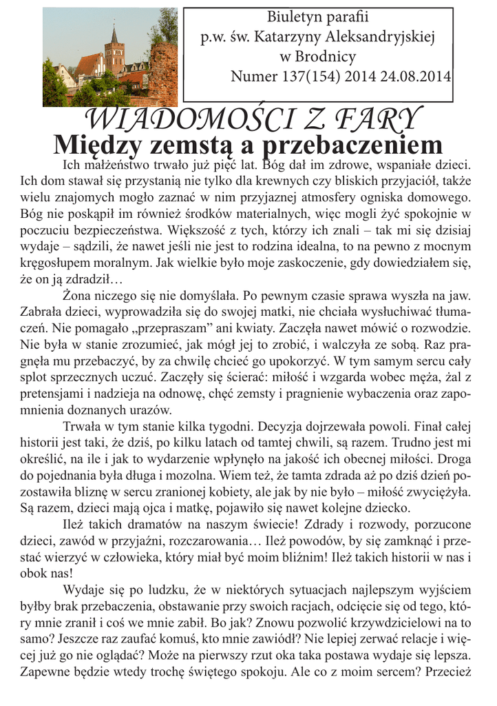 Biuletyn parafii p.w. św. Katarzyny Aleksandryjskiej w Brodnicy Numer 137(154) 2014 24.08.2014 WIADOMOŚCI Z FARY Między zemstą a przebaczeniem Ich małżeństwo trwało już pięć lat. Bóg dał im zdrowe, wspaniałe dzieci. Ich dom stawał się przystanią nie tylko dla krewnych czy bliskich przyjaciół, także wielu znajomych mogło zaznać w nim przyjaznej atmosfery ogniska domowego. Bóg nie poskąpił im również środków materialnych, więc mogli żyć spokojnie w poczuciu bezpieczeństwa. Większość z tych, którzy ich znali – tak mi się dzisiaj wydaje – sądzili, że nawet jeśli nie jest to rodzina idealna, to na pewno z mocnym kręgosłupem moralnym. Jak wielkie było moje zaskoczenie, gdy dowiedziałem się, że on ją zdradził… Żona niczego się nie domyślała. Po pewnym czasie sprawa wyszła na jaw. Zabrała dzieci, wyprowadziła się do swojej matki, nie chciała wysłuchiwać tłumaczeń. Nie pomagało „przepraszam” ani kwiaty. Zaczęła nawet mówić o rozwodzie. Nie była w stanie zrozumieć, jak mógł jej to zrobić, i walczyła ze sobą. Raz pragnęła mu przebaczyć, by za chwilę chcieć go upokorzyć. W tym samym sercu cały splot sprzecznych uczuć. Zaczęły się ścierać: miłość i wzgarda wobec męża, żal z pretensjami i nadzieja na odnowę, chęć zemsty i pragnienie wybaczenia oraz zapomnienia doznanych urazów. Trwała w tym stanie kilka tygodni. Decyzja dojrzewała powoli. Finał całej historii jest taki, że dziś, po kilku latach od tamtej chwili, są razem. Trudno jest mi określić, na ile i jak to wydarzenie wpłynęło na jakość ich obecnej miłości. Droga do pojednania była długa i mozolna. Wiem też, że tamta zdrada aż po dziś dzień pozostawiła bliznę w sercu zranionej kobiety, ale jak by nie było – miłość zwyciężyła. Są razem, dzieci mają ojca i matkę, pojawiło się nawet kolejne dziecko. Ileż takich dramatów na naszym świecie! Zdrady i rozwody, porzucone dzieci, zawód w przyjaźni, rozczarowania… Ileż powodów, by się zamknąć i przestać wierzyć w człowieka, który miał być moim bliźnim! Ileż takich historii w nas i obok nas! Wydaje się po ludzku, że w niektórych sytuacjach najlepszym wyjściem byłby brak przebaczenia, obstawanie przy swoich racjach, odcięcie się od tego, który mnie zranił i coś we mnie zabił. Bo jak? Znowu pozwolić krzywdzicielowi na to samo? Jeszcze raz zaufać komuś, kto mnie zawiódł? Nie lepiej zerwać relacje i więcej już go nie oglądać? Może na pierwszy rzut oka taka postawa wydaje się lepsza. Zapewne będzie wtedy trochę świętego spokoju. Ale co z moim sercem? Przecież ono pozostaje, a w nim rana. Serce nie zapomni. Ono dobrze pamięta, że miała być miłość, a jej nie było, że miał być przyjacielem, a okazał się wrogiem. Bez wątpienia każde serce chce być kochane i samo chce kochać. Tego się akurat nie da ani zamazać, ani zagłuszyć. Można udawać, że przeżyję bez miłości. Ale jak długo? Da się tak żyć, by czekać na miłość, a samemu się od niej odwracać? Nie przebaczyć? I co potem? Może się tak wydarzyć w życiu, że pojawi się rozczarowanie, później brak przebaczenia, a potem na dokładkę brak pojednania, zacięcie się w sercu. Co wtedy? Czy będę wierzył w człowieka, jeśli zamknę się w sobie i nie zdobędę się na przebaczenie? Moje zamknięte serce i zaciśnięta pięść uderzą nie tyle w innych, ile najpierw we mnie, bo przecież wtedy ja tracę wiarę, że jest możliwe, by człowiek był człowiekiem. W taki sposób ginie miłość na świecie, bo serce (być może i moje) krok po kroku zrywa to, co łączy. Jeśli pragnę miłości, to czyż będzie jej więcej, gdy postanowię odwrócić się plecami do drugiego człowieka… To prawda, że mógł wyrządzić mi zło i mam prawo się od niego odwrócić. Jednak prawo miłości zaprasza mnie, by rozerwać ten łańcuch zła i zło dobrem zwyciężać. Otóż to! Nie ma innej drogi, by przerwać spiralę zła na świecie, niż przebaczenie. Bo co czyni zemsta? Jeśli mamy jedną krzywdę, zemsta dokłada kolejną i tak mamy już dwie krzywdy. Gdy po tym znowu się ktoś będzie chciał zemścić, będziemy mieli już trzy krzywdy… a potem cztery i tak bez końca… Czy to jest droga do świata miłości? Czy to przerwie spiralę zła? Zło do zła, krzywda do krzywdy, zemsta do zemsty? Gdy będzie obowiązywać zasada „oko za oko i ząb za ząb”, to łańcuch zła nigdy nie ulegnie zerwaniu. Pojawią się kolejne obręcze w szeregu krzywd i spirala się powiększy… I tak bez końca. Zła nie da się zwyciężyć złem. Zło zwycięża się dobrem. „Po tym wszyscy poznają, żeście uczniami moimi, jeśli będziecie się wzajemnie miłowali” (J 13,35) – powiedział Jezus. I to ma być naszą wizytówką. A jeśli nie będziemy się wzajemnie miłowali, to kto w naszym świecie pozna, żeśmy Jego uczniami? „Jeśli bowiem miłujecie tych, którzy was miłują, cóż za nagrodę mieć będziecie? (…) Czyż i poganie tego nie czynią?” (Mt 5,46-47). Co to za sztuka szanować tych, którzy nas szanują, i kochać tych, którzy nas kochają? To nic szczególnego. Łatwo się wtedy mówi: „Kocham cię”. To nie jest takie trudne, bo oddaję to, co sam dostałem. Trudniej za to powiedzieć „przepraszam” albo „wybaczam”. A przecież nie ma „kocham” bez „wybaczam”. Nie ma „kocham” bez „przepraszam”. Nie ma „kocham” bez „proszę o przebaczenie”. Co pozostanie w moim „kocham”, gdy tego zabraknie? OGŁOSZENIA PARAFIALNE XXI Niedziela Zwykła 24. sierpnia 2014 1. Przed nami jeszcze tydzień wakacji. Serdecznie pozdrawiamy gości wypoczywających na Pojezierzu Brodnickim. 2. W liturgii przeżywać będziemy: we wtorek 26. sierpnia Uroczystość NMP Częstochowskiej. Podczas Mszy św. odnowimy Śluby Jasnogórskie Narodu. Episkopat Polski ustanowił ten dzień Dniem modlitw za Prze