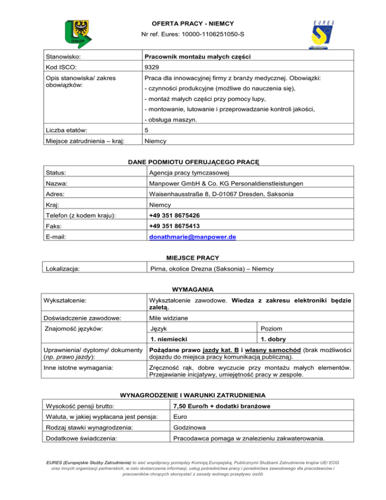 OFERTA PRACY - NIEMCY Nr ref. Eures: 10000-1106251050-S Stanowisko: Pracownik montażu małych części Kod ISCO: 9329 Opis stanowiska/ zakres obowiązków: Praca dla innowacyjnej firmy z branży medycznej. Obowiązki: - czynności produkcyjne (możliwe do nauczenia się), - montaż małych części przy pomocy lupy, - montowanie, lutowanie i przeprowadzanie kontroli jakości, - obsługa maszyn. Liczba etatów: 5 Miejsce zatrudnienia – kraj: Niemcy DANE PODMIOTU OFERUJĄCEGO PRACĘ Status: Agencja pracy tymczasowej Nazwa: Manpower GmbH & Co. KG Personaldienstleistungen Adres: Waisenhausstraße 8, D-01067 Dresden, Saksonia Kraj: Niemcy Telefon (z kodem kraju): +49 351 8675426 Faks: +49 351 8675413 E-mail: [email protected] MIEJSCE PRACY Pirna, okolice Drezna (Saksonia) – Niemcy Lokalizacja: WYMAGANIA Wykształcenie: Wykształcenie zawodowe. Wiedza z zakresu elektroniki będzie zaletą. Doświadczenie zawodowe: Mile widziane Znajomość języków: Język Poziom 1. niemiecki 1. dobry Uprawnienia/ dyplomy/ dokumenty (np. prawo jazdy): Pożądane prawo jazdy kat. B i własny samochód (brak możliwości dojazdu do miejsca pracy komunikacją publiczną). Inne istotne wymagania: Zręczność rąk, dobre wyczucie przy montażu małych elementów. Przejawianie inicjatywy, umiejętność pracy w zespole. WYNAGRODZENIE I WARUNKI ZATRUDNIENIA Wysokość pensji brutto: 7,50 Euro/h + dodatki branżowe Waluta, w jakiej wypłacana jest pensja: Euro Rodzaj stawki wynagrodzenia: Godzinowa Dodatkowe świadczenia: Pracodawca pomaga w znalezieniu zakwaterowania. EURES (Europejskie Służby Zatrudnienia) to sieć współpracy pomiędzy Komisją Europejską, Publicznymi Służbami Zatrudnienia krajów UE/ EOG oraz innych organizacji partnerskich, w celu dostarczania informacji, usług pośrednictwa pracy i poradnictwa zawodowego dla pracodawców i pracowników chcących skorzystać z zasady wolnego przepływu osób Nazwa firmy, z którą zostanie podpisana umowa: Manpower GmbH & Co. KG Personaldienstleistungen Rodzaj umowy: Umowa o pracę Wymiar czasu pracy: Pełen etat Czas trwania umowy: Nieokreślony Liczba godzin tygodniowo: 40 Zmiany i praca w dni wolne: Praca na zmiany (pomiędzy godz. 6:00 – 22:00) Data rozpoczęcia: 06.01.2014 r. Inne informacje: Pracodawca oferuje urozmaiconą i odpowiedzialną pracę w międzynarodowym zespole, płaską strukturę organizacyjną, inspirującą kulturę korporacyjną, jak również możliwość doskonalenia osobistego i zawodowego. SPOSÓB SKŁADANIA WNIOSKU Wymagane dokumenty: CV ze zdjęciem, kwalifikacje kopie świadectw potwierdzających Język, w którym muszą być sporządzone przedkładane dokumenty: Niemiecki Do kogo należy wysłać dokumenty: Do pracodawcy Gdzie należy wysłać dokumenty: Drogą elektroniczną: [email protected] (w tytule maila proszę wpisać „Mitarbeiter - Kleinteilmontage”) Lub pocztą tradycyjną na adres firmy: Manpower GmbH & Co. KG Personaldienstleistungen, Frau Marie Donath, Waisenhausstraße 8, 01067 Dresden, Saksonia, Niemcy Dane teleadresowe doradcy EURES lub przedstawiciela pracodawcy: Frau Marie Donath , tel. +49 351 8675426 WAŻNOŚĆ Data publikacji: 24.12.2013 r. Termin przedkładania podań o pracę / zakończenia ważności oferty: Do odwołania Agencja pracy tymczasowej Manpower GmbH & Co. KG Personaldienstleistungen oświadczyła, że prowadzi działalność zgodnie z przepisami obowiązującymi w swoim kraju. Uprzejmie informujemy, że skontaktujemy się wyłącznie z wybranymi kandydatami. UWAGA: 1. Umowa z zagranicznym pracodawcą zostanie zawarta zgodnie z prawem kraju zatrudnienia. Oznacza to, że wszystkie roszczenia odnośnie do warunków, które obejmuje umowa, można kierować wyłącznie do odpowiedniego sądu w kraju zatrudnienia. Publiczne służby zatrudnienia (EURES) nie mogą pośredniczyć ani reprezentować pracownika w sądzie kraju zatrudnienia w przypadku sporu z pracodawcą. 2. Publiczne służby zatrudnienia (EURES) dokładają wszelkich starań, aby zapewnić rzetelność i wiarygodność ofert pracy zgłoszonych w lokalnym urzędzie pracy. Należy wyjaśnić, że oferta pracy została zgłoszona przez stronę trzecią i EURES nie odpowiada za ewentualne rozbieżności między warunkami pracy określonymi w ofercie pracy i warunkami oferowanymi przez potencjalnego pracodawcę. 3. Publiczne służby zatrudnienia (EURES) informują, że będą zbierać, przetwarzać i przekazywać potencjalnym pracodawcom zgodnie z przepisami dotyczącymi ochrony danych osobowych wszystkie dane osobowe dostarczone przez osoby poszukujące pracy. EURES (Europejskie Służby Zatrudnienia) to sieć współpracy pomiędzy Komisją Europejską, Publicznymi Służbami Zatrudnienia krajów UE/ EOG oraz innych organizacji partnerskich, w celu dostarczania informacji, usług pośrednictwa pracy i poradnictwa zawodowego dla pracodawców i pracowników chcących skorzystać z zasady wolnego przepływu osób