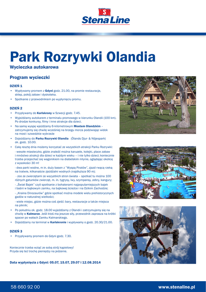 Park Rozrywki Olandia Wycieczka autokarowa Program wycieczki DZIEŃ 1 • Wypływamy promem z Gdyni godz. 21.00, na promie restauracje, sklep, pokój zabaw i dyskoteka. • Spotkanie z przewodnikiem po wypłynięciu promu. DZIEŃ 2 • Przypływamy do Karlskrony w Szwecji godz. 7.45. • Wyjeżdżamy autokarem z terminalu promowego w kierunku Olandii (100 km). Po drodze konkursy, filmy i inne atrakcje dla dzieci. • Na samą wyspę wjeżdżamy 6-kilometrowym Mostem Olandzkim – zatrzymujemy się chwilę wcześniej na brzegu morza podziwiając widok na most i szwedzkie wybrzeże • Dojeżdżamy do Parku Rozrywki Olandia (Ölands Djur- & Nöjespark) ok. godz. 10.00. • Całą resztę dnia możemy korzystać ze wszystkich atrakcji Parku Rozrywki: - wesołe miasteczko, gdzie znaleźć można karuzele, kolejki, place zabaw i mnóstwo atrakcji dla dzieci w każdym wieku – i nie tylko dzieci; koniecznie trzeba przejechać się wagonikiem na diabelskim młynie, oglądając okolicę z wysokości 30 m! - dwa parki wodne, m in. duży basen z ”Wyspą Piratów”, zjazd rwącą rzeką na tratwie, kilkanaście zjeżdżalni wodnych (najdłuższa 90 m); - zoo ze zwierzętami ze wszystkich stron świata – spotkać tu można 100 różnych gatunków zwierząt, m. in. tygrysy, lwy, szympansy, zebry, kangury; - „Świat Bajek” czyli spotkanie z bohaterami najpopularniejszych bajek i baśni w bajkowym zamku, na bajkowej ścieżce i na Dzikim Zachodzie; - „Kraina Dinozaurów” gdzie spotkać można modele wielu prehistorycznych gadów w naturalnej wielkości; - wiele miejsc, gdzie można coś zjeść: bary, restauracje a także miejsca na piknik; • Po południu ok. godz. 18.00 wyjeżdżamy z Olandii i zatrzymujemy się na chwilę w Kalmarze. Jeśli ktoś ma jeszcze siły, przewodnik zaprasza na krótki spacer po wałach Zamku Kalmarskiego. • Dojeżdżamy na terminal w Karlskronie i wypływamy o godz. 20.30/21.00. DZIEŃ 3 • Przypływamy promem do Gdyni godz. 7.30. Koniecznie trzeba wziąć ze sobą strój kąpielowy! Przyda się też trochę pieniędzy na jedzenie. Data wypłynięcia z Gdyni: 05.07, 15.07, 29.07 i 12.08.2014 58 660 92 00 •www.stenaline.pl