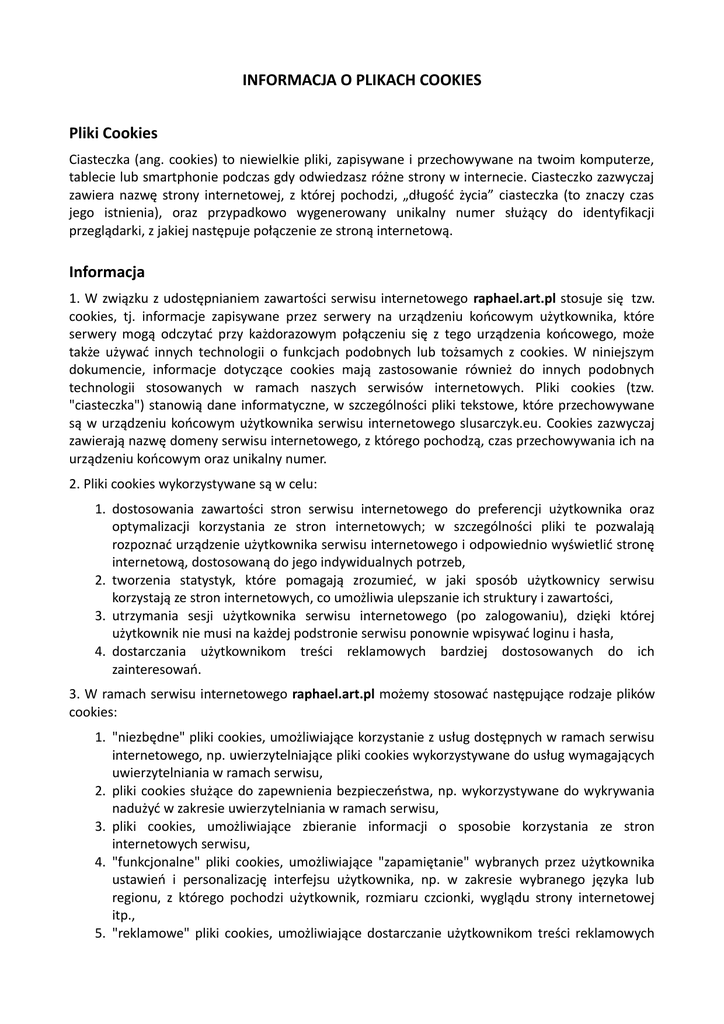 INFORMACJA O PLIKACH COOKIES Pliki Cookies Ciasteczka (ang. cookies) to niewielkie pliki, zapisywane i przechowywane na twoim komputerze, tablecie lub smartphonie podczas gdy odwiedzasz różne strony w internecie. Ciasteczko zazwyczaj zawiera nazwę strony internetowej, z której pochodzi, „długość życia” ciasteczka (to znaczy czas jego istnienia), oraz przypadkowo wygenerowany unikalny numer służący do identyfikacji przeglądarki, z jakiej następuje połączenie ze stroną internetową. Informacja 1. W związku z udostępnianiem zawartości serwisu internetowego raphael.art.pl stosuje się tzw. cookies, tj. informacje zapisywane przez serwery na urządzeniu końcowym użytkownika, które serwery mogą odczytać przy każdorazowym połączeniu się z tego urządzenia końcowego, może także używać innych technologii o funkcjach podobnych lub tożsamych z cookies. W niniejszym dokumencie, informacje dotyczące cookies mają zastosowanie również do innych podobnych technologii stosowanych w ramach naszych serwisów internetowych. Pliki cookies (tzw. "ciasteczka") stanowią dane informatyczne, w szczególności pliki tekstowe, które przechowywane są w urządzeniu końcowym użytkownika serwisu internetowego slusarczyk.eu. Cookies zazwyczaj zawierają nazwę domeny serwisu internetowego, z którego pochodzą, czas przechowywania ich na urządzeniu końcowym oraz unikalny numer. 2. Pliki cookies wykorzystywane są w celu: 1. dostosowania zawartości stron serwisu internetowego do preferencji użytkownika oraz optymalizacji korzystania ze stron internetowych; w szczególności pliki te pozwalają rozpoznać urządzenie użytkownika serwisu internetowego i odpowiednio wyświetlić stronę internetową, dostosowaną do jego indywidualnych potrzeb, 2. tworzenia statystyk, które pomagają zrozumieć, w jaki sposób użytkownicy serwisu korzystają ze stron internetowych, co umożliwia ulepszanie ich struktury i zawartości, 3. utrzymania sesji użytkownika serwisu internetowego (po zalogowaniu), dzięki której użytkownik nie musi na każdej podstronie serwisu ponownie wpisywać loginu i hasła, 4. dostarczania użytkownikom treści reklamowych bardziej dostosowanych do ich zainteresowań. 3. W ramach serwisu internetowego raphael.art.pl możemy stosować następujące rodzaje plików cookies: 1. "niezbędne" pliki cookies, umożliwiające korzystanie z usług dostępnych w ramach serwisu internetowego, np. uwierzytelniające pliki cookies wykorzystywane do usług wymagających uwierzytelniania w ramach serwisu, 2. pliki cookies służące do zapewnienia bezpieczeństwa, np. wykorzystywane do wykrywania nadużyć w zakresie uwierzytelniania w ramach serwisu, 3. pliki cookies, umożliwiające zbieranie informacji o sposobie korzystania ze stron internetowych serwisu, 4. "funkcjonalne" pliki cookies, umożliwiające "zapamiętanie" wybranych przez użytkownika ustawień i personalizację interfejsu użytkownika, np. w zakresie wybranego języka lub regionu, z którego pochodzi użytkownik, rozmiaru czcionki, wyglądu strony internetowej itp., 5. "reklamowe" pliki cookies, umożliwiające dostarczanie użytkownikom treści reklamowych bardziej dostosowanych do ich zainteresowań. 4. W wielu przypadkach oprogramowanie służące do przeglądania stron internetowych (przeglądarka internetowa) domyślnie dopuszcza przechowywanie plików cookies w urządzeniu końcowym użytkownika. Użytkownicy serwisu mogą dokonać w każdym czasie zmiany ustawień dotyczących plików cookies. Ustawienia te mogą zostać zmienione w szczególności w taki sposób, aby blokować automatyczną obsługę plików cookies w ustawieniach przeglądarki internetowej bądź informować o ich każdorazowym zamieszczeniu w urządzeniu użytkownika serwisu internetowego. Szczegółowe informacje o możliwości i sposobach obsługi plików cookies dostępne są w ustawieniach oprogramowania (przeglądarki internetowej). Niedokonanie zmiany ustawień w zakresie cookies oznacza, że będą one zamieszczone w urządzeniu końcowym użytkownika, a tym samym będziemy przechowywać informacje w urządzeniu końcowym użytkownika i uzyskiwać dostęp do tych informacji. 5. Wyłączenie stosowania cookies może spowodować utrudnienia korzystanie z niektórych usług w ramach naszych serwisów internetowych, w szczególności wymagających logowania. Wyłączenie opcji przyjmowania cookies nie powoduje natomiast braku możliwości czytania lub oglądania treści zamieszczanych w serwisie internetowym raphael.art.pl z zastrzeżeniem tych, do których dostęp wymaga logowania. 6. Pliki cookies mogą być zamieszczane w urządzeniu końcowym użytkownika serwisu internetowego raphael.art.pl, a następnie wykorzystywane przez współpracujących z serwisem reklamodawców, firmy badawcze oraz dostawców aplikacji multimedialnych. Jak wyłączyć pliki cookie w przeglądarce ? Przeglądarka Opera Przeglądarka Firefox Przeglądarka Chrome Przeglądarka Internet Explorer Przeglądarka Safari