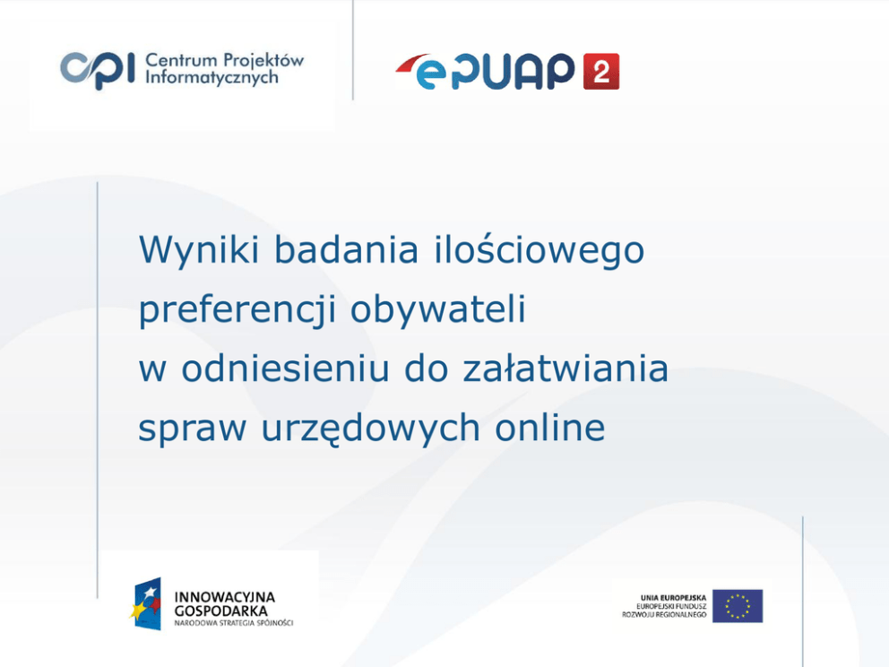 Wyniki badania ilościowego preferencji obywateli w odniesieniu do załatwiania spraw urzędowych online Metryczka badania: • Badanie przeprowadzone na zlecenie Centrum Projektów Informatycznych (www.cpi.gov.pl) w dniach 1–16 stycznia 2013 roku. • Ankieta wyświetlana internautom na stronach www.epuap.gov.pl i www.bip.gov.pl. • Prośba o wypełnienie ankiety wyświetlona 12 095 internautom, z czego 3 807 osób zdecydowało się na jej wypełnienie. Jak często zdarza Ci się załatwiać sprawy urzędowe? 35,00% 30,00% 25,00% 31,86% Rzadko – raz na 4-6 miesięcy 28,88% 22,57% Bardzo rzadko – rzadziej niż raz na pół roku 20,00% 16,69% 15,00% Dość często – raz na 2-3 miesiące 10,00% 5,00% Bardzo często – co najmniej raz w miesiącu 0,00% Jak widzimy internauci deklarują raczej sporadyczne wizyty w urzędach. Częste i bardzo częste wizyty deklarują raczej osoby, które pracują na własny rachunek i częstsze wizyty w urzędach są dla nich koniecznością. Czy słyszałeś/łaś o możliwości załatwiania spraw urzędowych przez internet? 60,00% 50,00% 49,33% Tak, wiem o takiej możliwości i chociaż raz z niej korzystałem/łam 43,90% 40,00% Tak, wiem o takiej możliwości, ale nigdy z niej nie korzystałem/łam 30,00% 20,00% 10,00% 6,77% Nie, nigdy nie słyszałem/łam o takiej możliwości 0,00% Wyniki są bardzo satysfakcjonujące, ponieważ 93,23% ankietowanych wie o możliwości załatwiania spraw urzędowych przez internet, a 49,33% z nich już korzystało z takiej możliwości. Sprawy urzędowe można załatwiać na różne sposoby. W jaki sposób załatwiasz je najczęściej? Ponad połowa użytkowników załatwia sprawy urzędowe w sposób tradycyjny. Powodem tego stanu jest brak pewności co do bezpieczeństwa lub brak natychmiastowej weryfikacji dokumentu przez osoby kompetentne. 60,00% 50,00% Wszystkie sprawy urzędowe załatwiam osobiście w urzędzie 50,24% 40,00% 30,00% Większość spraw załatwiam osobiście w urzędzie, ale zdarza mi się też załatwiać niektóre formalności przez internet 28,58% 21,18% 20,00% 10,00% 0,00% Większość spraw urzędowych załatwiam przez internet – do urzędu chodzę tylko, gdy jest to konieczne Poniżej znajdują się różne stwierdzenia dotyczące problemów, jakie mogą się pojawić podczas załatwiania spraw urzędowych w sposób tradycyjny – osobiście w urzędzie. Zaznacz, jak częsty jest to według Ciebie problem. 100% 14,00% 90% 21,00% 19,00% Bardzo często 22,00% Często 32,00% 80% 44,00% 20,00% 70% 24,00% 60% 50% 32,00% 27,00% 40% Czasami 34,00% 26,00% 27,00% Rzadko 30% 24,00% 20% 10% 0% 9,00% 3,00% 16,00% 26,00% 22,00% 24,00% 6,00% 7,00% 8,00% Brak jasnych reguł działania – uzależnienie skutecznego załatwienia sprawy od „widzimisię” urzędnika Nieuprzejmi urzędnicy – bycie traktowanym jak petent, nie jak klient Nigdy 8,00% 5,00% Długie kolejki – Niedopasowane Niekompetentni zajmuje to dużo godziny otwarcia urzędnicy czasu – trudno połączyć wizytę w urzędzie z pracą zawodową, nauką Poniżej znajdują się problemy, z którymi mogą spotkać się osoby załatwiające sprawy urzędowe przez internet. Zaznacz dwa z nich, które są według Ciebie największymi utrudnieniami. Problemem dla wielu ankietowanych jest przede wszystkim niepewność. Klient nie wie czy dokument dotrze do odpowiedniego urzędu, czy jest dobrze wypełniony oraz czy nie trafi on przypadkiem w niepowołane ręce. 50,00% 45,00% 47,01% 46,08% Brak pewności, że urząd zajmie się sprawą zgłoszoną przez internet 45,11% Problemy techniczne – np. problem z połączeniem się ze stroną internetową urzędu 40,00% 35,00% 30,00% 25,00% 26,31% Brak możliwości uzyskania od urzędnika pomocy, np. przy wypełnianiu dokumentów 24,93% 20,00% 15,00% 10,00% 5,00% 0,00% Brak możliwości bezpośredniej rozmowy z drugim człowiekiem 10,55% Brak poczucia bezpieczeństwa – nie wiadomo, kto będzie miał dostęp do podawanych danych i informacji Jest to za trudne, zbyt skomplikowane W jaki sposób najbardziej chciał(a)byś kontaktować się z urzędami (np. urząd skarbowy, ZUS, urząd miasta)? Wybierz dwie najbardziej atrakcyjne według Ciebie opcje. 90,00% 82,57% 82,16% Przez email (pocztę elektroniczną) 80,00% 70,00% Przez specjalną platformę do załatwiania spraw urzędowych (np. edeklaracje, ePUAP) 60,00% 50,00% Przez połączenie audio-video, np. Skype 40,00% 30,00% 20,00% 10,00% 0,00% 15,20% Przez czat na stronie internetowej 12,45% 7,62% Przez komunikator tekstowy, np. GG Ankietowani chcieliby kontaktować się z urzędami głównie przez email oraz specjalną platformę. Skype, czat bądź gg nie cieszą się uznaniem, ponieważ są to raczej nieformalne środki komunikacji. Jak Ci się wydaje, jakie są największe zalety załatwiania spraw urzędowych przez internet? Wybierz dwie, które Twoim zdaniem są najważniejsze. Co sprawia, że ludzie wolą załatwić sprawę urzędową przez internet, zamiast iść do placówki publicznej? WYGODA! 100,00% 90,00% Oszczędność czasu – brak konieczności stania w kolejkach 86,09% 81,07% 80,00% 70,00% Możliwość załatwienia sprawy w dogodnym miejscu i o dowolnej godzinie 60,00% 50,00% 40,00% 30,00% Możliwość spokojnego przeczytania i wypełnienia wszystkich dokumentów 26,75% 20,00% 10,00% 0,00% 6,09% Brak konieczności bezpośredniego kontaktu z urzędnikiem Zaznacz pięć spraw urzędowych, które chciałbyś/łabyś załatwiać przez internet. Rejestracja samochodu 68,73% Złożenie deklaracji podatkowej 59,85% Wydanie duplikatu dokumentu 53,35% Złożenie deklaracji w ZUS 47,37% Odpisy z ksiąg stanu cywilnego 42,06% Zakładanie działalności gospodarczej 40,68% Wydanie prawa jazdy 36,30% Duplikaty i odpisy świadectw szkolnych 24,30% Wydanie pozwolenia na budowę 21,88% Dopisanie do spisu wyborców 19,13% Zapisy do żłobka/przedszkola/szkoły 18,91% Wniosek o dofinansowanie z Unii Europejskiej 16,35% Podanie o udzielenie pomocy 
