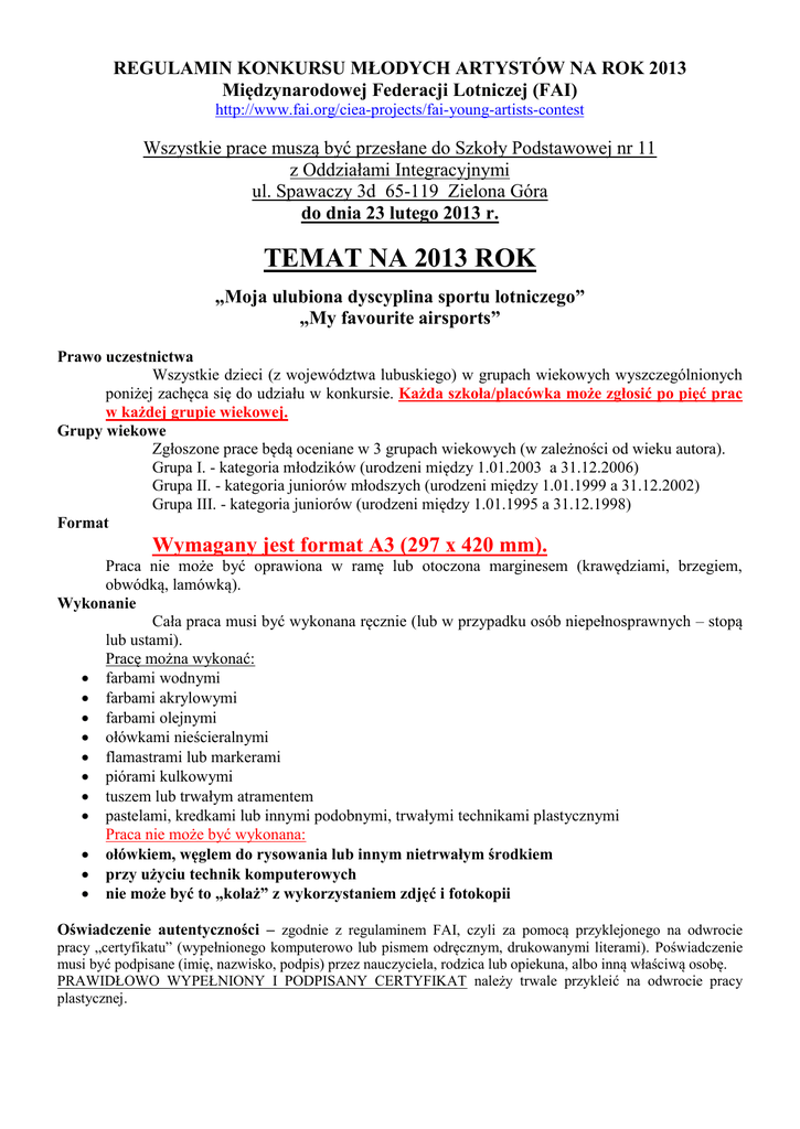 REGULAMIN KONKURSU MŁODYCH ARTYSTÓW NA ROK 2013 Międzynarodowej Federacji Lotniczej (FAI) http://www.fai.org/ciea-projects/fai-young-artists-contest Wszystkie prace muszą być przesłane do Szkoły Podstawowej nr 11 z Oddziałami Integracyjnymi ul. Spawaczy 3d 65-119 Zielona Góra do dnia 23 lutego 2013 r. TEMAT NA 2013 ROK „Moja ulubiona dyscyplina sportu lotniczego” „My favourite airsports” Prawo uczestnictwa Wszystkie dzieci (z województwa lubuskiego) w grupach wiekowych wyszczególnionych poniżej zachęca się do udziału w konkursie. Każda szkoła/placówka może zgłosić po pięć prac w każdej grupie wiekowej. Grupy wiekowe Zgłoszone prace będą oceniane w 3 grupach wiekowych (w zależności od wieku autora). Grupa I. - kategoria młodzików (urodzeni między 1.01.2003 a 31.12.2006) Grupa II. - kategoria juniorów młodszych (urodzeni między 1.01.1999 a 31.12.2002) Grupa III. - kategoria juniorów (urodzeni między 1.01.1995 a 31.12.1998) Format Wymagany jest format A3 (297 x 420 mm). Praca nie może być oprawiona w ramę lub otoczona marginesem (krawędziami, brzegiem, obwódką, lamówką). Wykonanie Cała praca musi być wykonana ręcznie (lub w przypadku osób niepełnosprawnych – stopą lub ustami). Pracę można wykonać: farbami wodnymi farbami akrylowymi farbami olejnymi ołówkami nieścieralnymi flamastrami lub markerami piórami kulkowymi tuszem lub trwałym atramentem pastelami, kredkami lub innymi podobnymi, trwałymi technikami plastycznymi Praca nie może być wykonana: ołówkiem, węglem do rysowania lub innym nietrwałym środkiem przy użyciu technik komputerowych nie może być to „kolaż” z wykorzystaniem zdjęć i fotokopii Oświadczenie autentyczności – zgodnie z regulaminem FAI, czyli za pomocą przyklejonego na odwrocie pracy „certyfikatu” (wypełnionego komputerowo lub pismem odręcznym, drukowanymi literami). Poświadczenie musi być podpisane (imię, nazwisko, podpis) przez nauczyciela, rodzica lub opiekuna, albo inną właściwą osobę. PRAWIDŁOWO WYPEŁNIONY I PODPISANY CERTYFIKAT należy trwale przykleić na odwrocie pracy plastycznej. Do etapu ogólnopolskiego zostaną przesłane po dwie zwycięskie prace w każdej grupie wiekowej. Laureaci otrzymają pamiątkowe dyplomy. Wyniki etapu wojewódzkiego zostaną opublikowane na stronie http://www.rcazl.pl/ Interpretacja tematu na rok 2013 Międzynarodowa Federacja Lotnicza (FAI) została założona w 1905 w celu promowania sportów lotniczych. Od tamtego czasu zostało rozwiniętych wiele nowych dyscyplin, w których przeprowadzane są zawody na całym świecie. Obecnie istnieje jedenaście dyscyplin sportu lotniczego: akrobacja lotnicza modelarstwo lotnicze i kosmiczne amatorskie i eksperymentalne konstrukcje lotnicze rekordy kosmiczne baloniarstwo lotnictwo ogólne szybownictwo lotniarstwo i paralotniarstwo mikroloty i motoparalotnie spadochroniarstwo wiropłaty Młody Twórco!!! Przeanalizuj każdą z wyżej wymienionych dyscyplin sportu lotniczego i wybierz tę, która Tobie najbardziej odpowiada. Jednak na pewno zadasz sobie pytanie: „którą dyscyplinę wybrać?”. Zastanów się, jak by wyglądało latanie „do góry nogami” lub kręcenie akrobacji na niebie. Być może lubisz budować modele samolotów, a może chciałbyś kiedyś zostać konstruktorem prawdziwych samolotów! Możliwe, że chciałbyś pilotować balon, samolot, śmigłowiec, szybowiec czy nawet statek kosmiczny. Zastanów się gdzie by Cię przeniósł twój „statek powietrzny” i co byś tam widział? Wyobraź sobie, że startujesz ze stoku góry zawieszony pod lotnią lub paralotnią a potem bezgłośnie szybujesz jak ptak. Jeśli jednak preferujesz start z płaskiego podłoża, może chciałbyś latać mikrolotem lub paralotnią z napędem! Jeżeli wolisz bardziej ekstremalne odczucia to czy zdecydowałbyś się wyskoczyć z samolotu i spadać w kierunku ziemi mając nad sobą spadochron? Zastanów się na temat „Swojej ulubionej dyscypliny sportu lotniczego”. Jak będzie wyglądał twój aparat latający lub statek kosmiczny? Przed podjęciem ostatecznej decyzji, wyobraź sobie wszystkie możliwości, a potem weź swoje ulubione kredki, pisaki czy farby i stwórz plakat poświęcony „Twojej ulubionej dyscyplinie sportu lotniczego”. Tłumaczenie Andrzej Łukaszewicz