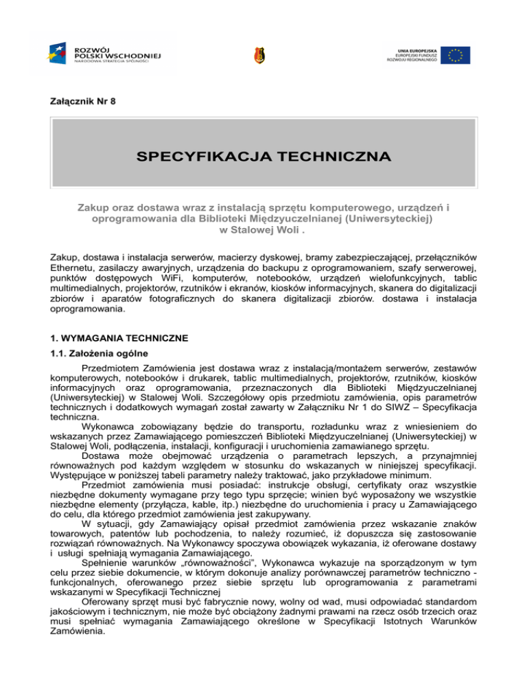 Załącznik Nr 8 SPECYFIKACJA TECHNICZNA Zakup oraz dostawa wraz z instalacją sprzętu komputerowego, urządzeń i oprogramowania dla Biblioteki Międzyuczelnianej (Uniwersyteckiej) w Stalowej Woli . Zakup, dostawa i instalacja serwerów, macierzy dyskowej, bramy zabezpieczającej, przełączników Ethernetu, zasilaczy awaryjnych, urządzenia do backupu z oprogramowaniem, szafy serwerowej, punktów dostępowych WiFi, komputerów, notebooków, urządzeń wielofunkcyjnych, tablic multimedialnych, projektorów, rzutników i ekranów, kiosków informacyjnych, skanera do digitalizacji zbiorów i aparatów fotograficznych do skanera digitalizacji zbiorów. dostawa i instalacja oprogramowania. 1. WYMAGANIA TECHNICZNE 1.1. Założenia ogólne Przedmiotem Zamówienia jest dostawa wraz z instalacją/montażem serwerów, zestawów komputerowych, notebooków i drukarek, tablic multimedialnych, projektorów, rzutników, kiosków informacyjnych oraz oprogramowania, przeznaczonych dla Biblioteki Międzyuczelnianej (Uniwersyteckiej) w Stalowej Woli. Szczegółowy opis przedmiotu zamówienia, opis parametrów technicznych i dodatkowych wymagań został zawarty w Załączniku Nr 1 do SIWZ – Specyfikacja techniczna. Wykonawca zobowiązany będzie do transportu, rozładunku wraz z wniesieniem do wskazanych przez Zamawiającego pomieszczeń Biblioteki Międzyuczelnianej (Uniwersyteckiej) w Stalowej Woli, podłączenia, instalacji, konfiguracji i uruchomienia zamawianego sprzętu. Dostawa może obejmować urządzenia o parametrach lepszych, a przynajmniej równoważnych pod każdym względem w stosunku do wskazanych w niniejszej specyfikacji. Występujące w poniższej tabeli parametry należy traktować, jako przykładowe minimum. Przedmiot zamówienia musi posiadać: instrukcje obsługi, certyfikaty oraz wszystkie niezbędne dokumenty wymagane przy tego typu sprzęcie; winien być wyposażony we wszystkie niezbędne elementy (przyłącza, kable, itp.) niezbędne do uruchomienia i pracy u Zamawiającego do celu, dla którego przedmiot zamówienia jest zakupywany. W sytuacji, gdy Zamawiający opisał przedmiot zamówienia przez wskazanie znaków towarowych, patentów lub pochodzenia, to należy rozumieć, iż dopuszcza się zastosowanie rozwiązań równoważnych. Na Wykonawcy spoczywa obowiązek wykazania, iż oferowane dostawy i usługi spełniają wymagania Zamawiającego. Spełnienie warunków „równoważności”, Wykonawca wykazuje na sporządzonym w tym celu przez siebie dokumencie, w którym dokonuje analizy porównawczej parametrów techniczno funkcjonalnych, oferowanego przez siebie sprzętu lub oprogramowania z parametrami wskazanymi w Specyfikacji Technicznej Oferowany sprzęt musi być fabrycznie nowy, wolny od wad, musi odpowiadać standardom jakościowym i technicznym, nie może być obciążony żadnymi prawami na rzecz osób trzecich oraz musi spełniać wymagania Zamawiającego określone w Specyfikacji Istotnych Warunków Zamówienia. W celu potwierdzenia parametrów oferowanego przedmiotu zamówienia należy do oferty dołączyć opisy w formie papierowej, które w sposób jednoznaczny pozwolą stwierdzić, że parametry oferowanego sprzętu będą zgodne z wymaganiami Zamawiającego. Urządzenie musi spełniać wymagania dyrektywy "Nowego Podejścia UE” znak CE. 1.2. Informacje dotyczące prac instalacyjnych i konfiguracyjnych, do których zobowiązany zostanie Wykonawca w ramach danej części zamówienia: Wykonawca zainstaluje i dokona konfiguracji kompletnego systemu informatycznego, a w szczególności wykona prace w następującym zakresie: Montażu i instalacji urządzeń sieciowych (szafa LAN, router, przełączniki, itp.) Montażu i instalacji klastra wirtualizacyjnego (serwery i macierze), Montażu i instalacji systemu zasilania awaryjnego, w tym obwodów elektrycznych zasilających UPS, Konfiguracji urządzeń sieciowych zgodnie z zaleceniami Zamawiającego obejmującej utworzenie VLANów, konfigurację zapory sieciowej, zabezpieczeń ruchu sieciowego w warstwie 37 ISO/OSI, konfiguracja routingu wewnętrznego i zewnętrznego (obejmująca użycie wielu łączy zewnętrznych), konfiguracja tuneli VPN, Konfiguracji klastra wirtualizacyjnego zgodnie z zaleceniami Zamawiającego obejmującej konfigurację maszyn – hostów, nadmiarowe ścieżki połączeń do macierzy (SAN), instalację i konfigurację systemów - gości (Windows, Linux lub równoważne) oraz konfigurację usług klastra wirtualizacyjnego (HA, bezprzerwowe przenoszenie działających maszyn pomiędzy hostami), Konfiguracji powiadamiania o awariach zasilania oraz automatyczne wyłączanie całego klastra wirtualizacyjnego przed całkowitym rozładowaniem baterii UPS, Instalacji i konfiguracji systemu backupu zgodnie z zaleceniami Zamawiającego (archiwizacja komputerów pracujących w sieci lokalnej) Opracowania i wdrożenia polityki bezpieczeństwa w oparciu o dane przekazane przez Zamawiającego Przeprowadzenia testów odporności klastra wirtualizacyjnego na awarie (uszkodzenia serwera, zasilania) Instalacji pełnego pakietu oprogramowania na komputerach klienckich wraz z aktualizacjami Uruchomienia stanowisk klienckich w miejscach wskazanych przez Zamawiającego Konfiguracji kontrolera domeny opartego o Win 2008R2 lub równoważne, obejmująca dołączenie istniejących urządzeń do jednostek organizacyjnych. Założenie kont użytkowników z odpowiednimi uprawnieniami. Instalacja i uruchomienie projektorów multimedialnych na dostarczonych mocowaniach (winda, wysięgniki) oraz ekranów w miejscach wskazanych przez Zamawiającego. Należy dokonać podłączenia projektorów we wskazanych przez Zamawiającego miejscach, Instalacja i uruchomienie punktów dostępowych WiFi, Instalacja i uruchomienie kiosków informacyjnych, Wykonawca sporządzi i przekaże Zamawiającemu dokumentację obejmującą zakres prac konfiguracyjnych. Zakup, dostawa i instalacja serwerów, macierzy dyskowej, bramy zabezpieczającej