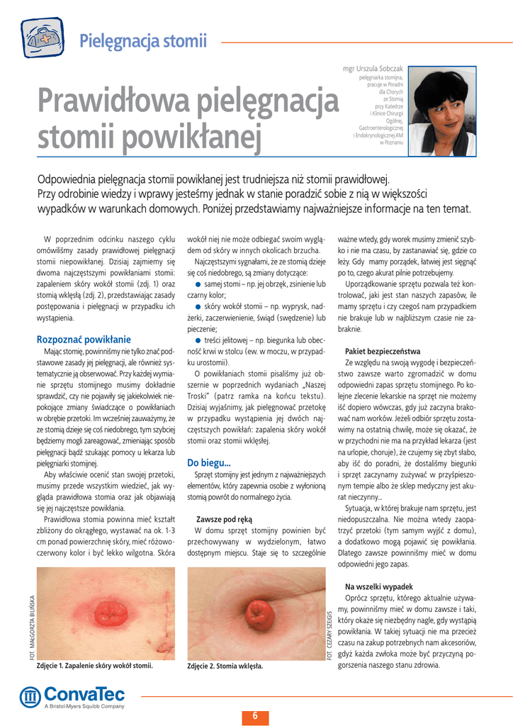 Pielęgnacja stomii mgr Urszula Sobczak Prawidłowa pielęgnacja stomii powikłanej pielęgniarka stomijna, pracuje w Poradni dla Chorych ze Stomią przy Katedrze i Klinice Chirurgii Ogólnej, Gastroenterologicznej i Endokrynologicznej AM w Poznaniu Odpowiednia pielęgnacja stomii powikłanej jest trudniejsza niż stomii prawidłowej. Przy odrobinie wiedzy i wprawy jesteśmy jednak w stanie poradzić sobie z nią w większości wypadków w warunkach domowych. Poniżej przedstawiamy najważniejsze informacje na ten temat. W poprzednim odcinku naszego cyklu omówiliśmy zasady prawidłowej pielęgnacji stomii niepowikłanej. Dzisiaj zajmiemy się dwoma najczęstszymi powikłaniami stomii: zapaleniem skóry wokół stomii (zdj. 1) oraz stomią wklęsłą (zdj. 2), przedstawiając zasady postępowania i pielęgnacji w przypadku ich wystąpienia. Rozpoznać powikłanie ważne wtedy, gdy worek musimy zmienić szybko i nie ma czasu, by zastanawiać się, gdzie co leży. Gdy mamy porządek, łatwiej jest sięgnąć po to, czego akurat pilnie potrzebujemy. Uporządkowanie sprzętu pozwala też kontrolować, jaki jest stan naszych zapasów, ile mamy sprzętu i czy czegoś nam przypadkiem nie brakuje lub w najbliższym czasie nie zabraknie. Pakiet bezpieczeństwa Ze względu na swoją wygodę i bezpieczeństwo zawsze warto zgromadzić w domu odpowiedni zapas sprzętu stomijnego. Po kolejne zlecenie lekarskie na sprzęt nie możemy iść dopiero wówczas, gdy już zaczyna brakować nam worków. Jeżeli odbiór sprzętu zostawimy na ostatnią chwilę, może się okazać, że w przychodni nie ma na przykład lekarza (jest na urlopie, choruje), że czujemy się zbyt słabo, aby iść do poradni, że dostaliśmy biegunki i sprzęt zaczynamy zużywać w przyśpieszonym tempie albo że sklep medyczny jest akurat nieczynny… Sytuacja, w której brakuje nam sprzętu, jest niedopuszczalna. Nie można wtedy zaopatrzyć przetoki (tym samym wyjść z domu), a dodatkowo mogą pojawić się powikłania. Dlatego zawsze powinniśmy mieć w domu odpowiedni jego zapas. Do biegu… Sprzęt stomijny jest jednym z najważniejszych elementów, który zapewnia osobie z wyłonioną stomią powrót do normalnego życia. Zawsze pod ręką W domu sprzęt stomijny powinien być przechowywany w wydzielonym, łatwo dostępnym miejscu. Staje się to szczególnie FOT. CEZARY SZEJGIS FOT. MAŁGORZTA BILIŃSKA Mając stomię,powinniśmy nie tylko znać podstawowe zasady jej pielęgnacji, ale również systematycznie ją obserwować. Przy każdej wymianie sprzętu stomijnego musimy dokładnie sprawdzić, czy nie pojawiły się jakiekolwiek niepokojące zmiany świadczące o powikłaniach w obrębie przetoki. Im wcześniej zauważymy, że ze stomią dzieje się coś niedobrego, tym szybciej będziemy mogli zareagować, zmieniając sposób pielęgnacji bądź szukając pomocy u lekarza lub pielęgniarki stomijnej. Aby właściwie ocenić stan swojej przetoki, musimy przede wszystkim wiedzieć, jak wygląda prawidłowa stomia oraz jak objawiają się jej najczęstsze powikłania. Prawidłowa stomia powinna mieć kształt zbliżony do okrągłego, wystawać na ok. 1-3 cm ponad powierzchnię skóry, mieć różowoczerwony kolor i być lekko wilgotna. Skóra wokół niej nie może odbiegać swoim wyglądem od skóry w innych okolicach brzucha. Najczęstszymi sygnałami, że ze stomią dzieje się coś niedobrego, są zmiany dotyczące: samej stomi – np. jej obrzęk, zsinienie lub czarny kolor; skóry wokół stomii – np. wyprysk, nadżerki, zaczerwienienie, świąd (swędzenie) lub pieczenie; treści jelitowej – np. biegunka lub obecność krwi w stolcu (ew. w moczu, w przypadku urostomii). O powikłaniach stomii pisaliśmy już obszernie w poprzednich wydaniach „Naszej Troski” (patrz ramka na końcu tekstu). Dzisiaj wyjaśnimy, jak pielęgnować przetokę w przypadku wystąpienia jej dwóch najczęstszych powikłań: zapalenia skóry wokół stomii oraz stomii wklęsłej. Zdjęcie 1. Zapalenie skóry wokół stomii. Zdjęcie 2. Stomia wklęsła. 6 Na wszelki wypadek Oprócz sprzętu, którego aktualnie używamy, powinniśmy mieć w domu zawsze i taki, który okaże się niezbędny nagle, gdy wystąpią powikłania. W takiej sytuacji nie ma przecież czasu na zakup potrzebnych nam akcesoriów, gdyż każda zwłoka może być przyczyną pogorszenia naszego stanu zdrowia. Zdjęcie 4. Płytka wypukła Convex dwuczęściowego sprzętu Combihesive 2 przeznaczona jest, ze względu na swój wypukły kształt, do zaopatrzenia stomii wklęsłej. Jest kilka produktów, które zawsze, bez względu na rodzaj używanego przez nas sprzętu, powinniśmy mieć stale pod ręką. Są to: pasta uszczelniająco-gojąca Stomahesive; puder Stomahesive; gaziki ConvaCare (oba ich rodzaje); płytki Stomahesive dwuczęściowego systemu Combihesive 2S i, odpowiednie do rodzaju stomii, worki. Powyższe produkty są nieocenione, gdy zaczynają się problemy, takie jak nieszczelność sprzętu, podciekanie treści jelitowej pod płytkę lub przylepiec, zmniejszone przyleganie sprzętu do skóry czy zapalenie skóry wokół stomii. (do mycia), ręcznik lub papier toaletowy (do osuszania skóry), małe lusterko, worek na odpadki oraz sprzęt stomijny i akcesoria. Kącik w łazience Wymiana sprzętu stomijnego powinna odbywać się w spokoju i w odpowiednich warunkach, szczególnie jeżeli mamy do czynienia ze stomią powikłaną. W tym celu warto znaleźć sobie w mieszkaniu specjalne miejsce, w którym będziemy mogli bez pośpiechu wykonywać wszystkie zabiegi pielęgnacyjne. Najlepiej – ze względu na dostęp do bieżącej wody – aby była to łazienka. Gotowi… Zanim przystąpimy do wymiany sprzętu, należy się do tej czynności starannie przygotować. Ważne, aby zawczasu zgromadzić wszystko, czego będziemy potrzebowali. Koniecznie też należy wcześniej dopasować i dociąć nową płytkę do wielkości i kształtu stomii, zanim odkleimy od sk
