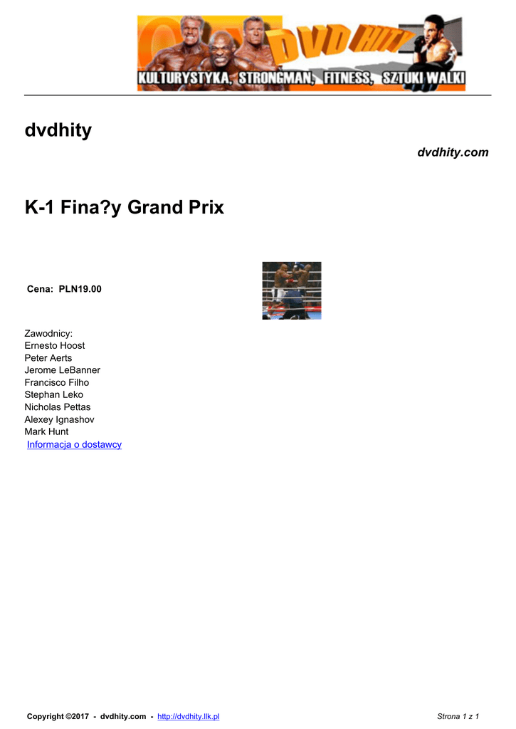 dvdhity dvdhity.com K-1 Fina?y Grand Prix Cena: PLN19.00 Zawodnicy: Ernesto Hoost Peter Aerts Jerome LeBanner Francisco Filho Stephan Leko Nicholas Pettas Alexey Ignashov Mark Hunt Informacja o dostawcy Copyright ©2017 - dvdhity.com - http://dvdhity.llk.pl Strona 1 z 1