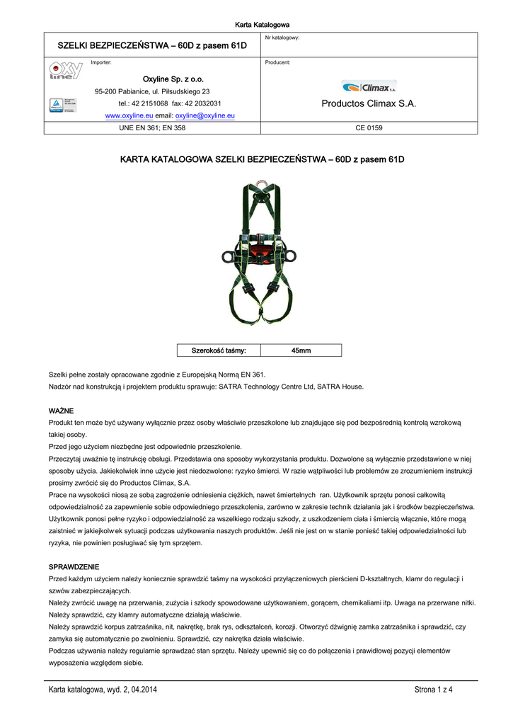 Karta Katalogowa SZELKI BEZPIECZEŃSTWA – 60D z pasem 61D Importer: Nr katalogowy: ……………………………………….. Producent: Oxyline Sp. z o.o. 95-200 Pabianice, ul. Piłsudskiego 23 Productos Climax S.A. tel.: 42 2151068 fax: 42 2032031 www.oxyline.eu email: [email protected] UNE EN 361; EN 358 CE 0159 KARTA KATALOGOWA SZELKI BEZPIECZEŃSTWA – 60D z pasem 61D Szerokość taśmy: 45mm Szelki pełne zostały opracowane zgodnie z Europejską Normą EN 361. Nadzór nad konstrukcją i projektem produktu sprawuje: SATRA Technology Centre Ltd, SATRA House. WAŻNE Produkt ten może być używany wyłącznie przez osoby właściwie przeszkolone lub znajdujące się pod bezpośrednią kontrolą wzrokową takiej osoby. Przed jego użyciem niezbędne jest odpowiednie przeszkolenie. Przeczytaj uważnie tę instrukcję obsługi. Przedstawia ona sposoby wykorzystania produktu. Dozwolone są wyłącznie przedstawione w niej sposoby użycia. Jakiekolwiek inne użycie jest niedozwolone: ryzyko śmierci. W razie wątpliwości lub problemów ze zrozumieniem instrukcji prosimy zwrócić się do Productos Climax, S.A. Prace na wysokości niosą ze sobą zagrożenie odniesienia ciężkich, nawet śmiertelnych ran. Użytkownik sprzętu ponosi całkowitą odpowiedzialność za zapewnienie sobie odpowiedniego przeszkolenia, zarówno w zakresie technik działania jak i środków bezpieczeństwa. Użytkownik ponosi pełne ryzyko i odpowiedzialność za wszelkiego rodzaju szkody, z uszkodzeniem ciała i śmiercią włącznie, które mogą zaistnieć w jakiejkolw:ek sytuacji podczas użytkowania naszych produktów. Jeśli nie jest on w stanie ponieść takiej odpowiedzialności lub ryzyka, nie powinien posługiwać się tym sprzętem. SPRAWDZENIE Przed każdym użyciem należy koniecznie sprawdzić taśmy na wysokości przyłączeniowych pierścieni D-kształtnych, klamr do regulacji i szwów zabezpieczających. Należy zwrócić uwagę na przerwania, zużycia i szkody spowodowane użytkowaniem, gorącem, chemikaliami itp. Uwaga na przerwane nitki. Należy sprawdzić, czy klamry automatyczne działają właściwie. Należy sprawdzić korpus zatrzaśnika, nit, nakrętkę, brak rys, odkształceń, korozji. Otworzyć dźwignię zamka zatrzaśnika i sprawdzić, czy zamyka się automatycznie po zwolnieniu. Sprawdzić, czy nakrętka działa właściwie. Podczas używania należy regularnie sprawdzać stan sprzętu. Należy upewnić się co do połączenia i prawidłowej pozycji elementów wyposażenia względem siebie. Karta katalogowa, wyd. 2, 04.2014 Strona 1 z 4 INSTRUKCJA UŻYTKOWANIA Szelki bezpieczeństwa są sprzętem ochrony indywidualnej przeciw upadkom i powinny być używane w połączeniu z urządzeniami kotwiczącymi zgodnymi z normą EN 795, łącznikami zgodnymi z normą EN 362, amortyzatorami zgodnymi z normą EN 355 itd. Przed użyciem sprzętu niezbędne jest podjęcie wszelkich możliwych środków zabezpieczających. Zalecane jest właściwe przeszkolenie z technik ratownictwa. Należy przetestować zgodność sprzętu z pozostałymi elementami systemu (patrz instrukcja właściwa dla produktu). 1. Zakładanie szelek a. b. c. d. Chwyć szelki za tylną klamrę D. Potrząśnij szelkami, aby wszystkie taśmy znalazły się na swoim miejscu. Jeżeli taśmy piersiowe i/lub pas biodrowy są połączone, rozłącz je. Nałóż szelki na barki tak, aby klamra D znalazła się w połowie pleców, między łopatkami a barkami. Pociągnij taśmę udową i połącz jej przeciwległy koniec. Powtórz to samo z drugą taśmą udową. Jeśli szelki są wyposażone w pas, przypnij go po przypięciu taśm udowych. e. f. Przypnij taśmę piersiową w połowie klatki piersiowej. Dopasuj linki na klatce piersiowej tak, aby taśmy barkowe pozostały napięte. Po przypięciu wszystkich taśm, dopasuj klamry tak, aby szelki przylegały do ciała i umożliwiały jednocześnie szeroki zakres ruchów. Przeciągnij luźne odcinki taśm przez plastikowe szlufki. Użytkownik powinien wykonać w sprzęcie ruchy i próbę zawieszenia w każdym punkcie przyłączenia, aby upewnić się, że: ma on właściwy rozmiar, zapewnia wygodę na poziomie niezbędnym dla przewidzianego użycia i jest optymalnie wyregulowany. Podczas użytkowania regularnie sprawdzaj elementy służące do regulacji i/lub zamocowania. 2a. Grzbietowy punkt przyłączenia zabezpieczenia przed upadkiem 2b. Punkt przyłączenia piersiowy (Klamry D-kształtne należy połączyć za pomocą łącznika zgodnego z normą EN 362) Tylko te punkty przyłączeniowe służą do przypięcia systemu ochrony przed upadkiem, jak na przykład linowy przesuwny system zabezpieczający przed upadkiem, amortyzator itp. systemy opisane w normie EN 363. Punkty te oznaczone są literą A celem łatwiejszej identyfikacji. Pod użytkownikiem musi znajdować się wystarczająca ilość wolnej przestrzeni by nie uderzył on o żadną przeszkodę w razie upadku. Szczegółowe obliczenia bezpiecznej odległości znajdują się w instrukcjach obsługi pozostałych składników systemu (absorberów energii, przesuwnych systemów zabezpieczenia przed upadkiem itp). 2. Zgodność: klamry / łączniki Niekompatybilne połączenie może doprowadzić do przypadkowego wypięcia, uszkodzenia lub może negatywnie wpłynąć na bezpieczeństwo innych elementów wyposażenia. Sprawdzaj systematycznie, czy zamek zatrzaśnika jest właściwie zablokowany, przyciskając go dłonią. Sprawdź stan zatrzaśników zgodnie ze wskazówkami zawartymi w instrukcji użytkowania. Uwaga, klamry przyłączeniowe uprzęży biodrowej mogą powodować otwarcie zamka karabinka. Podczas gwałtownego nacisku na linkę zabezpieczającą i/lub uderzenia na system blokujący połączonego ze złą pozycją karabinka, nakrętka może ulec uszkodzeniu i zamek karabinka może się otworzyć. Aby wyeliminować tę możliwość, staraj się przy każdym obciążeniu systemu odpowiednio rozmieścić zatrzaśni