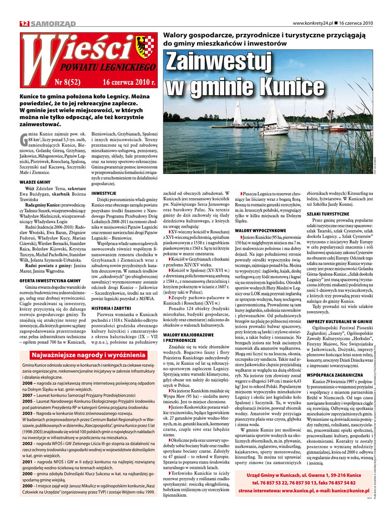 12 samorząd www.konkrety24.pl 16 czerwca 2010 Walory gospodarcze, przyrodnicze i turystyczne przyciągają do gminy mieszkańców i inwestorów Władze gminy Wójt Zdzisław Tersa, sekretarz Ewa Bużdygan, skarbnik Bożena Trawińska Rada gminy Kunice: przewodniczący Tadeusz Suszek, wiceprzewodniczący Władysław Mielniczuk, wiceprzewodniczący Władysława Łogin Radni (kadencja 2006-2010): Radosław Wroński, Ewa Baran, Zbigniew Fedoruś, Władysław Kucy, Marian Ciżewski), Wiesław Bernacki, Stanisław Rajca, Bolesław Kijowski, Krystyna Turczyn, Michał Pachołków, Stanisław Wilk, Jolanta Szymonik-Urbańska. Radni powiatu z gminy: Janina Mazur, Janina Wągrodna. Oferta inwestycyjna gminy Gmina stwarza dogodne warunki do rozwoju budownictwa jednorodzinnego, usług oraz drobnej wytwórczości. Ciągle poszukiwani są inwestorzy, którzy przyczynią się do dalszego rozwoju gospodarczego gminy. Tu znajdują się atrakcyjne tereny pod inwestycje, dla których gotowe są plany zagospodarowania przestrzennego oraz pełna infrastruktura techniczna – ogółem ponad 700 ha w Kunicach, Bieniowicach, Grzybianach, Spalonej i innych miejscowościach. Tereny przeznaczone są też pod zabudowę mieszkaniowo-usługową, pensjonaty, magazyny, składy, hale przemysłowe oraz na tereny sportowo-rekreacyjne. Gmina gwarantuje pomoc inwestorom w przeprowadzeniu formalności związanych z uruchomieniem tu działalności gospodarczej. inwestycje Dzięki porozumieniu władz gminy Kunice oraz obecnego zarządu powiatu pozyskano środki finansowe z Narodowego Programu Przebudowy Dróg Lokalnych 2008-2011 na remont chodnika w miejscowości Pątnów Legnicki oraz remont nawierzchni drogi Pątnów Legnicki – Bieniowice. Współpraca władz samorządowych zaowocowała również wspólnym finansowaniem remontu chodnika w Grzybianach i Ziemnicach wraz z zabudową rowów przydrożnych kanałem deszczowym. W ramach środków tzw. „szkodowych” (po ubiegłorocznej nawałnicy) wyremontowany zostanie odcinek drogi Kunice – Jaśkowice – Szczedrzykowice, środki na ten cel powiat legnicki pozyskał z MSWiA. Historia i zabytki Pierwsza wzmianka o Kunicach pochodzi z 1318 r. Niedaleko odkryto pozostałości grodziska obronnego kultury łużyckiej i cmentarzysko z okresu halsztackiego (IX – VII w.p.n.e.), położone na południowy Najważniejsze nagrody i wyróżnienia Gmina Kunice odniosła sukcesy w konkursach i rankingach za ciekawe rozwiązania organizacyjne, niekonwencjonalne inicjatywy w zakresie infrastruktury i działania ekologiczne. 2008 – nagroda za najciekawszą stronę internetową poświęconą odpadom na Dolnym Śląsku w kat. gmin wiejskich. 2007 – Laureat konkursu Samorząd Przyjazny Przedsiębiorczości 2005 – Laureat Narodowego Konkursu Ekologicznego Przyjaźni środowisku pod patronatem Prezydenta RP w kategorii Gmina przyjazna środowisku 2003 – Nagroda w konkursie Mistrz zrównoważonego rozwoju. W badaniach przeprowadzonych przez Centrum Badań Regionalnych w Warszawie, publikowanych w dzienniku „Rzeczpospolita”, gmina Kunice przez 5 lat (1998-2003) znajdowała się wśród 100 polskich gmin o największych nakładach na inwestycje w infrastrukturę w przeliczeniu na mieszkańca. 2002 – nagroda WFOŚ i GW Zielonego Liścia III-go stopnia za działalność na rzecz ochrony środowiska i gospodarki wodnej w województwie dolnośląskim w kat. gmin wiejskich. 2001 – nagroda NFOŚ i GW w II edycji konkursu na najlepiej rozwiązaną gospodarkę wodno-ściekową na terenach wiejskich. 2000 – gmina zdobyła Dolnośląski Klucz Sukcesu w kat. na najbardziej gospodarną gminę wiejską. 2000 – I miejsce zajął wójt Janusz Mikulicz w ogólnopolskim konkursie „Nasz Człowiek na Urzędzie” (organizowany przez TVP) i zostaje Wójtem roku 1999. fot. ug kunice G mina Kunice zajmuje pow. ok. 88 km2, liczy ponad 5,5 tys. osób, zamieszkujących Kunice, Bieniowice, Golankę Górną, Grzybiany, Jaśkowice, Miłogostowice, Pątnów Legnicki, Piotrówek, Rosochatą, Spaloną, Szczytniki nad Kaczawą, Szczytniki Małe i Ziemnice. zachód od obecnych zabudowań. W Kunicach jest renesansowy kościółek pw. Najświętszego Serca Jezusowego oraz barokowy Pałac. Na terenie gminy do dziś zachowały się ślady dziedzictwa kulturowego, z których na uwagę zasługują: wXV-wieczny kościół w Rosochatej z XVI-wieczną polichromią, epitafium piaskowcowym z 1538 r. i nagrobkiem piaskowcowym z 1563 r. Są tu też krzyże pokutne w murze cmentarza. wKościół w Grzybianach z freskami z przełomu XIV/XV wieku. wKościół w Spalonej (XV-XVI w.) z drewnianą polichromowaną amboną z 1584 r., z renesansową chrzcielnicą i krzyżem pokutnym w ścianie z 1607 r. (jedyny taki w Polsce). wZespoły parkowo-pałacowe w Kunicach i Rosochatej (XVI w.) Ponadto 124 obiekty (budynki mieszkalne, budynki gospodarcze, kościoły oraz cmentarze) zaliczono do obiektów o walorach kulturowych. Walory krajobrazowe i przyrodnicze Znajduje się tu wiele zbiorników wodnych. Bogactwo fauny i flory Pojezierza Kunickiego zadecydowały o tym, że Kunice od lat są rekreacyjno-sportowym zapleczem Legnicy. Sprzyjają temu warunki klimatyczne, gdyż obszar ten należy do najcieplejszych w Polsce. wNa jeziorze Kunickim znajduje się Wyspa Mew (95 ha) – siedziba mewy śmieszki. Jest to miejsce chronione. wJezioro Koskowickie porasta wielkie trzcinowisko, będące lęgowiskiem ok. 27 gatunków ptaków wodno-błotnych, m.in. gatunki kaczek, kormorany czarne, czaple siwe oraz łabędzie nieme. wOkoliczne pola oraz szuwary upodobały sobie bociany białe oraz rzadko spotykane bociany czarne. Założyły tu 47 gniazd – to rekord w Europie. Sprawia to poprawa stanu środowiska naturalnego w ostatnich latach. wTorfowisko Kunickie to ścisły rezerwat przyrody z roślinami rzadko spotykanymi: rosiczką okrągłolistną, bobrkiem trójlistnym czy storczykiem lipiennikiem. wPuszcza Legnica to rezerwat chroniący las liś