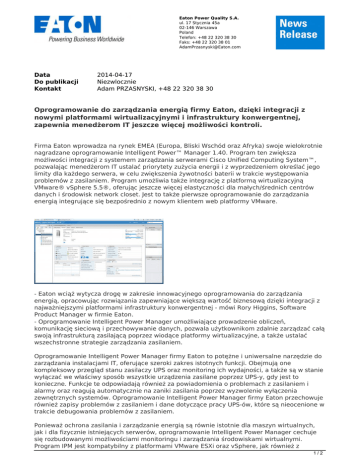 Eaton Power Quality S.A. ul. 17 Stycznia 45a 02-146 Warszawa Poland Telefon: +48 22 320 38 30 Faks: +48 22 320 38 01 [email protected] Data Do publikacji Kontakt 2014-04-17 Niezwlocznie Adam PRZASNYSKI, +48 22 320 38 30 Oprogramowanie do zarządzania energią firmy Eaton, dzięki integracji z nowymi platformami wirtualizacyjnymi i infrastruktury konwergentnej, zapewnia menedżerom IT jeszcze więcej możliwości kontroli. Firma Eaton wprowadza na rynek EMEA (Europa, Bliski Wschód oraz Afryka) swoje wielokrotnie nagradzane oprogramowanie Intelligent Power™ Manager 1.40. Program ten zwiększa możliwości integracji z systemem zarządzania serwerami Cisco Unified Computing System™, pozwalając menedżerom IT ustalać priorytety zużycia energii i z wyprzedzeniem określać jego limity dla każdego serwera, w celu zwiększenia żywotności baterii w trakcie występowania problemów z zasilaniem. Program umożliwia także integrację z platformą wirtualizacyjną VMware® vSphere 5.5®, oferując jeszcze więcej elastyczności dla małych/średnich centrów danych i środowisk network closet. Jest to także pierwsze oprogramowanie do zarządzania energią integrujące się bezpośrednio z nowym klientem web platformy VMware. - Eaton wciąż wytycza drogę w zakresie innowacyjnego oprogramowania do zarządzania energią, opracowując rozwiązania zapewniające większą wartość biznesową dzięki integracji z najważniejszymi platformami infrastruktury konwergentnej - mówi Rory Higgins, Software Product Manager w firmie Eaton. - Oprogramowanie Intelligent Power Manager umożliwiające prowadzenie obliczeń, komunikację sieciową i przechowywanie danych, pozwala użytkownikom zdalnie zarządzać całą swoją infrastrukturą zasilającą poprzez wiodące platformy wirtualizacyjne, a także ustalać wszechstronne strategie zarządzania zasilaniem. Oprogramowanie Intelligent Power Manager firmy Eaton to potężne i uniwersalne narzędzie do zarządzania instalacjami IT, oferujące szeroki zakres istotnych funkcji. Obejmują one kompleksowy przegląd stanu zasilaczy UPS oraz monitoring ich wydajności, a także są w stanie wyłączać we właściwy sposób wszystkie urządzenia zasilane poprzez UPS-y, gdy jest to konieczne. Funkcje te odpowiadają również za powiadomienia o problemach z zasilaniem i alarmy oraz reagują automatycznie na zaniki zasilania poprzez wyzwolenie wyłączenia zewnętrznych systemów. Oprogramowanie Intelligent Power Manager firmy Eaton przechowuje również zapisy problemów z zasilaniem i dane dotyczące pracy UPS-ów, które są nieocenione w trakcie debugowania problemów z zasilaniem. Ponieważ ochrona zasilania i zarządzanie energią są równie istotnie dla maszyn wirtualnych, jak i dla fizycznie istniejących serwerów, oprogramowanie Intelligent Power Manager cechuje się rozbudowanymi możliwościami monitoringu i zarządzania środowiskami wirtualnymi. Program IPM jest kompatybilny z platformami VMware ESXi oraz vSphere, jak również z 1/2 Hyper-V Microsoftu i umożliwia uporządkowane zamknięcie wielu maszyn wirtualnych i hipernadzorców. Ze względu na ścisłą integrację z rozwiązaniam z zakresu zarządzania maszynami wirtualnymi, takimi jak vCenter, SCVMM i XenCenter, Intelligent Power Manager ułatwia również zapewnienie zerowego czasu przestoju aplikacji w trakcie migracji na żywo maszyn wirtualnych w przypadku awarii zasilania. Intelligent Power Manager 1.40 można pobrać ze strony www.eaton.eu/powerquality . Podstawowa licencja obejmuje zarządzanie maksymalnie 10 połączonymi urządzeniami i jest darmowa. Aby zarządzać większą ilością urządzeń można wykupić srebrne lub złote licencje. Nowe materiały wideo zapewniające nieocenione informacje na temat wielokrotnie nagradzanego oprogramowania Intelligent Power Manager firmy Eaton są dostępne na stronie www.eaton.eu/video . Więcej informacji o programie można znaleźć również na stronie www.eaton.eu/intelligentpower . Na stronach www.eaton.eu/virtualisation oraz www.eaton.eu/ci dostępnych jest więcej informacji o rozwiązaniach firmy Eaton dla środowisk wirtualnych i infrastruktury konwergentnej. Sektor elektryczny Eaton jest globalnym liderem w dziedzinie dystrybucji zasilania i zabezpieczenia obwodów; zabezpieczenia zasilania zapasowego; regulacji i automatyki; oświetlenia i bezpieczeństwa; rozwiązań strukturalnych i sprzętu instalacyjnego; rozwiązań do pracy w surowych i niebezpiecznych warunkach; a także usług inżynieryjnych. Dzięki swojemu zestawowi globalnych rozwiązań Eaton jest w stanie sprostać najbardziej krytycznym wyzwaniom w zarządzaniu zasilaniem elektrycznym dnia dzisiejszego. Eaton to przedsiębiorstwo zarządzające zasilaniem, którego sprzedaż w 2013 r. wyniosła 22,0 mld USD. Eaton oferuje energooszczędne rozwiązania wspomagające efektywne zarządzanie wykorzystaniem energii elektrycznej, hydraulicznej i mechanicznej w sposób bardziej skuteczny, bezpieczny i zrównoważony. Eaton zatrudnia około 102 000 pracowników i oferuje swoje produkty w ponad 175 krajach. Aby uzyskać więcej informacji, patrz www.eaton.eu. 2/2 Powered by TCPDF (www.tcpdf.org)