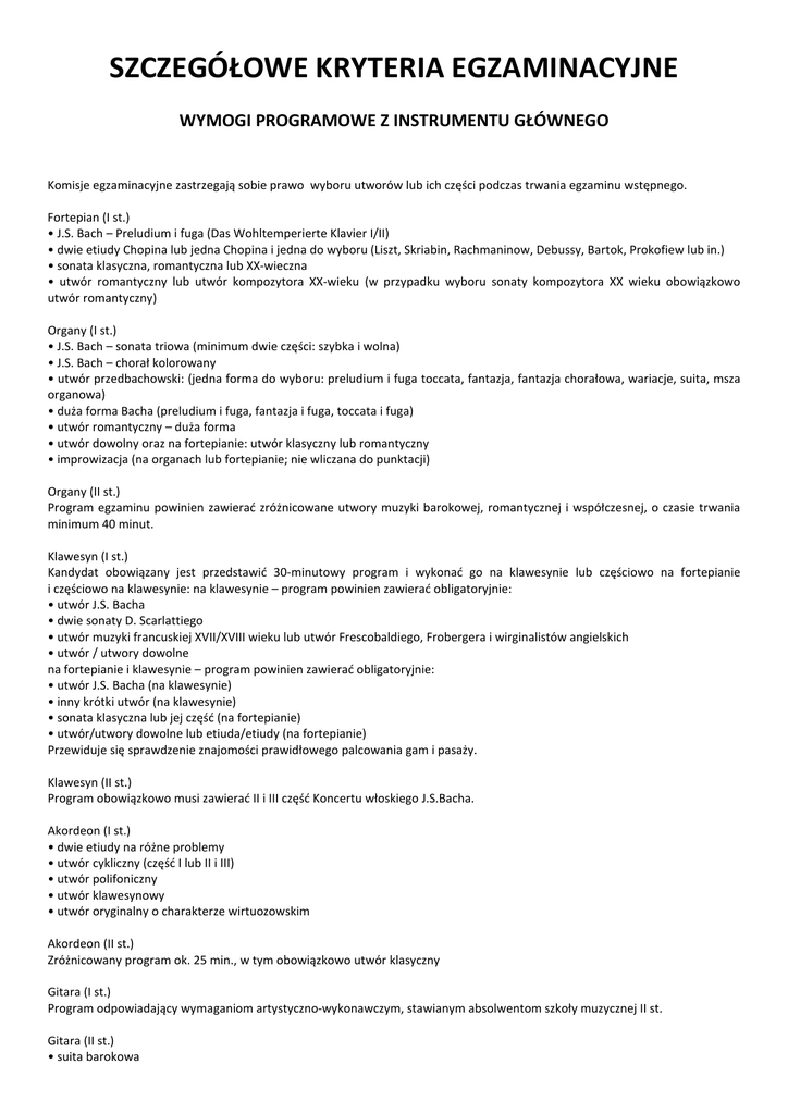 SZCZEGÓŁOWE KRYTERIA EGZAMINACYJNE WYMOGI PROGRAMOWE Z INSTRUMENTU GŁÓWNEGO Komisje egzaminacyjne zastrzegają sobie prawo wyboru utworów lub ich części podczas trwania egzaminu wstępnego. Fortepian (I st.) • J.S. Bach – Preludium i fuga (Das Wohltemperierte Klavier I/II) • dwie etiudy Chopina lub jedna Chopina i jedna do wyboru (Liszt, Skriabin, Rachmaninow, Debussy, Bartok, Prokofiew lub in.) • sonata klasyczna, romantyczna lub XX-wieczna • utwór romantyczny lub utwór kompozytora XX-wieku (w przypadku wyboru sonaty kompozytora XX wieku obowiązkowo utwór romantyczny) Organy (I st.) • J.S. Bach – sonata triowa (minimum dwie części: szybka i wolna) • J.S. Bach – chorał kolorowany • utwór przedbachowski: (jedna forma do wyboru: preludium i fuga toccata, fantazja, fantazja chorałowa, wariacje, suita, msza organowa) • duża forma Bacha (preludium i fuga, fantazja i fuga, toccata i fuga) • utwór romantyczny – duża forma • utwór dowolny oraz na fortepianie: utwór klasyczny lub romantyczny • improwizacja (na organach lub fortepianie; nie wliczana do punktacji) Organy (II st.) Program egzaminu powinien zawierać zróżnicowane utwory muzyki barokowej, romantycznej i współczesnej, o czasie trwania minimum 40 minut. Klawesyn (I st.) Kandydat obowiązany jest przedstawić 30-minutowy program i wykonać go na klawesynie lub częściowo na fortepianie i częściowo na klawesynie: na klawesynie – program powinien zawierać obligatoryjnie: • utwór J.S. Bacha • dwie sonaty D. Scarlattiego • utwór muzyki francuskiej XVII/XVIII wieku lub utwór Frescobaldiego, Frobergera i wirginalistów angielskich • utwór / utwory dowolne na fortepianie i klawesynie – program powinien zawierać obligatoryjnie: • utwór J.S. Bacha (na klawesynie) • inny krótki utwór (na klawesynie) • sonata klasyczna lub jej część (na fortepianie) • utwór/utwory dowolne lub etiuda/etiudy (na fortepianie) Przewiduje się sprawdzenie znajomości prawidłowego palcowania gam i pasaży. Klawesyn (II st.) Program obowiązkowo musi zawierać II i III część Koncertu włoskiego J.S.Bacha. Akordeon (I st.) • dwie etiudy na różne problemy • utwór cykliczny (część I lub II i III) • utwór polifoniczny • utwór klawesynowy • utwór oryginalny o charakterze wirtuozowskim Akordeon (II st.) Zróżnicowany program ok. 25 min., w tym obowiązkowo utwór klasyczny Gitara (I st.) Program odpowiadający wymaganiom artystyczno-wykonawczym, stawianym absolwentom szkoły muzycznej II st. Gitara (II st.) • suita barokowa • cykliczna forma sonaty • forma wariacyjna • utwór dowolny – do wyboru komisji Harfa (I st.) • etiuda (np. Bochsa, Pozzolli, Bach-Grandjany, Posse) • 2 kompozycje z różnych stylów • utwór współczesny Harfa (II st.) • koncert na harfę (np. Dittersdorf, Haendel, Boieldieu, Mozart) • 3 utwory z różnych stylów (w tym jeden wirtuozowski) • utwór współczesny (napisany po 1945 r.) • 3 kadencje utworów orkiestrowych (np. Donizetti Lucia di Lammermoor, Ravel Tzigane, Britten Young Person’s Guide) • ewentualnie muzyka kameralna (akompaniament/instrumenty towarzyszące we własnym zakresie) Skrzypce (I st.) • etiuda • koncert – część I lub II i III • J.S. Bach – dwie kontrastujące ze sobą części Stopień trudności i układ programu również zostaje poddany ocenie komisji. Altówka (I st.) • etiuda • J.S. Bach – preludium z dowolnie wybranej suity, • koncert – część I lub II i III, Stopień trudności i układ programu również zostaje poddany ocenie komisji. Wiolonczela (I st.) • J.S. Bach – preludium z dowolnie wybranej suity wiolonczelowej (oprócz I Suity) lub dwie części • koncert – część I lub II i III • etiuda Stopień trudności i układ programu również zostaje poddany ocenie komisji. Kontrabas (I st.) • sonata – dwie kontrastujące ze sobą części • koncert – część I lub II i III • utwór dowolny Stopień trudności i układ programu również zostaje poddany ocenie komisji. Instrumenty dęte i perkusja (I st.) Program odpowiadający poziomowi egzaminu dyplomowego i egzaminu technicznego szkoły muzycznej II stopnia – do wyboru komisji. Skrzypce barokowe (II st.) Program obejmujący ok. 25 minut muzyki może być wykonany na skrzypcach barokowych lub współczesnych. Obowiązują: • dwie części sonaty lub partity na skrzypce solo J.S. Bacha lub Fantazja G.P. Telemanna • R. Kreutzer – Etiuda nr 35 • J.-M. Leclair – Sonata XII g-moll (z zeszytu II), dwie części • do wyboru: sonata na skrzypce i b.c. kompozytora włoskiego (Vivaldi, Corelli, Veracini, Bonporti, Locatelli i in.) Wiolonczela barokowa (II st.) Przekrojowy program, obejmujący ok. 25 minut muzyki, zawierający utwory od XVII do wczesnego XIX wieku (niekoniecznie w całości), może być wykonany na wiolonczeli barokowej lub współczesnej (wymagane jest użycie barokowego lub klasycznego smyczka). Obowiązują: • jeden utwór z XVII wieku • jedna część z suity J.S. Bacha • sonata barokowa • utwór rokokowy lub klasyczny Uwaga! Istotne jest użycie prawidłowego wydania; utwory z basso continuo powinny być wykonane z akompaniamentem klawesynu lub innego właściwego instrumentu. Wiola da gamba (II st.) Przekrojowy program, obejmujący ok. 25 minut muzyki XVI-XVIII wieku (może zawierać również współczesny utwór na wiolę da gamba), powinien zawierać: • utwór o charakterze dyminucyjnym • utwór solowy bez basso continuo, zawierający wielodźwięki • utwór francuski z basso continuo (Marais, Forqueray i in.) • utwór niemiecki (Buxtehude, Bach, Abel) Muzyka kościelna (I st.) Utwory do wykonania na egzaminie praktycznym: • J.S.Bach – preludium i fuga (lub toccata, fantazja, fantazja i fuga) • J.S.Bach – preludium chorałowe z Orgelbüchlein • utwór romantyczny (cykliczny lub dwa utwory zróżnicowane pod względem charakteru)