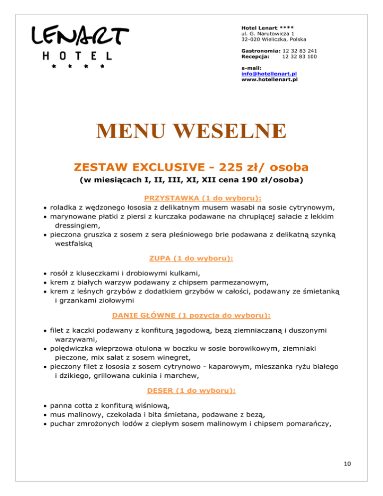 Hotel Lenartt **** ul. G. Narutow wicza 1 32-020 Wielicczka, Polska Gastronomia G a: 12 32 83 24 41 Recepcja: 12 32 83 10 00 e-mail: e info@hotelle enart.pl www.hotelle w enart.pl M NU W MEN WE ESEL LNE E ZEST TAW EXCLU E USIVE - 225 5 zł/ o osoba (w miiesiącach h I, II, II II, XI, XII X cena 190 zł/o osoba) PRZYST TAWKA (1 1 do wyboru): roladk ka z wędzo onego łoso osia z deli katnym musem m was sabi na so sie cytrynowym, maryn nowane płłatki z pierrsi z kurczzaka podaw wane na chrupiącej sałacie z lekkim dres ssingiem, delikatną szynką pieczo ona gruszk ka z sosem m z sera p pleśnioweg go brie pod dawana z d westtfalską ZUPA (1 do wy yboru): rosół z kluseczk kami i drobiowymi k kulkami, krem z białych warzyw podawany z chipsem parmezan nowym, krem z leśnych grzybów z dodatkie em grzybó ów w całoś ści, podaw wany ze śm mietanką i grz zankami ziiołowymi E (1 pozy ycja do wy yboru): DANIE GŁÓWNE filet z kaczki po odawany z konfiturą ą jagodową ą, bezą zie emniaczan ną i duszon nymi warz zywami, polędwiczka wie eprzowa otulona o w boczku w sosie boro owikowym m, ziemniak ki x sałat z so osem wine egret, pieczone, mix ony filet z łososia z sosem cyttrynowo - kaparowy ym, miesza anka ryżu białego pieczo i dzikiego, grilllowana cu ukinia i ma archew, DESER R (1 do wy yboru): panna a cotta z konfiturą k wiśniową, w mus m malinowy, czekolada a i bita śm mietana, po odawane z bezą, pucha ar zmrożon nych lodów w z ciepłym m sosem malinowym m m i chipse m pomara ańczy, 1 10 Hotel Lenartt **** ul. G. Narutow wicza 1 32-020 Wielicczka, Polska Gastronomia G a: 12 32 83 24 41 Recepcja: 12 32 83 10 00 e-mail: e info@hotelle enart.pl www.hotelle w enart.pl II DANIE D CI IEPŁE (1 do wybor ru): rolada a wieprzow wa faszero owana warrzywami, kluski k śląs skie z mixe em sałat z sosem jogu urtowym, schab b z dzika z żurawiną ą z ziemnia akami piec czonymi i groszkiem g m cukrowym m, befszttyk wołow wy z smażo onymi piecczarkami i cebulką podawany p z ziemniaczanym pure ee i sałatką z maryn nowanych pikli z zieloną dekorracją, III D DANIE CIEPŁE (serrwowane lub w bu ufecie jed dno danie e do wybo oru): boeuff strogonow, wołow wina po bu urgundzku z warzyw wami, szynk ka duszona a z borowikami, DANIE CIE EPŁE: IV D barszcz czerwony z krokietem, żurek k na wędzo once z jajk kiem z białłą kiełbasą ą, BUFET ZIMNY ( (uzupełniany bez limitu): l Wędliny staropo olskie: ynka, - szy -bale eron, - sallami - kie ełbasa wiejjska, - kabanos, a pieczone: Mięsa - ind dyk z more elą, - sch hab pieczo ony w tymianku, - karczek z czosnkiem, - pasztet z żurawiną, sery ż żółte i pleś śniowe z bakaliami, b winogronami i paluszkami grrissini (des ski serów na g granicie), 1 11 Hotel Lenartt **** ul. G. Narutow wicza 1 32-020 Wielicczka, Polska Gastronomia G a: 12 32 83 24 41 Recepcja: 12 32 83 10 00 e-mail: e info@hotelle enart.pl www.hotelle w enart.pl śledziie pod pierrzynką, śledziie po holen ndersku, ryba n na ostro z sosem z chili, tymba aliki drobio owe, łosoś w galarec cie w całoś ści podany y, mozza arella z po omidoramii, szynk ka parmeń ńska z melonem, sałatk ka jarzyno owa, sałatk ka grecka,, sałatk ka cezar z grillowany ym kurcza akiem, wybór marynow wanych pik kli: eczarki, - pie - papryka, - ogórki, pieczy ywo, masło o, sos ta atarski, sos cu umberland d, sos ch hrzanowy BUFET SŁODKI (p patery na a każdym stoliku):: ciasta a i owoce (po ( 3 rodz zaje podaw wane na pa aterach na a każdym stoliku), domo owe ciasta (5 rodzajów) słodkie babeczk ki, he ciastecz zka z ziarn nami, kruch Mini d desery: - pta asie mlecz zko, - mu us mocca, - mu us truskaw wkowy, owoce e filetowan ne i w cało ości (5 rod dzajów), 12
