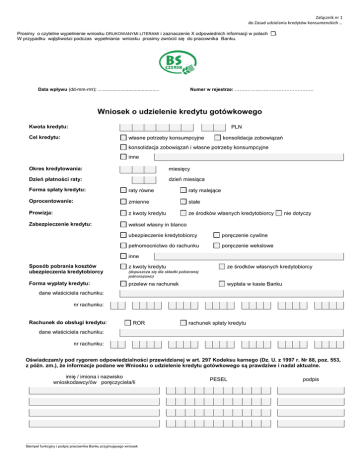 Załącznik nr 1 do Zasad udzielania kredytów konsumenckich … Prosimy o czytelne wypełnienie wniosku DRUKOWANYMI LITERAMI i zaznaczenie X odpowiednich informacji w polach W przypadku wątpliwości podczas wypełniania wniosku prosimy zwrócić się do pracownika Banku. Data wpływu (dd-mm-rrrr): ….......................................... . Numer w rejestrze: …………………………………………. Wniosek o udzielenie kredytu gotówkowego Kwota kredytu: PLN , własne potrzeby konsumpcyjne Cel kredytu: konsolidacja zobowiązań konsolidacja zobowiązań i własne potrzeby konsumpcyjne inne Okres kredytowania: miesięcy Dzień płatności raty: dzień miesiąca Forma spłaty kredytu: raty równe raty malejące Oprocentowanie: zmienne stałe Prowizja: z kwoty kredytu ze środków własnych kredytobiorcy Zabezpieczenie kredytu: weksel własny in blanco ubezpieczenie kredytobiorcy poręczenie cywilne pełnomocnictwo do rachunku poręczenie wekslowe nie dotyczy inne Sposób pobrania kosztów ubezpieczenia kredytobiorcy Forma wypłaty kredytu: ze środków własnych kredytobiorcy z kwoty kredytu (dopuszcza się dla składki pobieranej jednorazowo) przelew na rachunek wypłata w kasie Banku dane właściciela rachunku: nr rachunku: Rachunek do obsługi kredytu: ROR rachunek spłaty kredytu dane właściciela rachunku: nr rachunku: Oświadczam/y pod rygorem odpowiedzialności przewidzianej w art. 297 Kodeksu karnego (Dz. U. z 1997 r. Nr 88, poz. 553, z późn. zm.), że informacje podane we Wniosku o udzielenie kredytu gotówkowego są prawdziwe i nadal aktualne. imię / imiona i nazwisko wnioskodawcy/ów poręczyciela/li …………………………………………………………………………… Stempel funkcyjny i podpis pracownika Banku przyjmującego wniosek PESEL podpis
