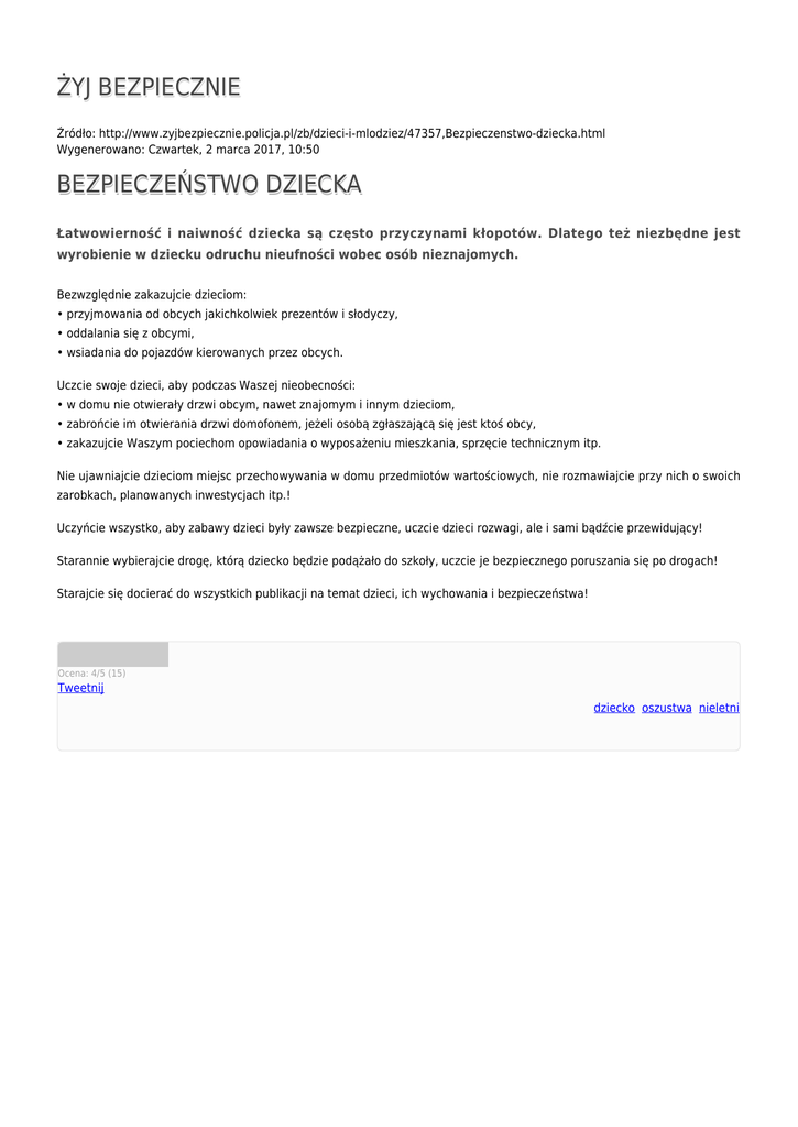 ŻYJ BEZPIECZNIE Źródło: http://www.zyjbezpiecznie.policja.pl/zb/dzieci-i-mlodziez/47357,Bezpieczenstwo-dziecka.html Wygenerowano: Czwartek, 2 marca 2017, 10:50 BEZPIECZEŃSTWO DZIECKA Łatwowierność i naiwność dziecka są często przyczynami kłopotów. Dlatego też niezbędne jest wyrobienie w dziecku odruchu nieufności wobec osób nieznajomych. Bezwzględnie zakazujcie dzieciom: • przyjmowania od obcych jakichkolwiek prezentów i słodyczy, • oddalania się z obcymi, • wsiadania do pojazdów kierowanych przez obcych. Uczcie swoje dzieci, aby podczas Waszej nieobecności: • w domu nie otwierały drzwi obcym, nawet znajomym i innym dzieciom, • zabrońcie im otwierania drzwi domofonem, jeżeli osobą zgłaszającą się jest ktoś obcy, • zakazujcie Waszym pociechom opowiadania o wyposażeniu mieszkania, sprzęcie technicznym itp. Nie ujawniajcie dzieciom miejsc przechowywania w domu przedmiotów wartościowych, nie rozmawiajcie przy nich o swoich zarobkach, planowanych inwestycjach itp.! Uczyńcie wszystko, aby zabawy dzieci były zawsze bezpieczne, uczcie dzieci rozwagi, ale i sami bądźcie przewidujący! Starannie wybierajcie drogę, którą dziecko będzie podążało do szkoły, uczcie je bezpiecznego poruszania się po drogach! Starajcie się docierać do wszystkich publikacji na temat dzieci, ich wychowania i bezpieczeństwa! Ocena: 4/5 (15) Tweetnij dziecko, oszustwa, nieletni