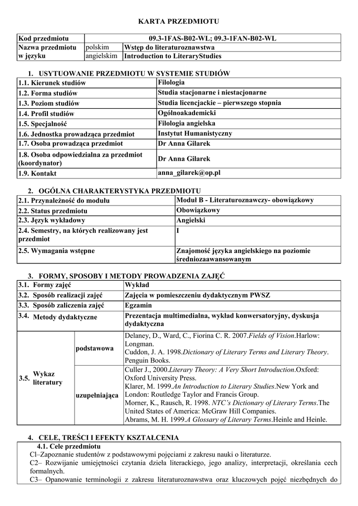KARTA PRZEDMIOTU Kod przedmiotu Nazwa przedmiotu w języku 09.3-1FAS-B02-WL; 09.3-1FAN-B02-WL polskim Wstęp do literaturoznawstwa angielskim Introduction to LiteraryStudies 1. USYTUOWANIE PRZEDMIOTU W SYSTEMIE STUDIÓW Filologia 1.1. Kierunek studiów Studia stacjonarne i niestacjonarne 1.2. Forma studiów Studia licencjackie – pierwszego stopnia 1.3. Poziom studiów Ogólnoakademicki 1.4. Profil studiów Filologia angielska 1.5. Specjalność Instytut Humanistyczny 1.6. Jednostka prowadząca przedmiot 1.7. Osoba prowadząca przedmiot Dr Anna Gilarek 1.8. Osoba odpowiedzialna za przedmiot (koordynator) 1.9. Kontakt Dr Anna Gilarek [email protected] 2. OGÓLNA CHARAKTERYSTYKA PRZEDMIOTU Moduł B - Literaturoznawczy- obowiązkowy 2.1. Przynależność do modułu Obowiązkowy 2.2. Status przedmiotu 2.3. Język wykładowy Angielski 2.4. Semestry, na których realizowany jest I przedmiot 2.5. Wymagania wstępne Znajomość języka angielskiego na poziomie średniozaawansowanym 3. FORMY, SPOSOBY I METODY PROWADZENIA ZAJĘĆ 3.1. Formy zajęć Wykład 3.2. Sposób realizacji zajęć Zajęcia w pomieszczeniu dydaktycznym PWSZ 3.3. Sposób zaliczenia zajęć Egzamin 3.4. Metody dydaktyczne Prezentacja multimedialna, wykład konwersatoryjny, dyskusja dydaktyczna 3.5. Wykaz literatury Delaney, D., Ward, C., Fiorina C. R. 2007.Fields of Vision.Harlow: Longman. podstawowa Cuddon, J. A. 1998.Dictionary of Literary Terms and Literary Theory. Penguin Books. Culler J., 2000.Literary Theory: A Very Short Introduction.Oxford: Oxford University Press. Klarer, M. 1999.An Introduction to Literary Studies.New York and uzupełniająca London: Routledge Taylor and Francis Group. Morner, K., Rausch, R. 1998. NTC’s Dictionary of Literary Terms.The United States of America: McGraw Hill Companies. Abrams, M. H. 1999.A Glossary of Literary Terms.Heinle and Heinle. 4. CELE, TREŚCI I EFEKTY KSZTAŁCENIA 4.1. Cele przedmiotu Cl–Zapoznanie studentów z podstawowymi pojęciami z zakresu nauki o literaturze. C2– Rozwijanie umiejętności czytania dzieła literackiego, jego analizy, interpretacji, określania cech formalnych. C3– Opanowanie terminologii z zakresu literaturoznawstwa oraz kluczowych pojęć niezbędnych do analizy tekstu i opisu dzieła literackiego. 4.2. Treści programowe 1. Funkcje dzieła literackiego, różnica między tekstem literackim a nie-literackim, podział na rodzaje i gatunki literackie. 2. Liryka (rytm, rodzaje rymów, wiersz biały, podmiot liryczny, środki stylistyczne: metafora, personifikacja, hiperbola, onomatopeja, oksymoron, archaizmy, porównania, itd.). 3. Epika (rodzaje narracji, budowa świata przedstawionego, bohaterowie, konstrukcja postaci, symbole, rodzaje powieści, opowiadanie, nowela, bajka, fabuła, wątek, motyw, piramida Freytaga i elementy akcji itd.). 4. Dramat(podstawowe gatunki dramatyczne: komedia i tragedia, tekst główny i didaskalia, gatunki dramatyczne itd.). 5. Przegląd najważniejszych kierunków literaturoznawstwa XX wieku. 4.3. Efekty kształcenia kod Student, który zaliczył przedmiot w zakresie WIEDZY: W01 zna podstawowe tematy, pojęcia i zagadnienia dotyczące badań literaturoznawczych W02 W03 U01 U02 U03 K01 K02 4.4. Odniesienie do efektów kształcenia dla kierunku dla obszaru FIL1A_W02 H1A_W02 zna treść, formę i funkcję podstawowej terminologii z zakresu FIL1A_W04 literaturoznawstwa zna podstawowe metody badawcze i interpretacyjne mające zastosowanie do tekstów literackich w języku angielskim FIL1A_W10 w zakresie UMIEJĘTNOŚCI: posługuje się głównymi teoriami z zakresu literatury, zna główne orientacje w krytyce literackiej potrafi rozpoznawać i oceniać procesy i zjawiska literackie na podstawie uzyskanej wiedzy; potrafi zinterpretować utwór literacki oraz potrafi scharakteryzować omawiany gatunek ma umiejętności językowe w zakresie literaturoznawstwa oraz potrafi wypowiadać się o tej dziedzinie w języku angielskim oraz w języku polskim w zakresie KOMPETENCJI SPOŁECZNYCH: efektywnie organizuje pracę swoją oraz innych i potrafi krytycznie ocenić jej priorytety oraz stopień zaawansowania ma świadomość wartości dziedzictwa kulturowego angielskiego obszaru językowego, docenia anglojęzyczna spuściznę literacką H1A_W07 FIL1A_U07 H1A_U04 FIL1A_U04 H1A_U02 FIL1A_U14 H1A_U10 FIL1A_K06 H1A_K03 FIL1A_K08 H1A_K05 Metody weryfikacji efektów kształcenia Forma oceny Efekt Egzamin Egzamin Kolokwiu Zadania do Referat kształcenia ustny pisemny Projekt m wykonania Sprawozdanie W01 W02 W03 U01 U02 U03 K01 FIL1A_W02 +++ +++ +++ +++ +++ +++ Dyskusje ++ + + ++ ++ ++ Inne K02 ++ 5. BILANS PUNKTÓW ECTS - NAKŁAD PRACY STUDENTA Kategoria Udział w zajęciach dydaktycznych określonych w planie studiów Samodzielne przygotowanie do zajęć Wykonanie powierzonych zadań Udział w konsultacjach Przygotowanie do egzaminu/zdawanie egzaminu Obciążenie związane z zajęciami praktycznymi Obciążenie związane z zajęciami wymagającymi bezpośredniego udziału nauczycieli akademickich Sumaryczne obciążenie pracą studenta PUNKTY ECTS za przedmiot Obciążenie studenta Studia Studia stacjonarne niestacjonarne 30 20 15 25 15 15 3 3 15 15 33 23 78 3 78 3