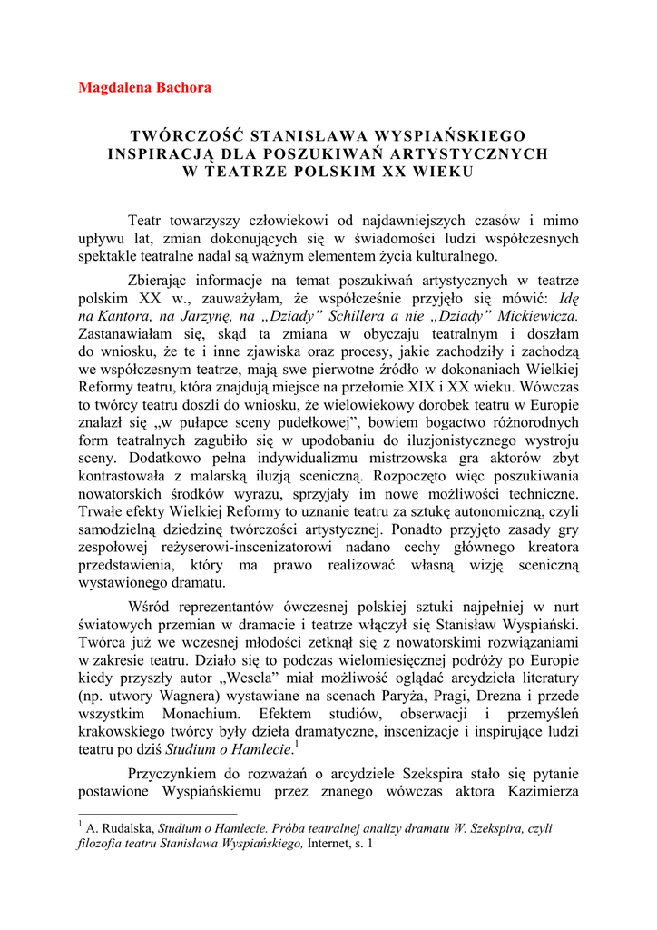 Magdalena Bachora TWÓRCZOŚĆ STANISŁAWA WYSPIAŃSKIEGO INSPIRACJĄ DLA POSZUKIWAŃ ARTYSTYCZNYCH W TEATRZE POLSKIM XX WIEKU Teatr towarzyszy człowiekowi od najdawniejszych czasów i mimo upływu lat, zmian dokonujących się w świadomości ludzi współczesnych spektakle teatralne nadal są waŜnym elementem Ŝycia kulturalnego. Zbierając informacje na temat poszukiwań artystycznych w teatrze polskim XX w., zauwaŜyłam, Ŝe współcześnie przyjęło się mówić: Idę na Kantora, na Jarzynę, na „Dziady” Schillera a nie „Dziady” Mickiewicza. Zastanawiałam się, skąd ta zmiana w obyczaju teatralnym i doszłam do wniosku, Ŝe te i inne zjawiska oraz procesy, jakie zachodziły i zachodzą we współczesnym teatrze, mają swe pierwotne źródło w dokonaniach Wielkiej Reformy teatru, która znajdują miejsce na przełomie XIX i XX wieku. Wówczas to twórcy teatru doszli do wniosku, Ŝe wielowiekowy dorobek teatru w Europie znalazł się „w pułapce sceny pudełkowej”, bowiem bogactwo róŜnorodnych form teatralnych zagubiło się w upodobaniu do iluzjonistycznego wystroju sceny. Dodatkowo pełna indywidualizmu mistrzowska gra aktorów zbyt kontrastowała z malarską iluzją sceniczną. Rozpoczęto więc poszukiwania nowatorskich środków wyrazu, sprzyjały im nowe moŜliwości techniczne. Trwałe efekty Wielkiej Reformy to uznanie teatru za sztukę autonomiczną, czyli samodzielną dziedzinę twórczości artystycznej. Ponadto przyjęto zasady gry zespołowej reŜyserowi-inscenizatorowi nadano cechy głównego kreatora przedstawienia, który ma prawo realizować własną wizję sceniczną wystawionego dramatu. Wśród reprezentantów ówczesnej polskiej sztuki najpełniej w nurt światowych przemian w dramacie i teatrze włączył się Stanisław Wyspiański. Twórca juŜ we wczesnej młodości zetknął się z nowatorskimi rozwiązaniami w zakresie teatru. Działo się to podczas wielomiesięcznej podróŜy po Europie kiedy przyszły autor „Wesela” miał moŜliwość oglądać arcydzieła literatury (np. utwory Wagnera) wystawiane na scenach ParyŜa, Pragi, Drezna i przede wszystkim Monachium. Efektem studiów, obserwacji i przemyśleń krakowskiego twórcy były dzieła dramatyczne, inscenizacje i inspirujące ludzi teatru po dziś Studium o Hamlecie.1 Przyczynkiem do rozwaŜań o arcydziele Szekspira stało się pytanie postawione Wyspiańskiemu przez znanego wówczas aktora Kazimierza 1 A. Rudalska, Studium o Hamlecie. Próba teatralnej analizy dramatu W. Szekspira, czyli filozofia teatru Stanisława Wyspiańskiego, Internet, s. 1 Kamińskiego: „ Jak grać postać księcia duńskiego?”. Starając się rozstrzygnąć powyŜszy problem, autor Wesela podjął próbę odpowiedzi na pytanie o istotę teatru w ogóle.2 WaŜna dla zrozumienia poglądów autora jest juŜ sama dedykacja otwierająca Studium o Hamlecie: AKTOROM POLSKIM OSOBOM DZIAŁAJĄCYM NA SCENIE NA DRODZE PRZEZ LABIRYNT ZWANY TEATR KTÓREGO PRZEZNACZENIEM JAK DAWNIEJ TAK I TERAZ BYŁO I JEST SŁUśYĆ NIEJAKO ZA ZWIERCIADŁO NATURZE POKAZUJĄC CNOCIE WŁASNEJ JEJ RYSY ZŁOŚCI śYWEJ JEJ OBRAZ A ŚWIATU I DUCHOWI WIEKU POSTAĆ ICH I PIĘTNO3 Rozpoczęcie pracy nad Hamletem od wyŜej wymienionych słów świadczy o tym, Ŝe poeta – inscenizator jest przekonany co do kluczowej roli aktora jako przewodnika, który prowadzi przez labirynt zwany teatr i umoŜliwia jego poznanie. Jednocześnie między aktorem i postacią oraz Ŝyciem i sceną istnieje tylko bardzo subtelna granica. Dowodem na tę tezę uczynił Wyspiański samego Szekspira, gdyŜ zdaniem młodopolskiego twórcy dramaturg elŜbietański Ŝył w teatrze i dla teatru. A to oznacza, Ŝe dla Szekspira teatr i Ŝycie były toŜsame i nierozerwalne. W dalszej części swojego dzieła – powszechnie uznawanego za teatralny manifest artystyczny – autor kieruje swoje rozwaŜania ku poszczególnym znakom teatru, choć wydają się one podrzędne wobec podstawowej roli sceny: dąŜeniu do ukazania prawdy o człowieku i otaczającym go świecie. Stąd wyznanie, Ŝe i aktora, i autora obchodziła tragedia, dramat ich obchodził, los ludzi, los ludzi, i to tych ludzi, o których mówiła tragedia. – Ludzie ci albo rodzili się z legendy i powieści, albo rodzili się z przypomnień tych artystów. 2 3 tamŜe, s. 1 St. Wyspiański, Hamlet, oprac. M. Prussak, Kraków 1976, s. 3 Stawali się Ŝywi i mieli swoją wolę. Ich wola była wszystkim. Scena słuŜyła, aby ich pokazać. Do tego jest scena.4 PowyŜszy fragment jest sugestią, postulatem naturalności w sposobie przygotowania roli, a w konsekwencji w sposobie poprowadzenia akcji. Autentyzm postaci zaciera granicę między Ŝyciem a sceną. Wyspiański ujął tę myśl w niezwykle prostych słowach zapoŜyczonych od Hamleta: Przeczytaj mi ten ustęp, jak ci go przepowiedziałem.5 Kolejnym waŜnym elementem rozwaŜań twórcy są kwestie związane z dekoracjami, scenografią spektaklu. Wyspiański jest przekonany, Ŝe Szekspira rzeczywiście grać by moŜna w jakichkolwiek szmatach, to jednak on sam miał co innego na myśli [...]. Być moŜe, Ŝe na scenie swojej, w swoim teatrzyku dekoracje miał skromne, bardzo skromne; zatem wiedział o tym i tam wiedział, Ŝe niczego nie znajdzie. Tam teŜ niczego nie szukał.6 Od stwierdzeń dotyczących dekoracji, które uznał za drugorzędne, ale jednak niezwykle istotne, autor Wyzwolenia przeszedł do złoŜonych zagadnień związanych z przestrzenią sceniczną. Wyspiański uznał, iŜ Szekspir ilekroć przedstawiał, pisząc: co się dzieje, to miał oczywiście przed oczyma teren, gdzie się to dzieje. I dlatego takie rzeczy jak: drzwi, okna, w ogóle plan i podział izb zamku i pałacu był w zgodzie z rzeczywistą architekturą i logiczną rzeczywistą budową, która gdzieś istniała. [...] Stąd Ŝadnych bałamuctw nie ma w jego dramacie. śadnych bałamuctw sytuacyjnych ani Ŝadnych, które by były w niezgodzie z raz obmyślanym teren