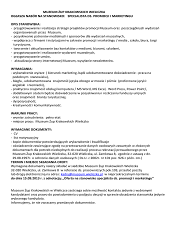 MUZEUM ŻUP KRAKOWSKICH WIELICZKA OGŁASZA NABÓR NA STANOWISKO: SPECJALISTA DS. PROMOCJI I MARKETINGU OPIS STANOWISKA: - przygotowywanie i realizacja strategii projektów promocji Muzeum oraz poszczególnych wydarzeń organizowanych przez Muzeum, - pozyskiwanie patronów medialnych i sponsorów dla wydarzeń muzealnych, - współpraca z firmami i instytucjami w zakresie promocji i marketingu / media , szkoły, biura, targi turystyczne, - tworzenie i aktualizowanie baz kontaktów z mediami, biurami, szkołami, - przygotowywanie i realizowanie wydarzeń muzealnych, - przygotowywanie umów, - aktualizacja strony internetowej Muzeum, wysyłanie newsletterów. WYMAGANIA: - wykształcenie wyższe ( kierunek marketing, bądź udokumentowane doświadczenie - praca na podobnym stanowisku), - biegła , udokumentowana znajomość języka obcego w mowie i piśmie (preferowne języki: angielski i niemiecki), - praktyczna znajomość obsługi komputera / MS Word, MS Excel, Word Press, Power Point/, - dodatkowym atutem będzie doświadczenie w pozyskiwaniu i rozliczaniu funduszy unijnych oraz znajomość branży turystycznej, - dyspozycyjność, - kreatywność i komunikatywność. WARUNKI PRACY: - wymiar zatrudnienia: pełny etat - miejsce pracy: Muzeum Żup Krakowskich Wieliczka WYMAGANE DOKUMENTY: - CV - list motywacyjny - kopie dokumentów potwierdzających wykształcenie i kwalifikacje - oświadczenie zawierające zgodę na przetwarzanie danych osobowych zawartych w złożonych dokumentach dla potrzeb niezbędnych do realizacji procesu rekrutacji prowadzonego przez Muzeum Żup Krakowskich Wieliczka, 32-020 Wieliczka, ul. Zamkowa 8, zgodnie z ustawą z dn. 29.08.1997r. o ochronie danych osobowych ( Dz.U. z 2002r. nr 101 poz. 926 z późn. zm.) TERMIN I MIEJSCE SKŁADANIA OFERT: Wymagane dokumenty należy składać w siedzibie Muzeum Żup Krakowskich Wieliczka 32-020 Wieliczka, ul. Zamkowa 8 w referacie ds. pracowniczych pok.103, przesłać pocztą lub drogą elektroniczną na adres: [email protected] w nieprzekraczalnym terminie do dnia 15.09.2013 r. z adnotacją: „Oferta na stanowisko specjalista ds. promocji i marketingu” Muzeum Żup Krakowskich w Wieliczce zastrzega sobie możliwość kontaktu jedynie z wybranymi kandydatami oraz prawo do powiadomienia o podjęciu decyzji w sprawie obsadzenia stanowiska jedynie wybranego kandydata. Informujemy, że nie zwracamy przesłanych dokumentów.